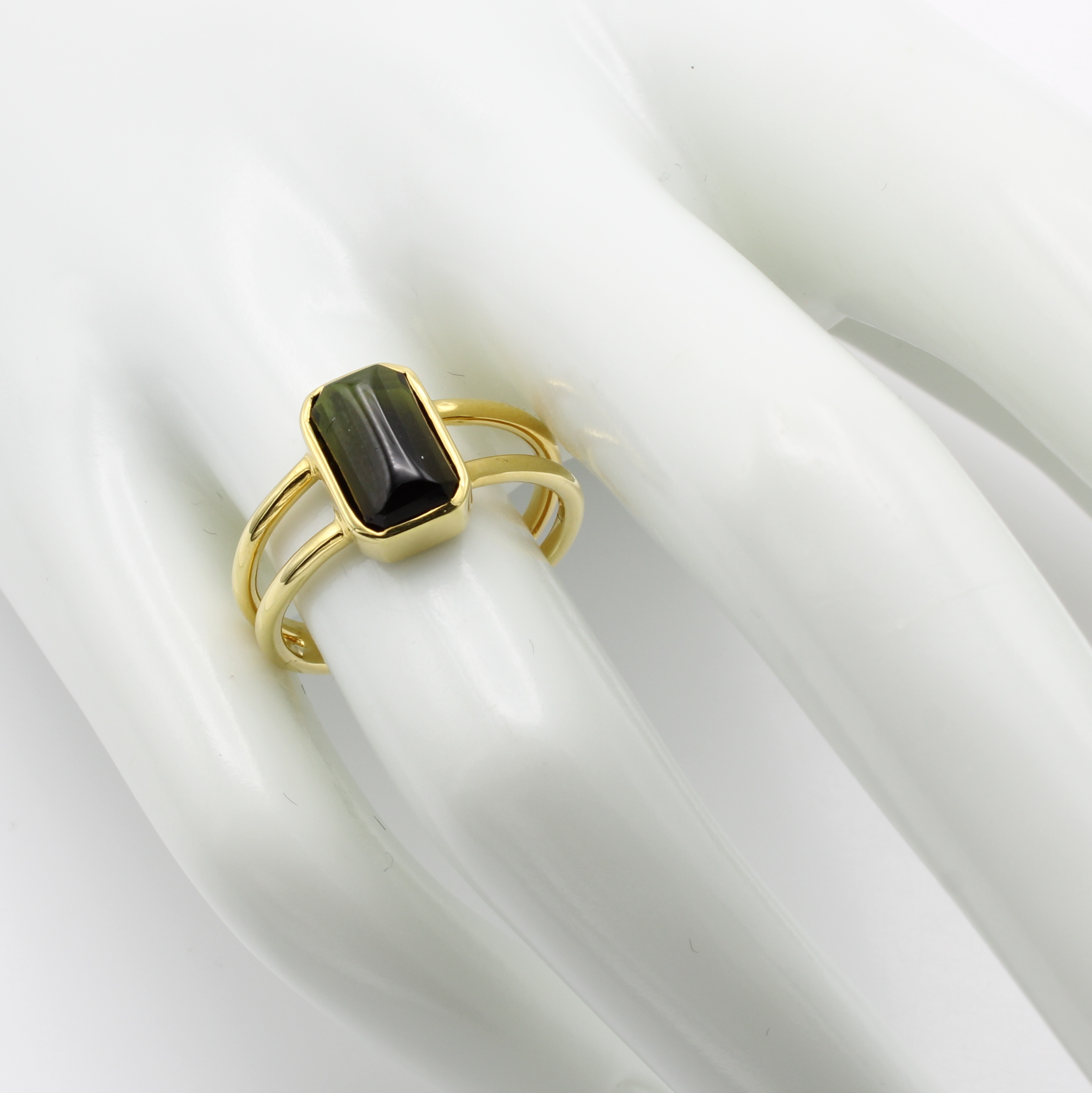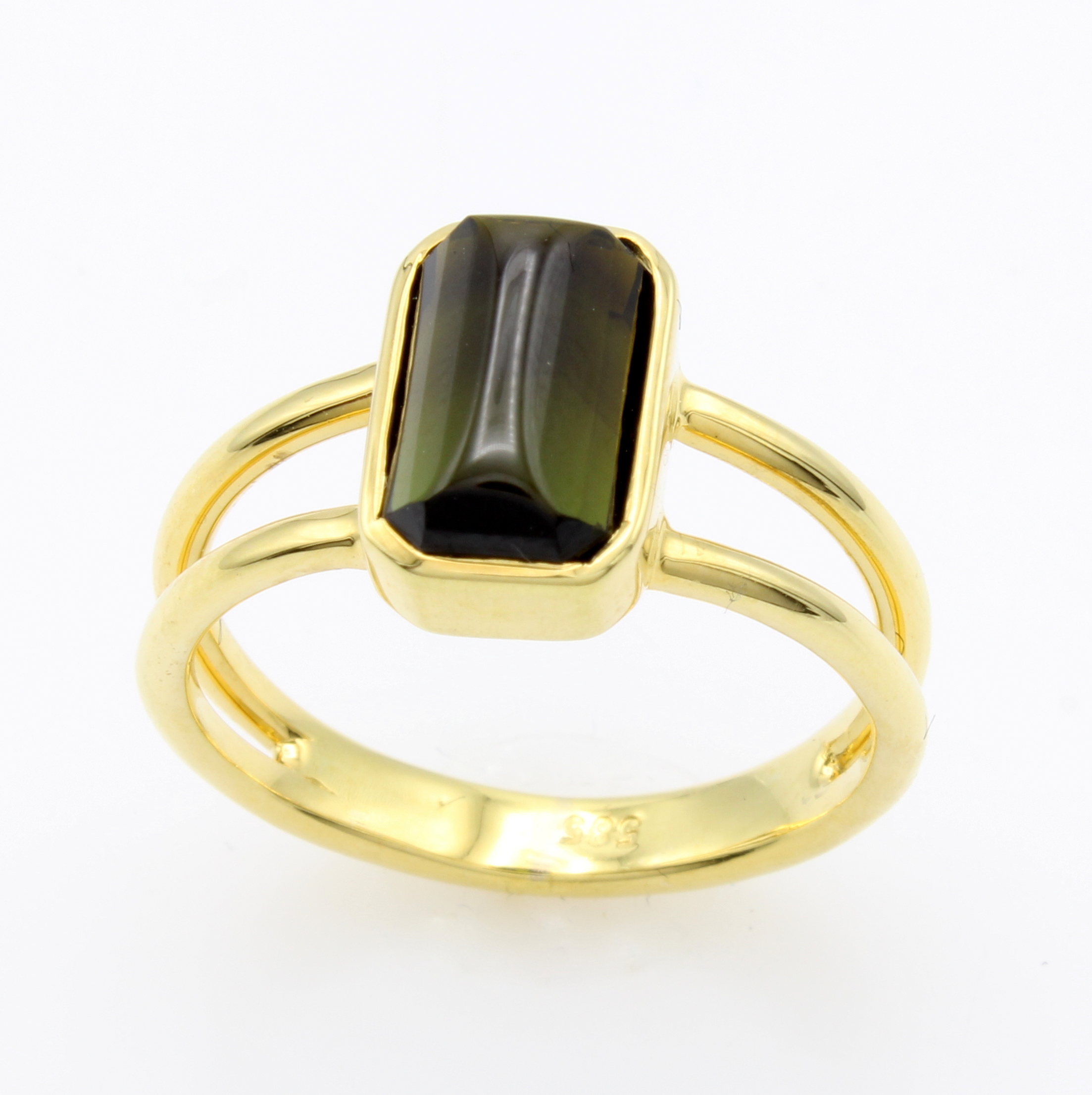 Ring mit Turmalin, GG 585/000, l. spitz zulaufender, grüner Turmalincabochon ca. 2.9 ct, 2 rhg. Optik, RW ca. 58 Schätzpreis: 1500, - EUR