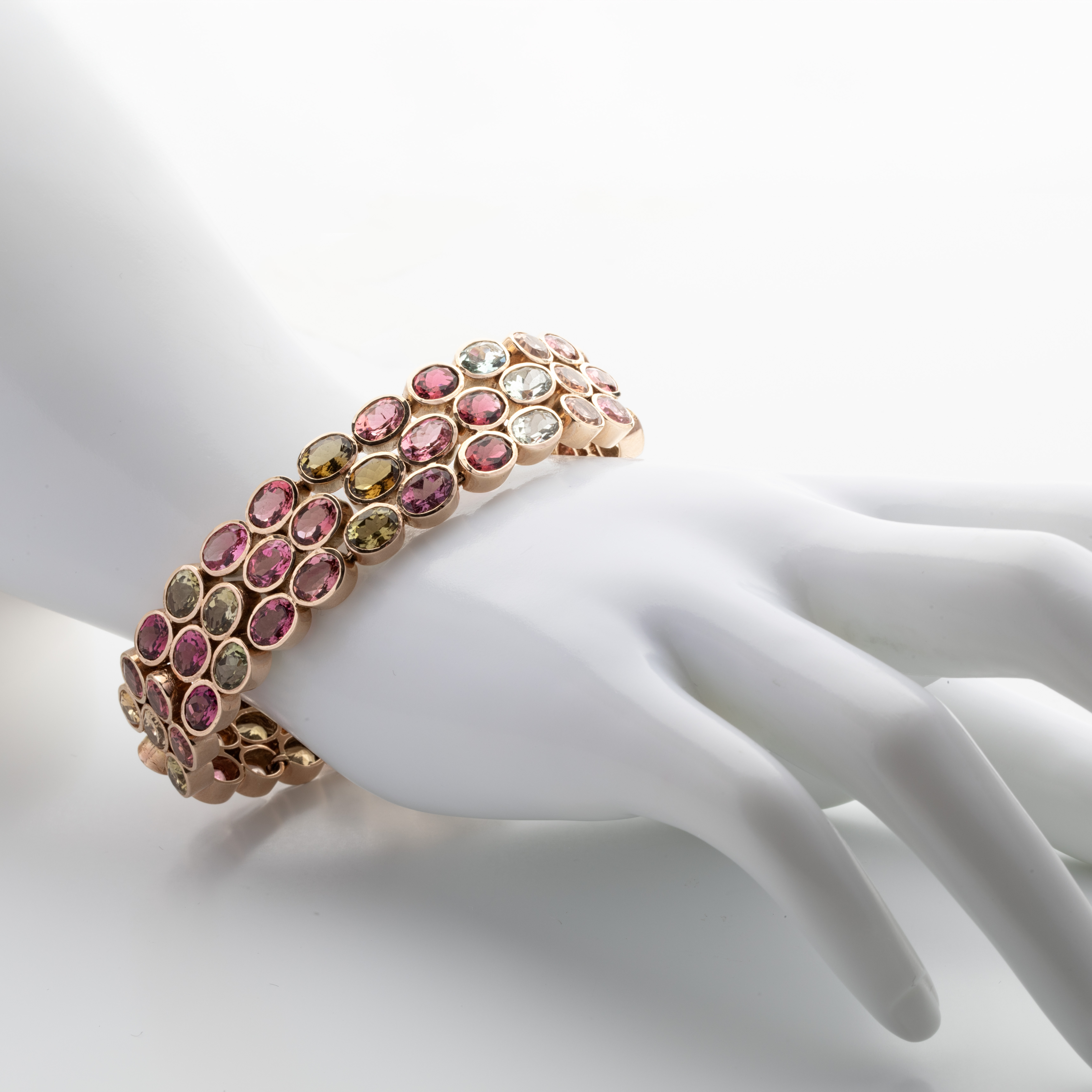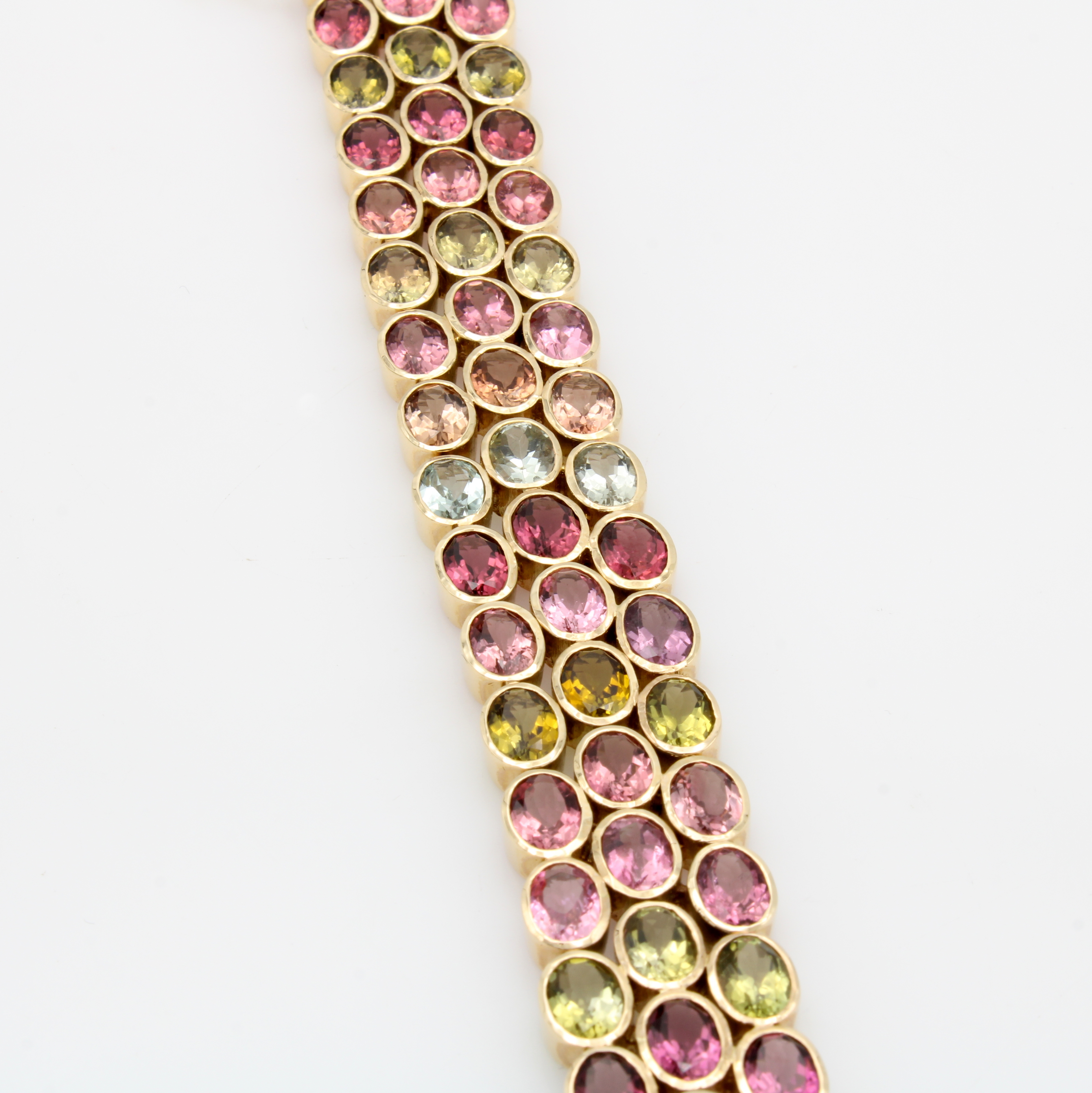 Armband mit Turmalinen, GG 585/000, ovale Turmaline in versch. Farben zus. ca. 55 ct, 3-rhg. Optik, Kastenschl. m. doppelter Sicherheitsacht, Gesamtgew. ca. 66 g, L. ca. 19 cm Schätzpreis: 17000, - EUR
