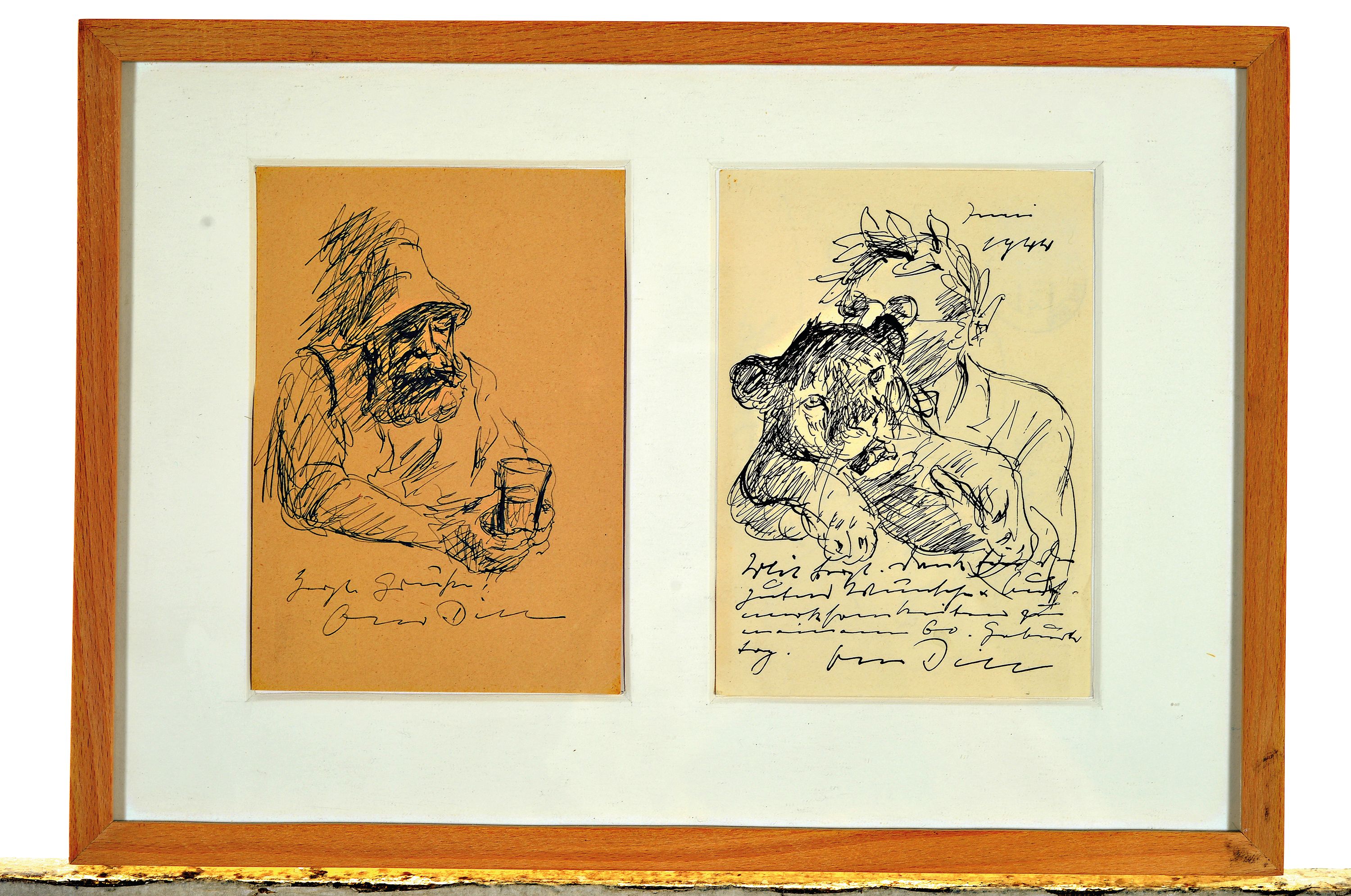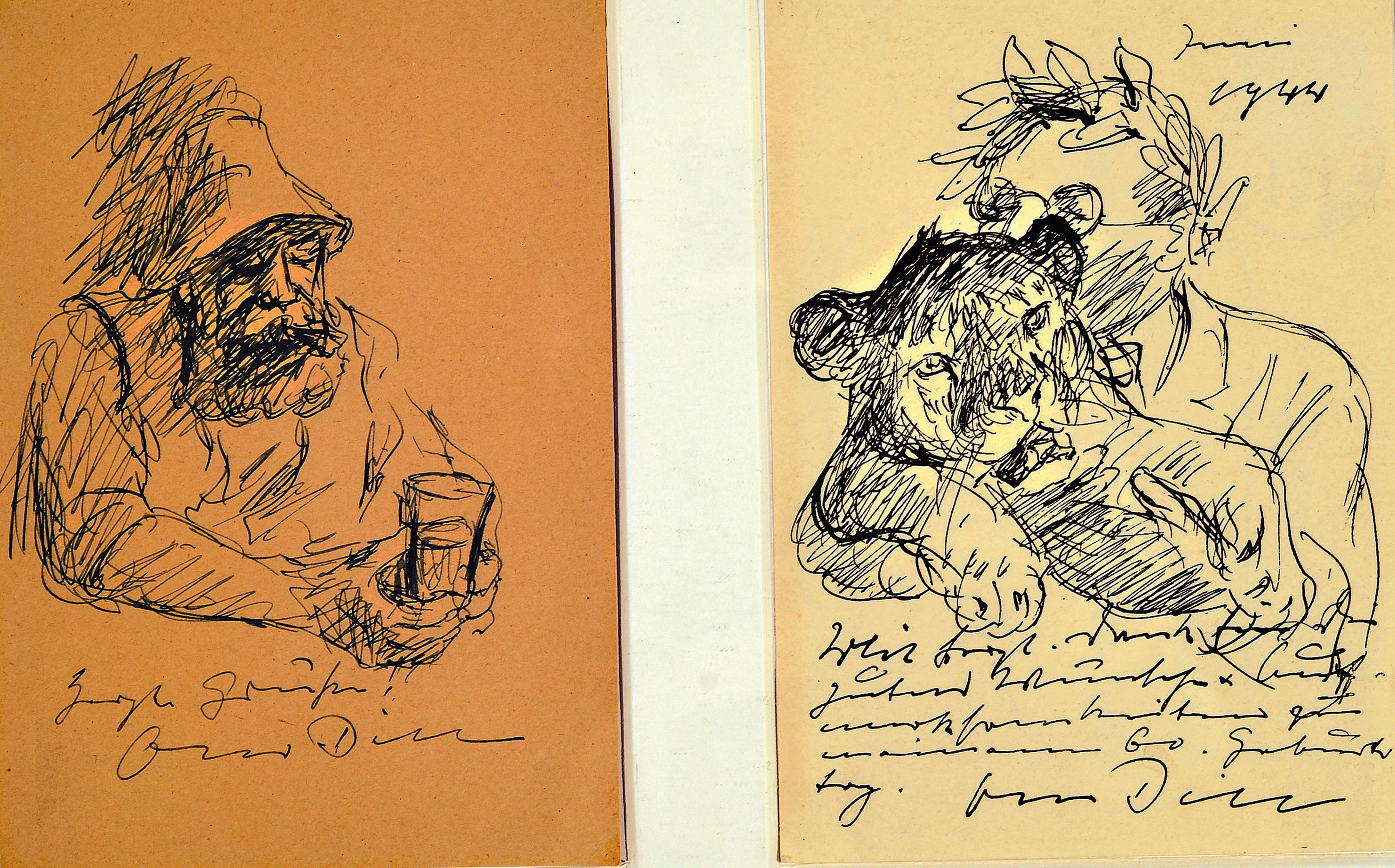 Otto Dill,1884 Neustadt - 1957 Bad Dürkheim, Skizze, Weintrinker, ca. 14.5 x 10 cm, handsigniert, zweites Blatt Litho, Gesamtmaß ca. 34 x 23.5 cm