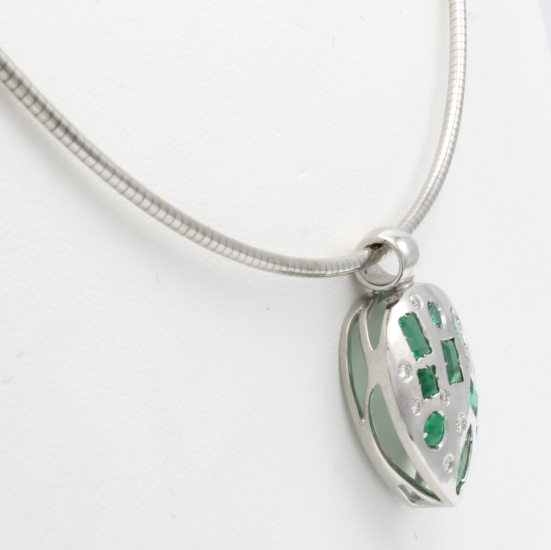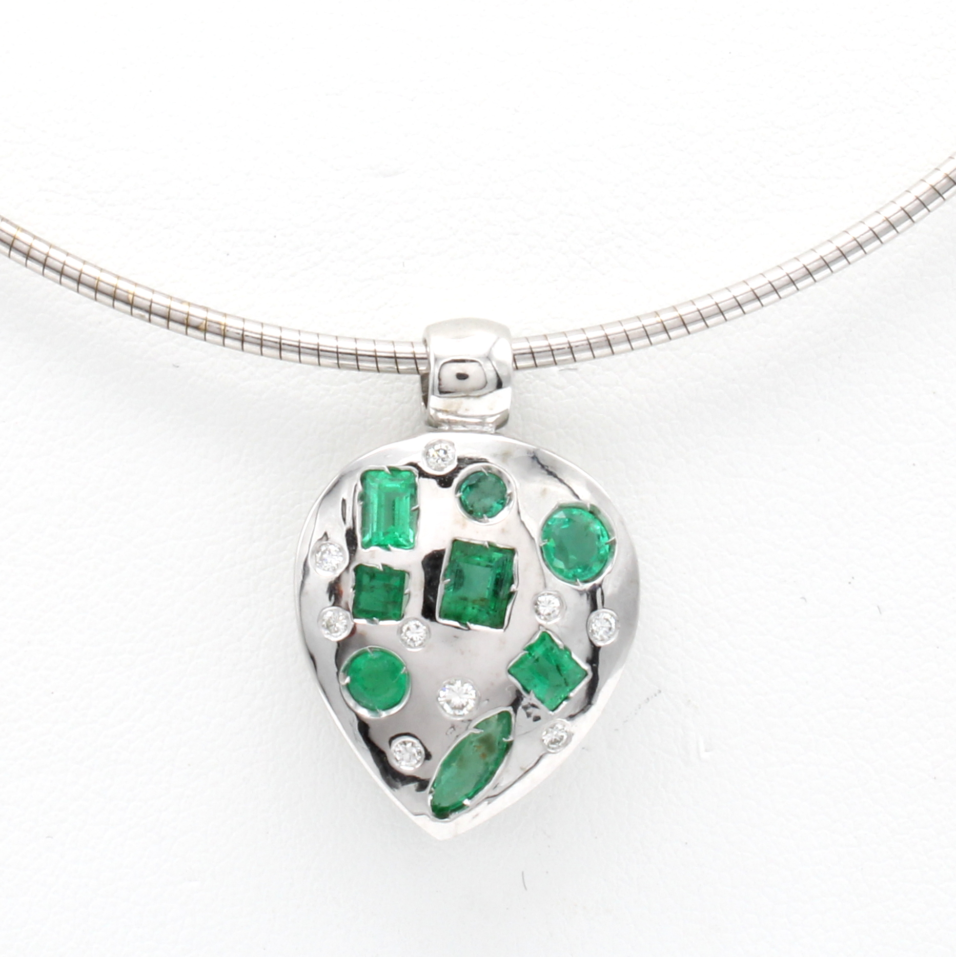 Anhänger mit Smaragden und Brillanten an Omegareif, WG 585/000, Tropfenform, Smaragde in versch. Schliffarten zus. ca. 1.50 ct, Brill. zus. ca. 0.13 ct get.Weiß-get./si, L. ca. 45 cm Schätzpreis: 6300, - EUR