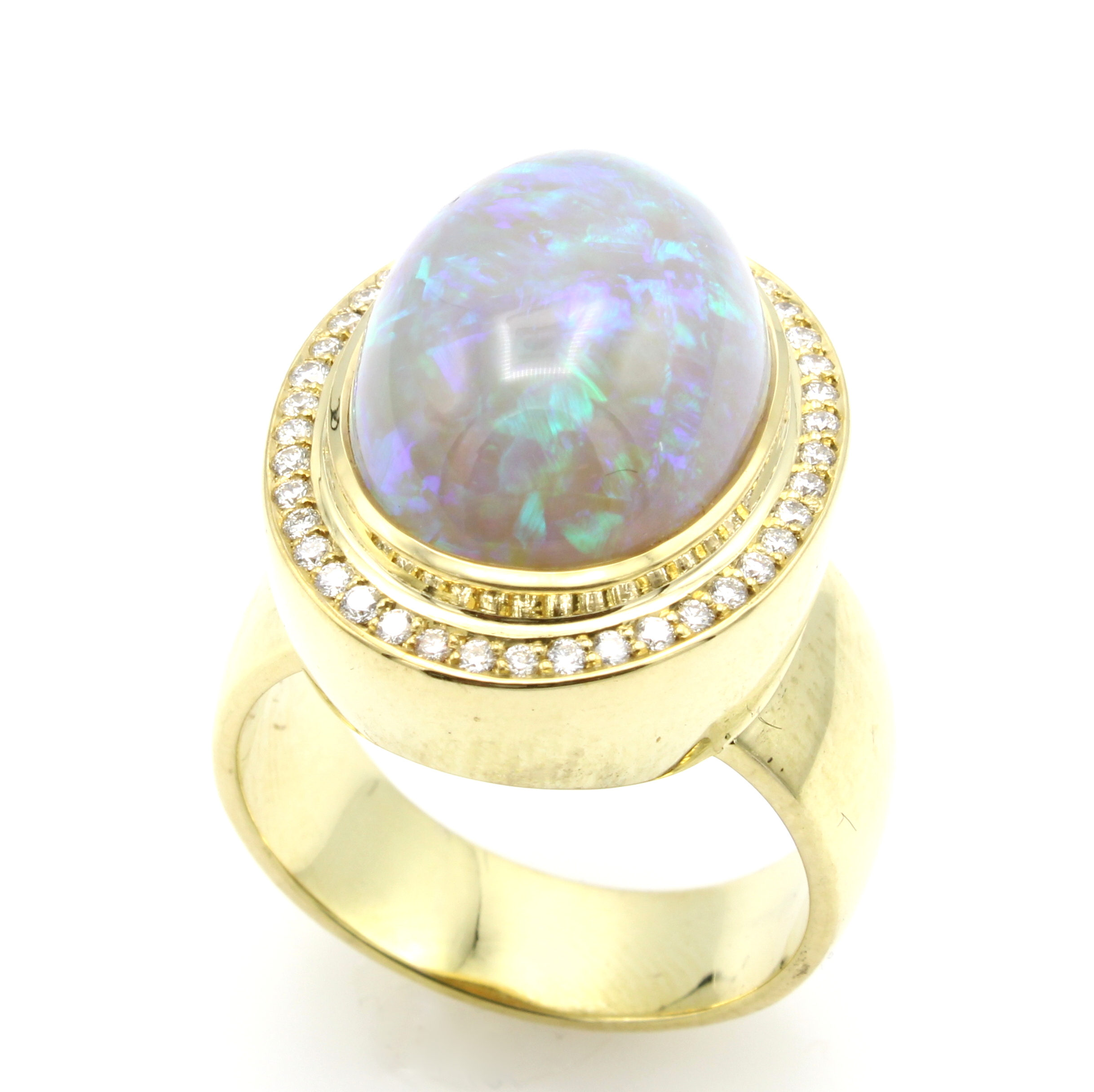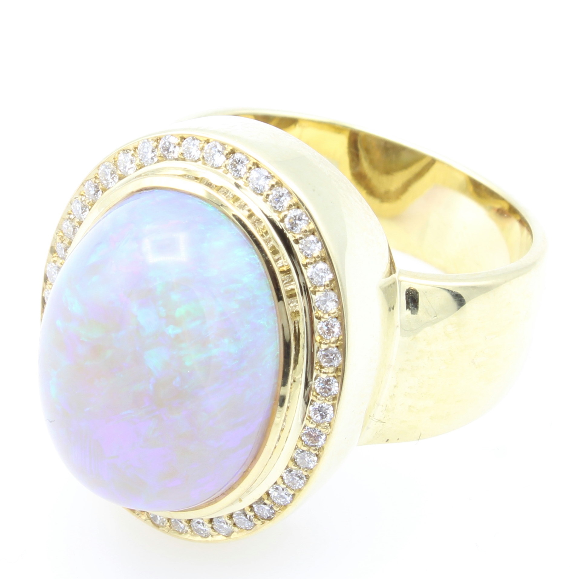 Ring mit Opal und Brillanten, GG 585/000, ovaler Opal ca. 12 ct, Brill. zus. ca. 0.60 ct feines Weiß/si, Gesamtgew. ca. 18.7 g, RW ca. 58 Schätzpreis: 12800, - EUR