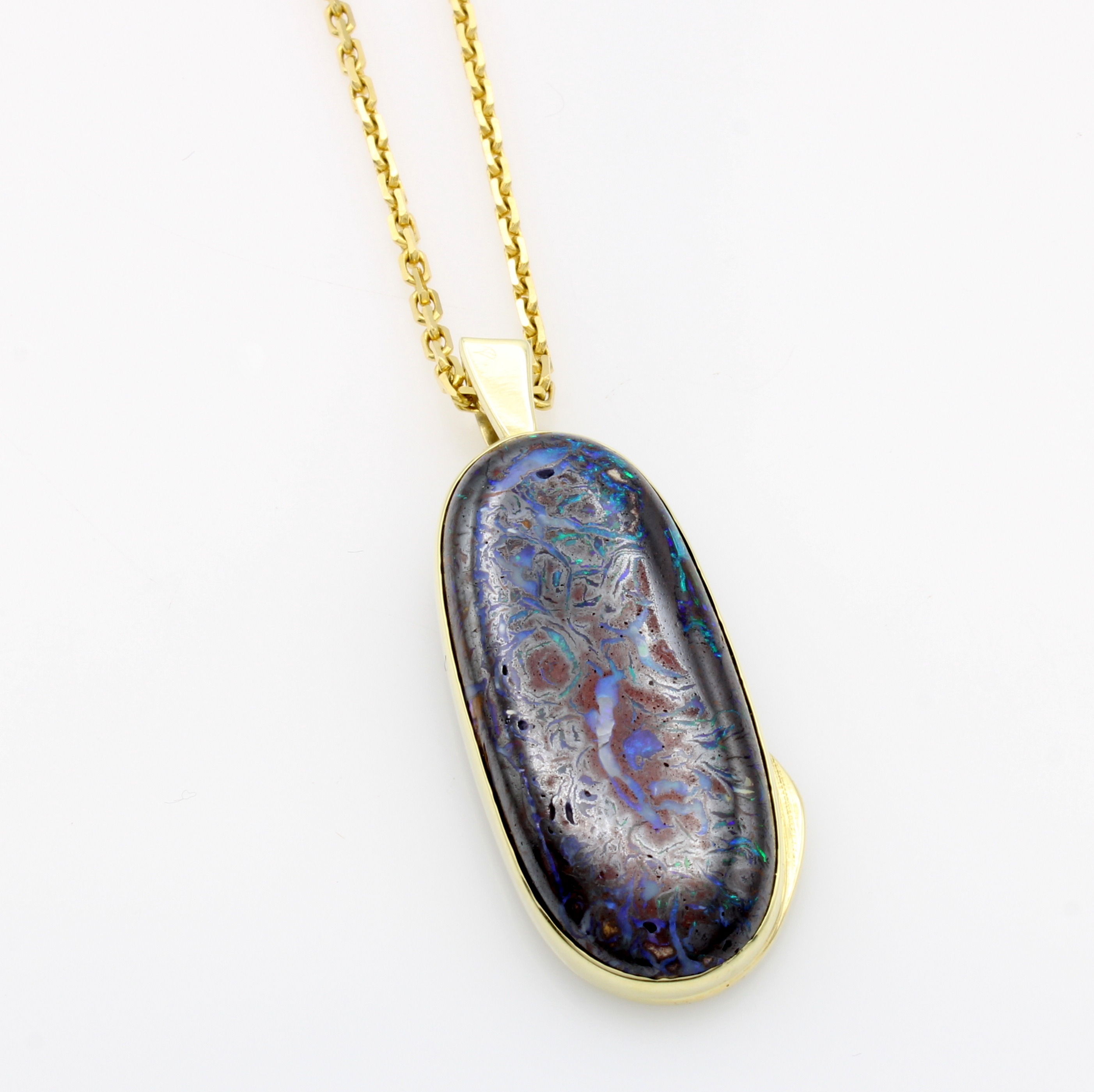 Anhänger mit Opalmatrix an Kette, GG 585/000, ovale Form, Opalmatrix ca. 32 ct, L. ca. 42 cm Schätzpreis: 2800, - EUR
