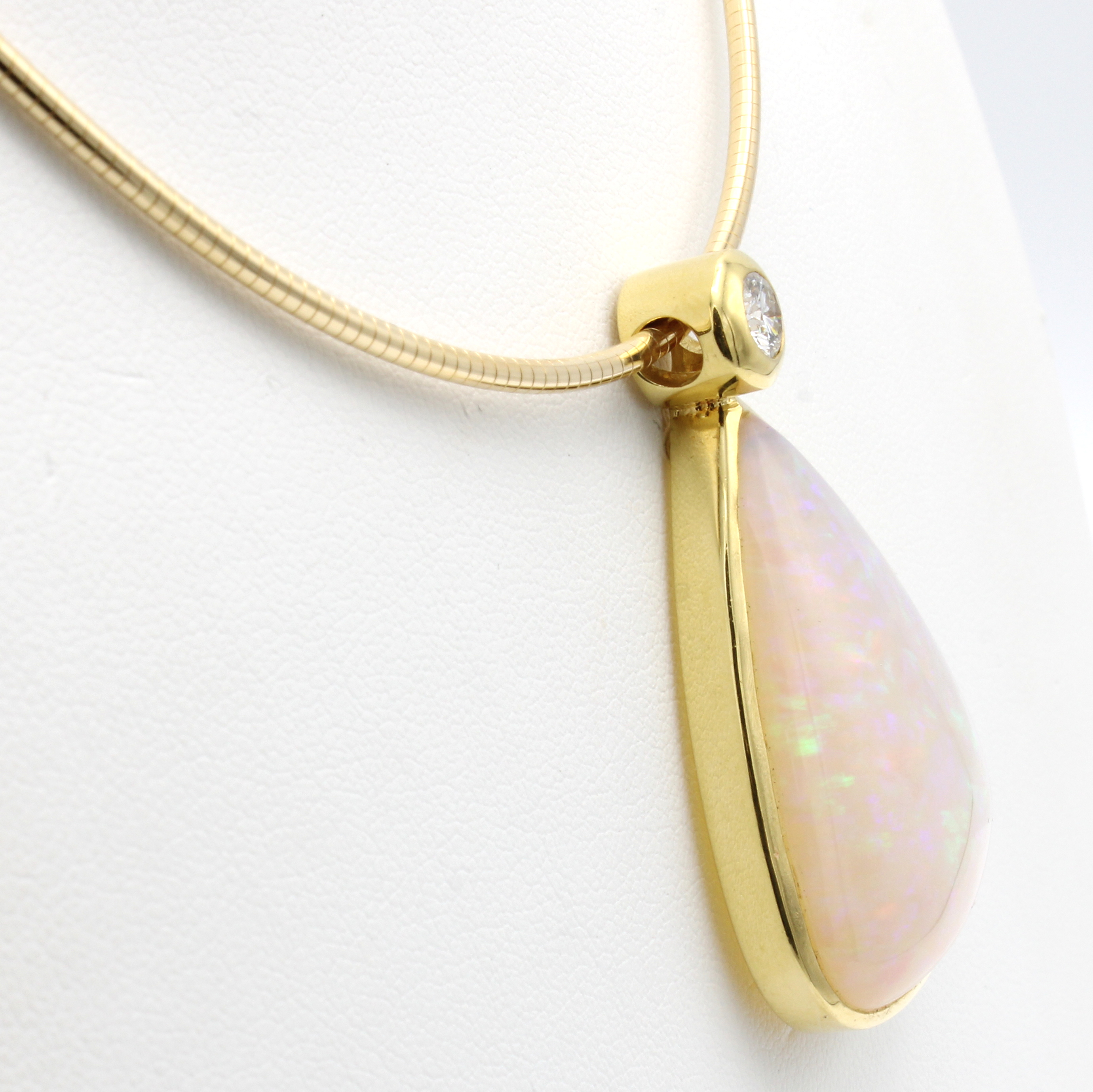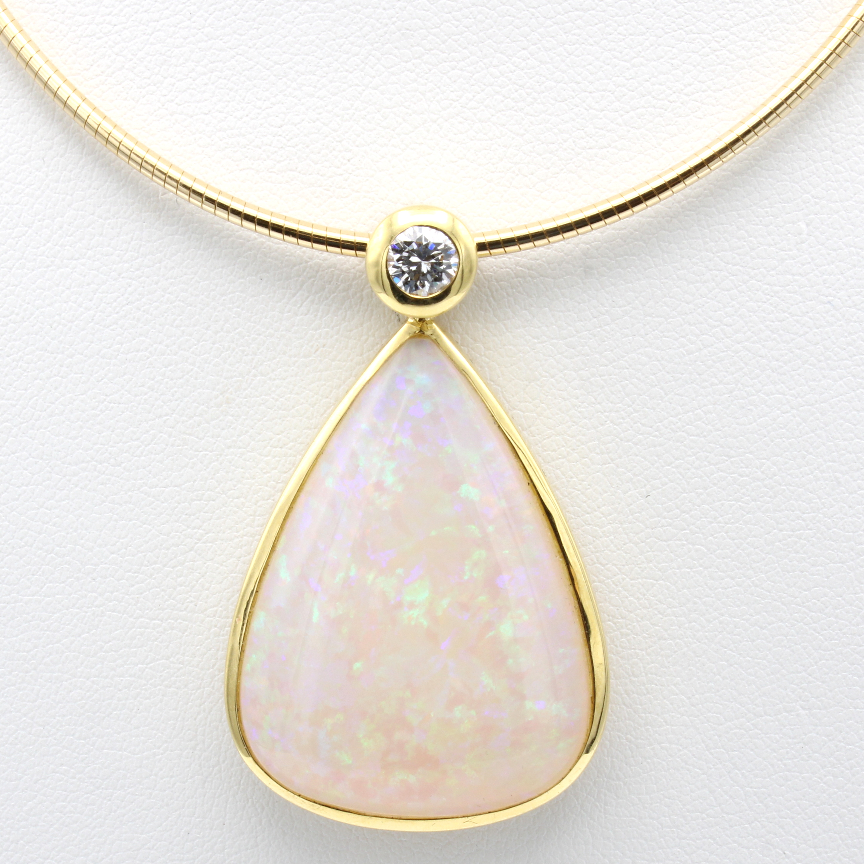 Anhänger mit Opal und Brillant an Omegareif, GG 750/000, Opaltropfen m. schönem Farbspiel ca. 36 ct, Brill. ca. 0.41 ct get.Weiß/si, L. ca. 50 cm Schätzpreis: 18000, - EUR
