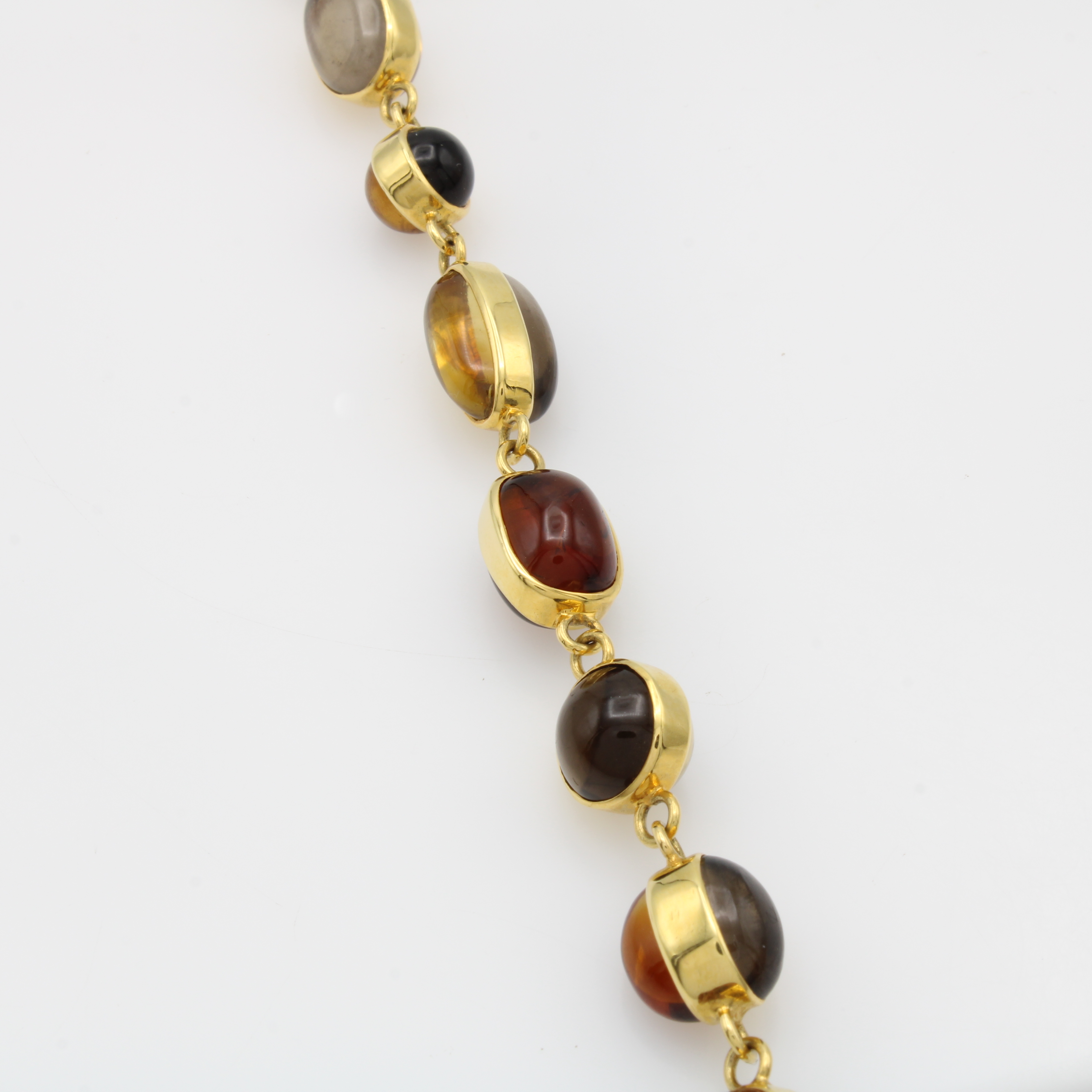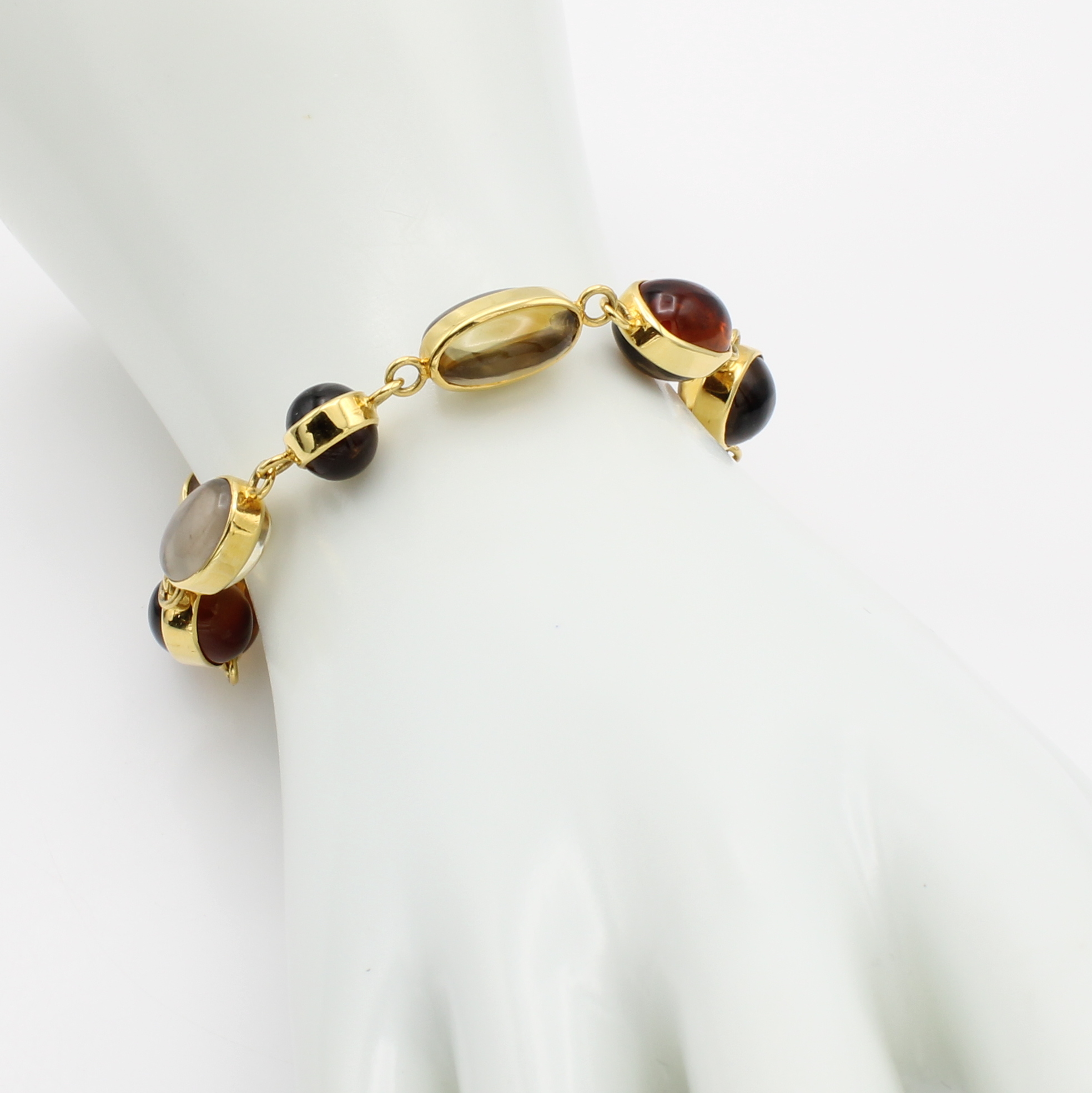 Armband mit Citrinen und Rauchquarzen, GG 585/000, Farbsteincabochons in versch. Formen zus. ca. 63 ct, Karabinerschl., L. ca. 21 cm Schätzpreis: 5400, - EUR