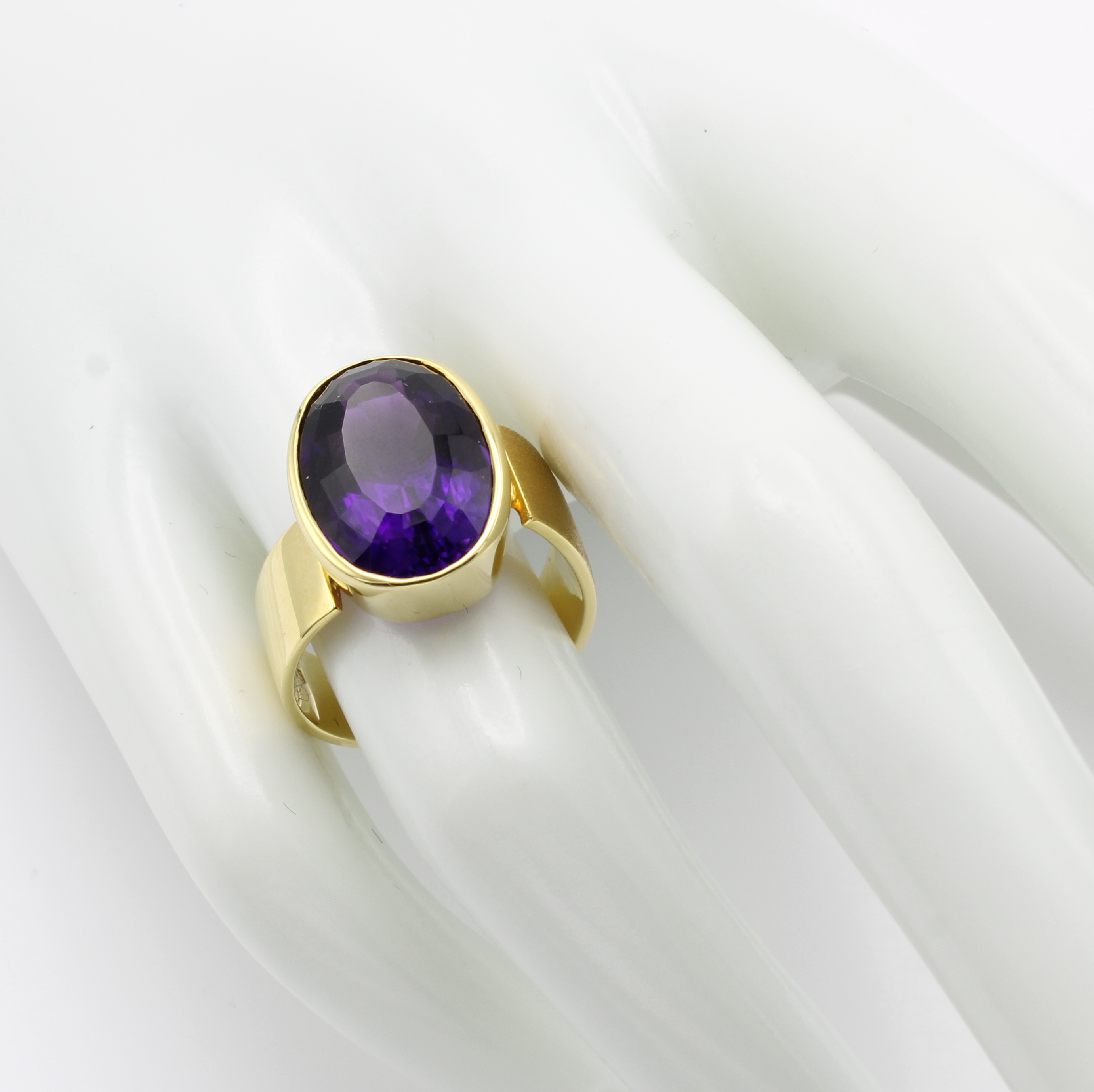 Ring mit Amethyst, GG 585/000, Schiene z.T. matt. u. asymmetrisch anges., ovaler Amethyst ca. 6.5 ct, RW ca. 57 Schätzpreis: 3100, - EUR