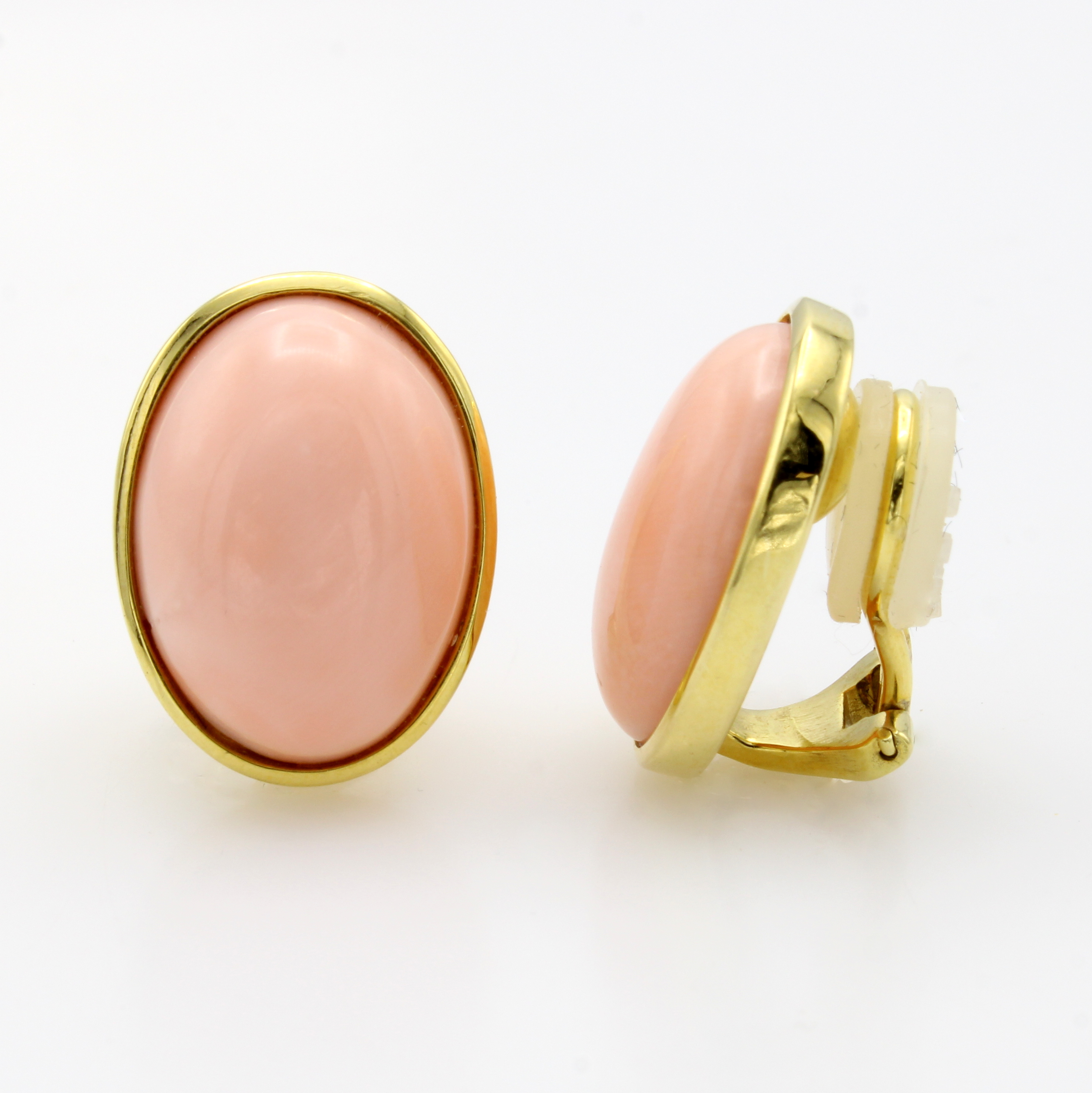 Paar Ohrclips mit Korallen, GG 585/000, 2 ovale, rosa Korallen zus. ca. 19 ct, Versand nur innerhalb der EU Schätzpreis: 3000, - EUR