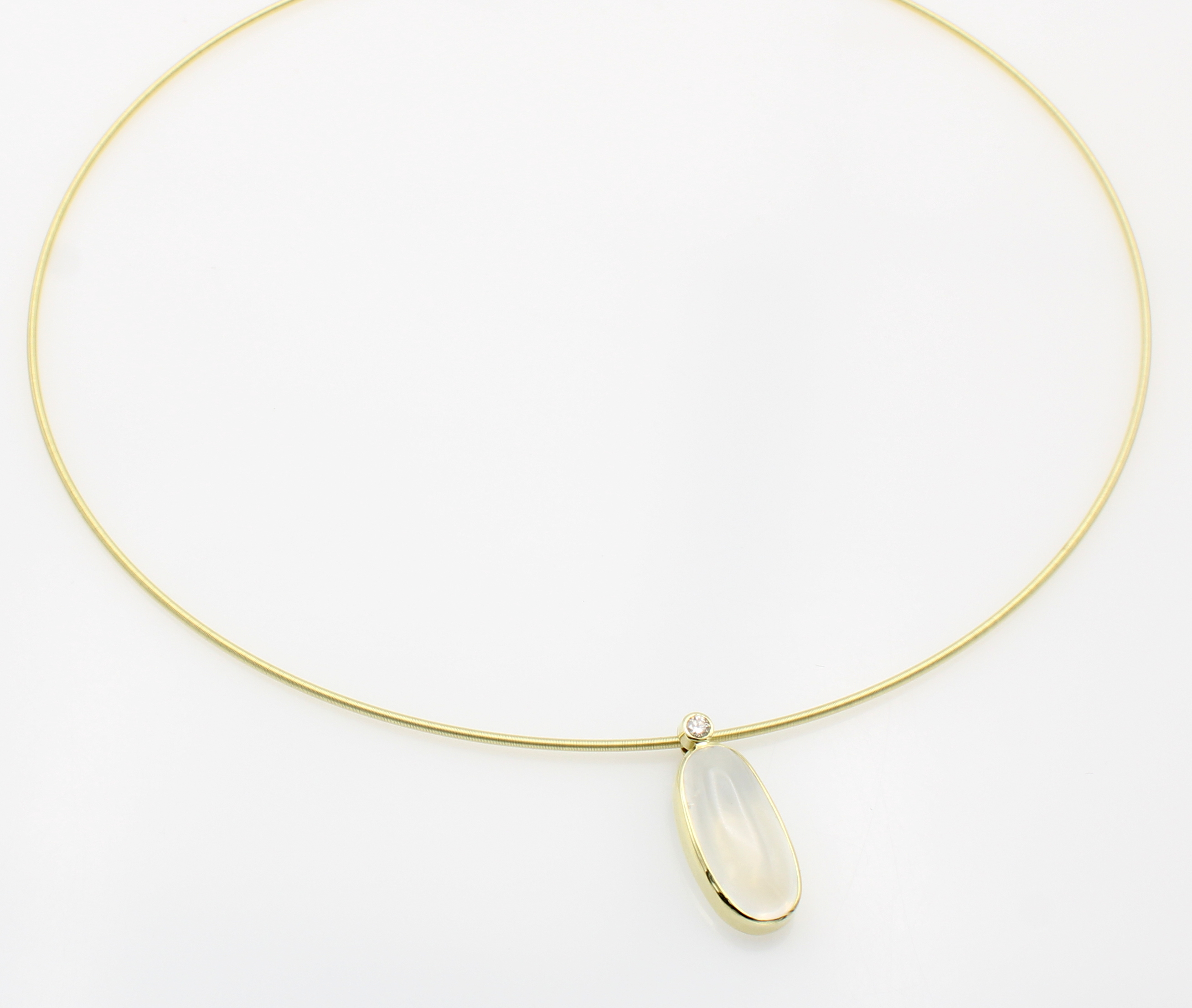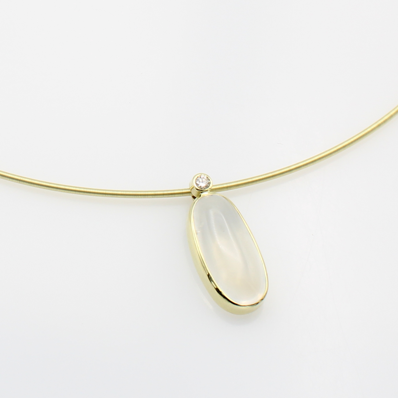 Anhänger mit Mondstein und Brillant an Omegareif, GG 585/000, ovaler Mondstein ca. 8.7 ct, Brill. ca. 0.07 ct Braun/si, L. ca. 45cm Schätzpreis: 2600, - EUR