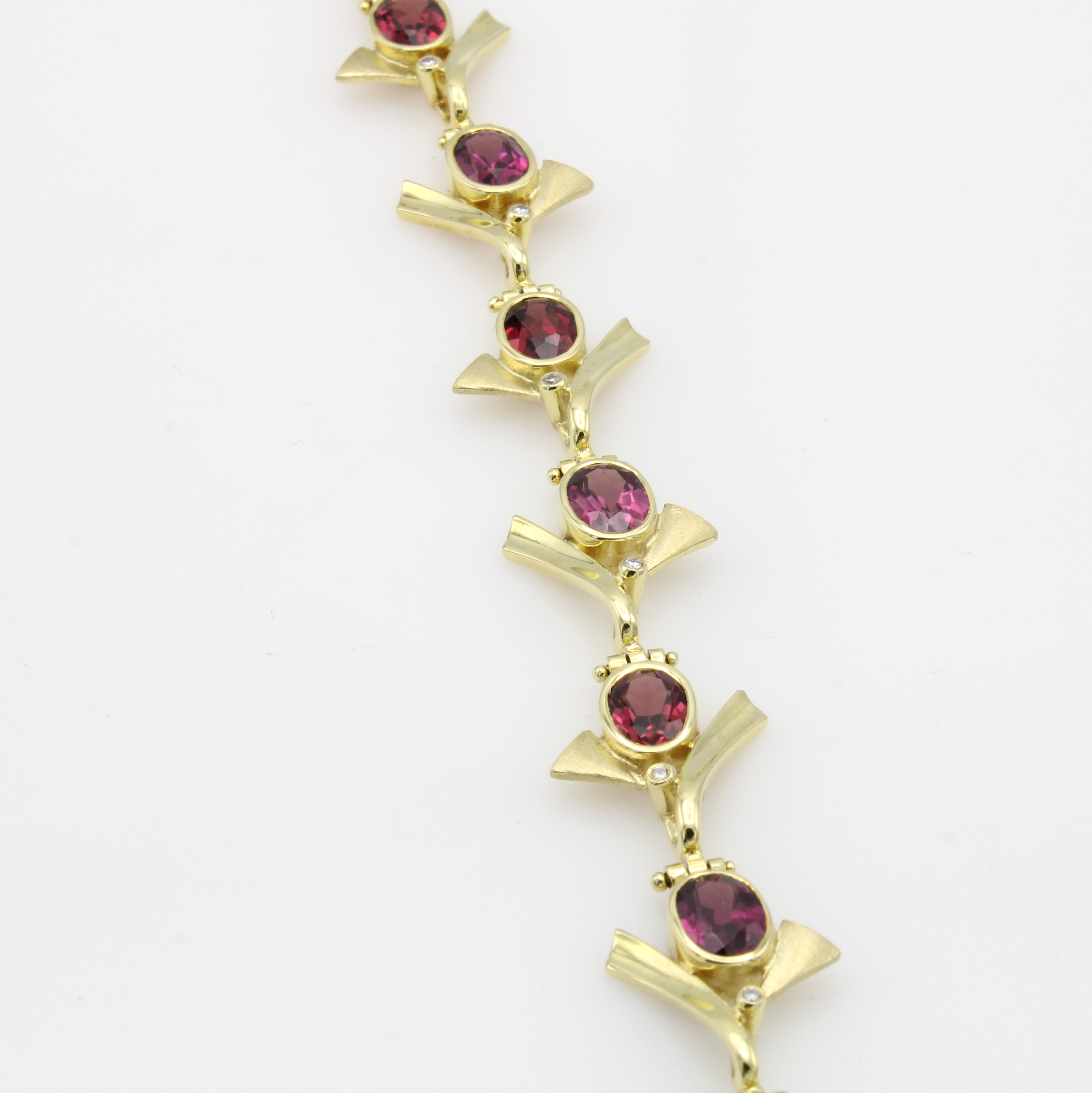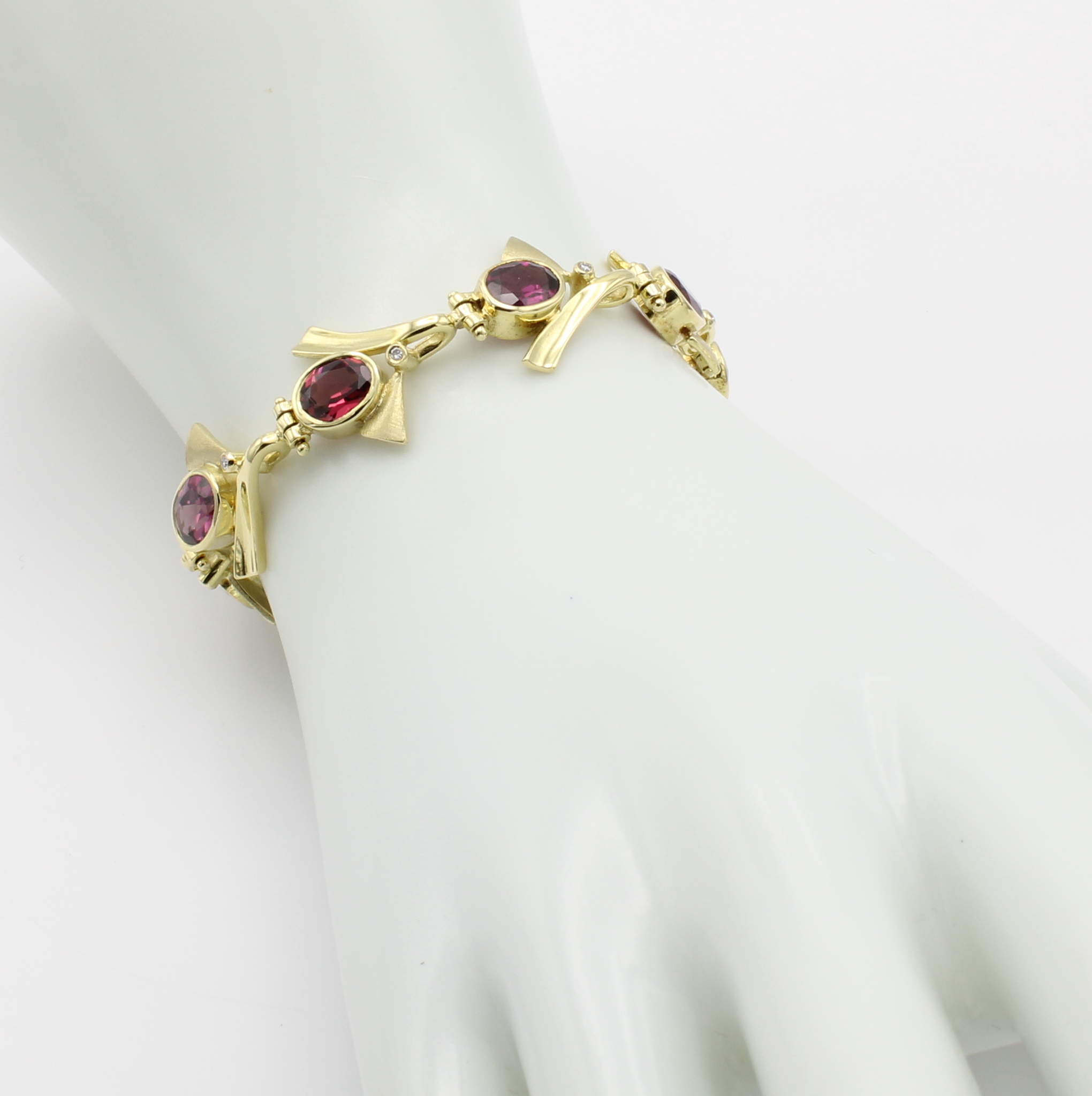 Gliederarmband mit Rhodolithen und Brillanten, GG 585/000, z.T. matt., ovale Rhodolithe zus. ca. 9 ct, Brill. zus. ca. 0.10 ct feines Weiß/si, Kastenschl. m. Sicherheitsacht, L. ca. 19 cm Schätzpreis: 7400, - EUR