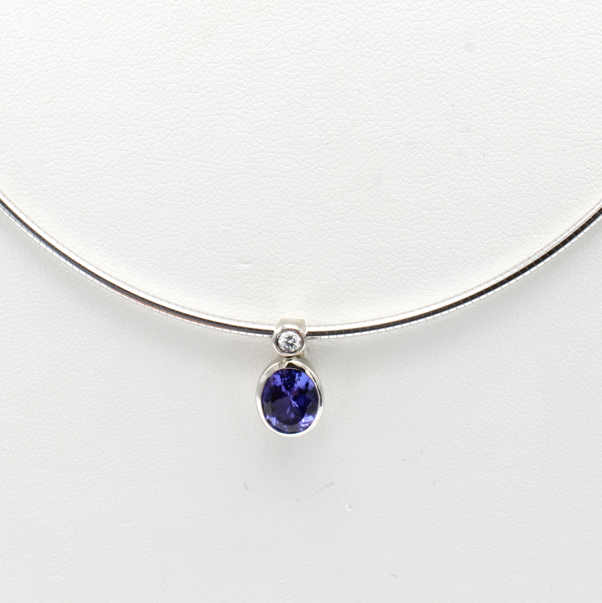 Anhänger mit Tansanit und Brillant an Omegareif, WG 585/000, ovaler Tansanit ca. 2.00 ct, Brill. ca. 0.08 ct feines Weiß/vs-si,L. ca. 45 cm Schätzpreis: 6000, - EUR