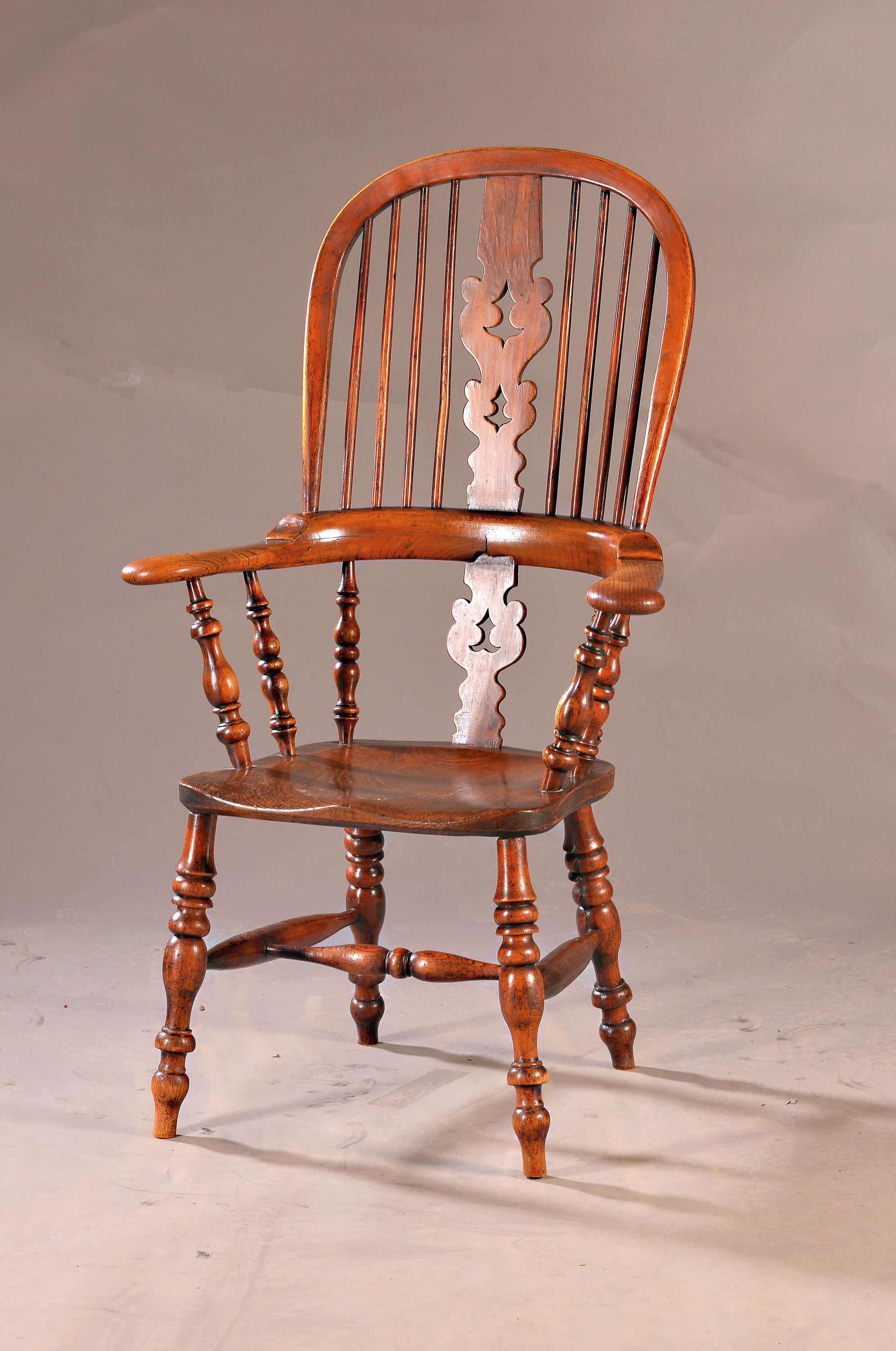 Windsor Stuhl, England, um 1850, Rüster massiv, Holz in schöner Patina, ca. 114 x 69 cm, EZ 2-3
