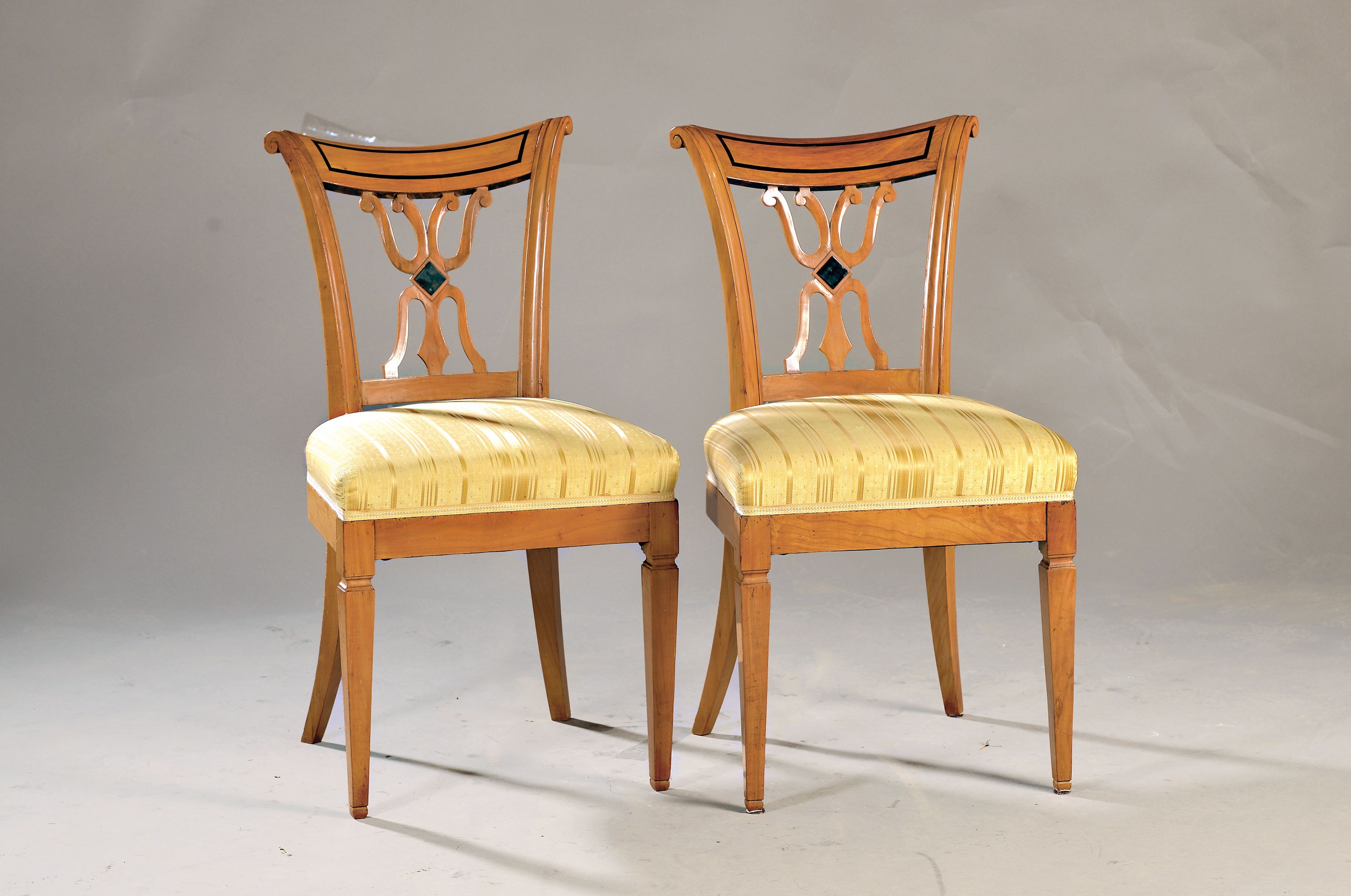 Paar Biedermeierstühle, um 1850, Kirschbaum massiv, Rückenlehne mit schwarzen Bandintarsien,