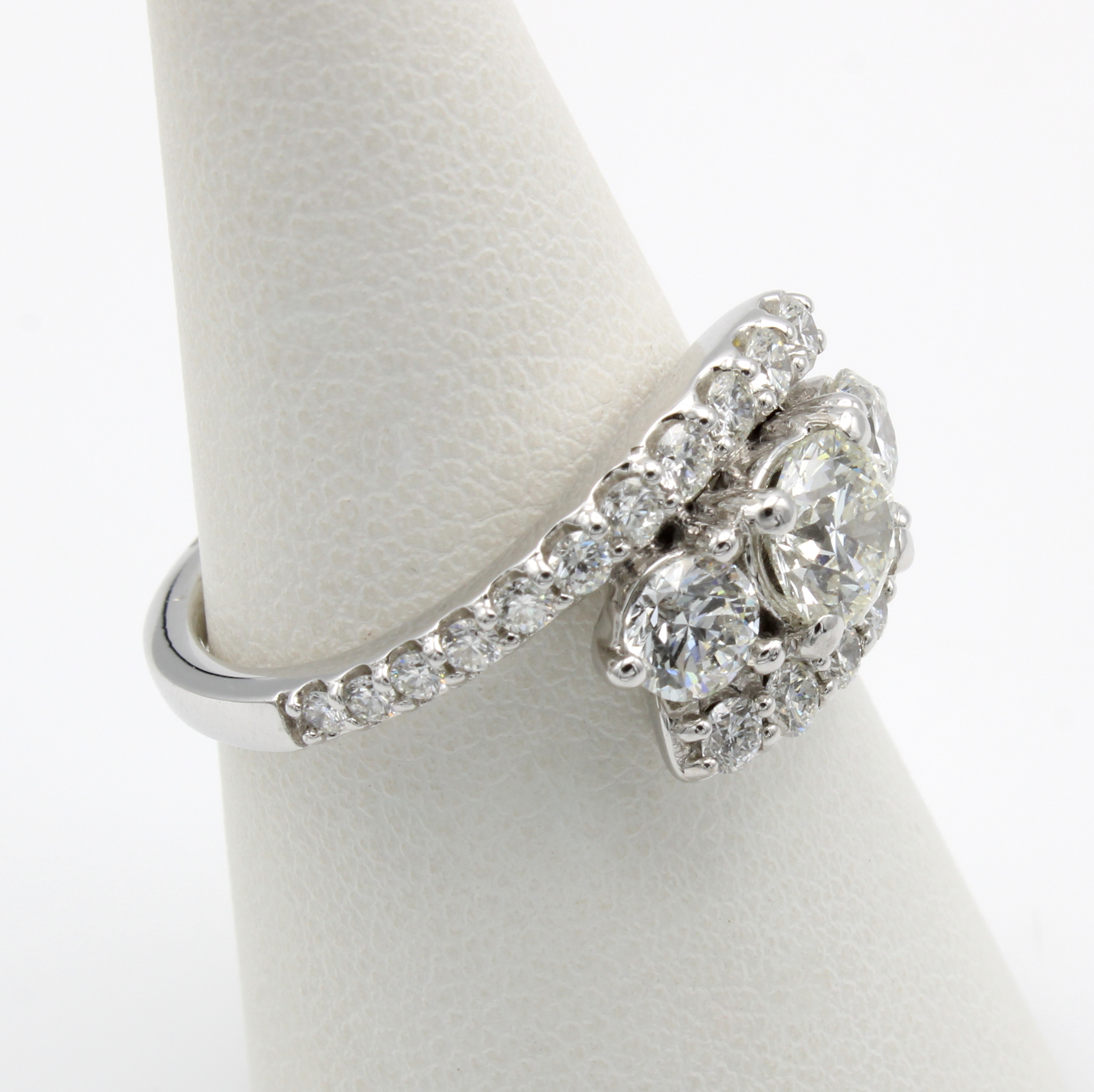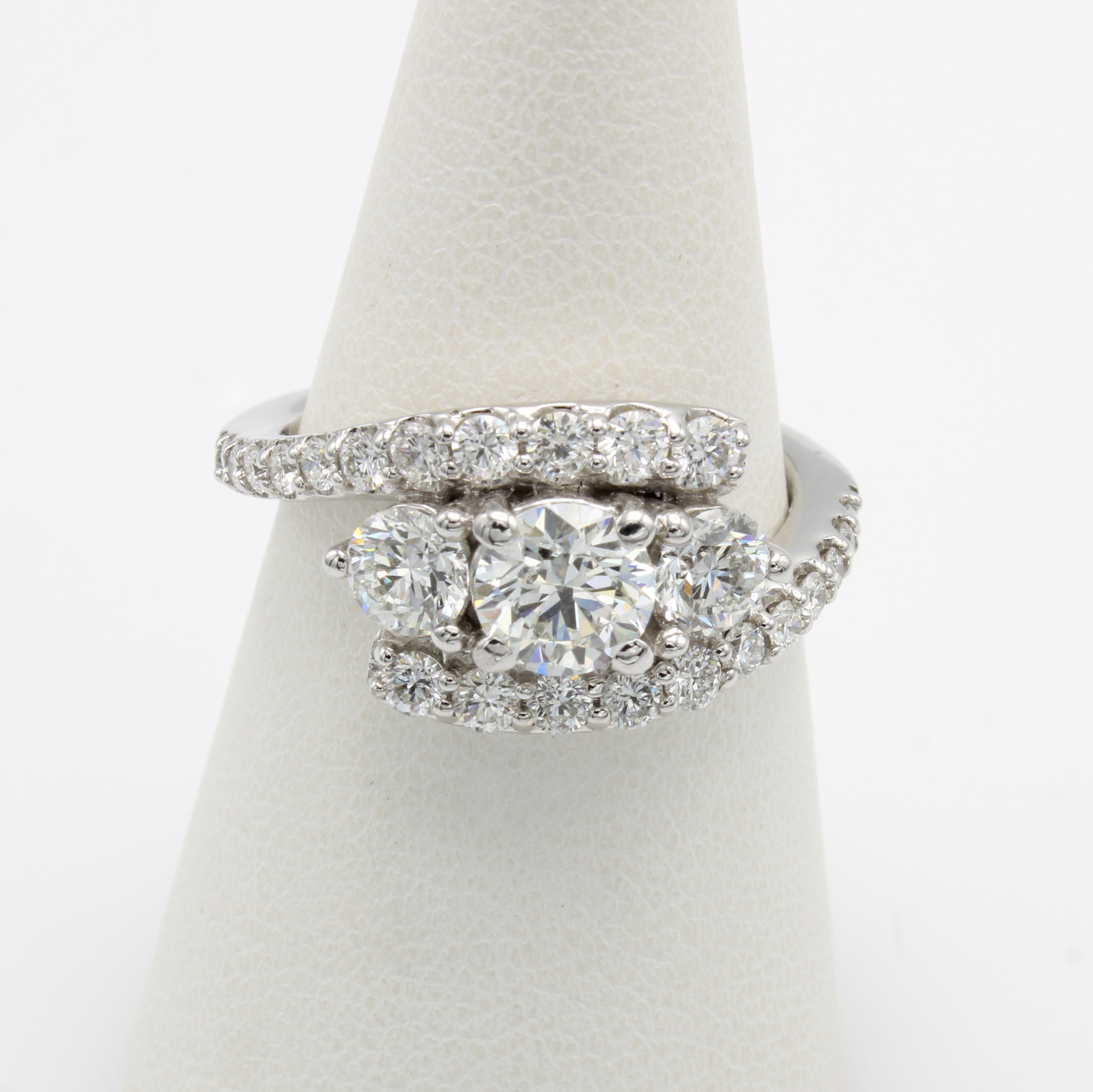 Ring mit Brillanten, WG 750/000, 1 Brill. ca. 0.70 ct l.get.Weiß/si1, 2 Brill. zus. ca. 0.61 ct feines Weiß/si und 22 Brill. zus. ca. 0.60 ct feines Weiß/vs, RW ca. 54 Schätzpreis: 26250, - EUR