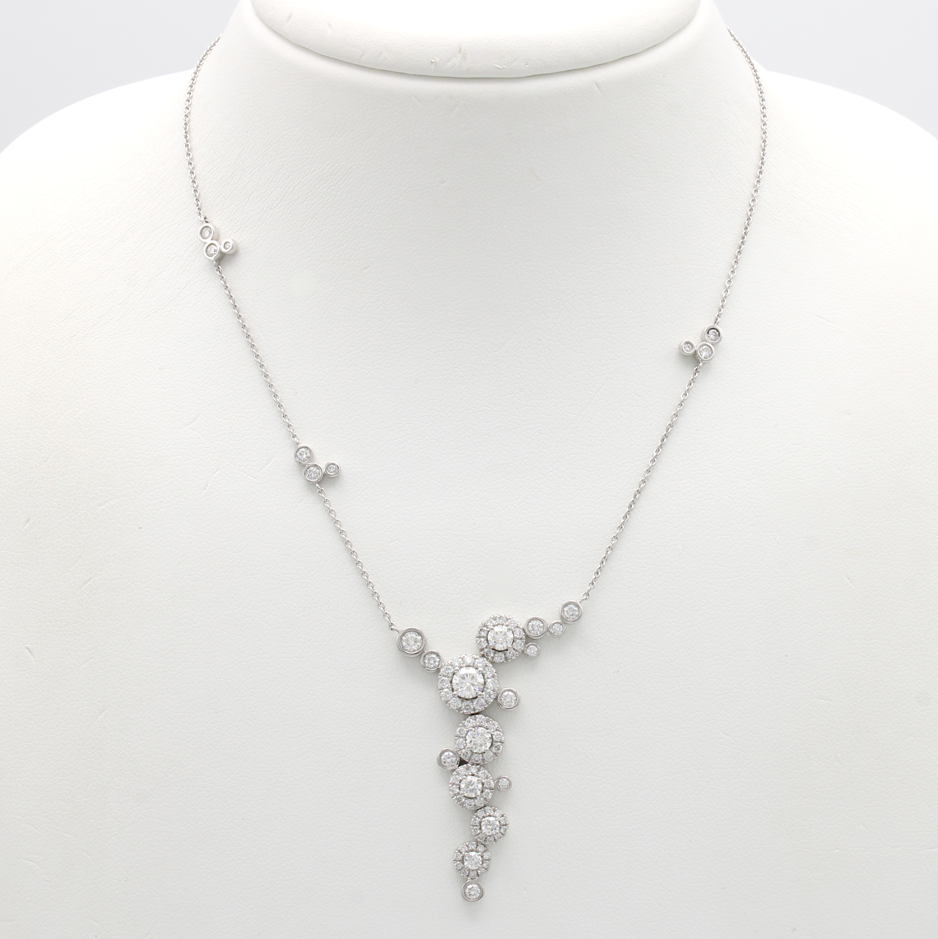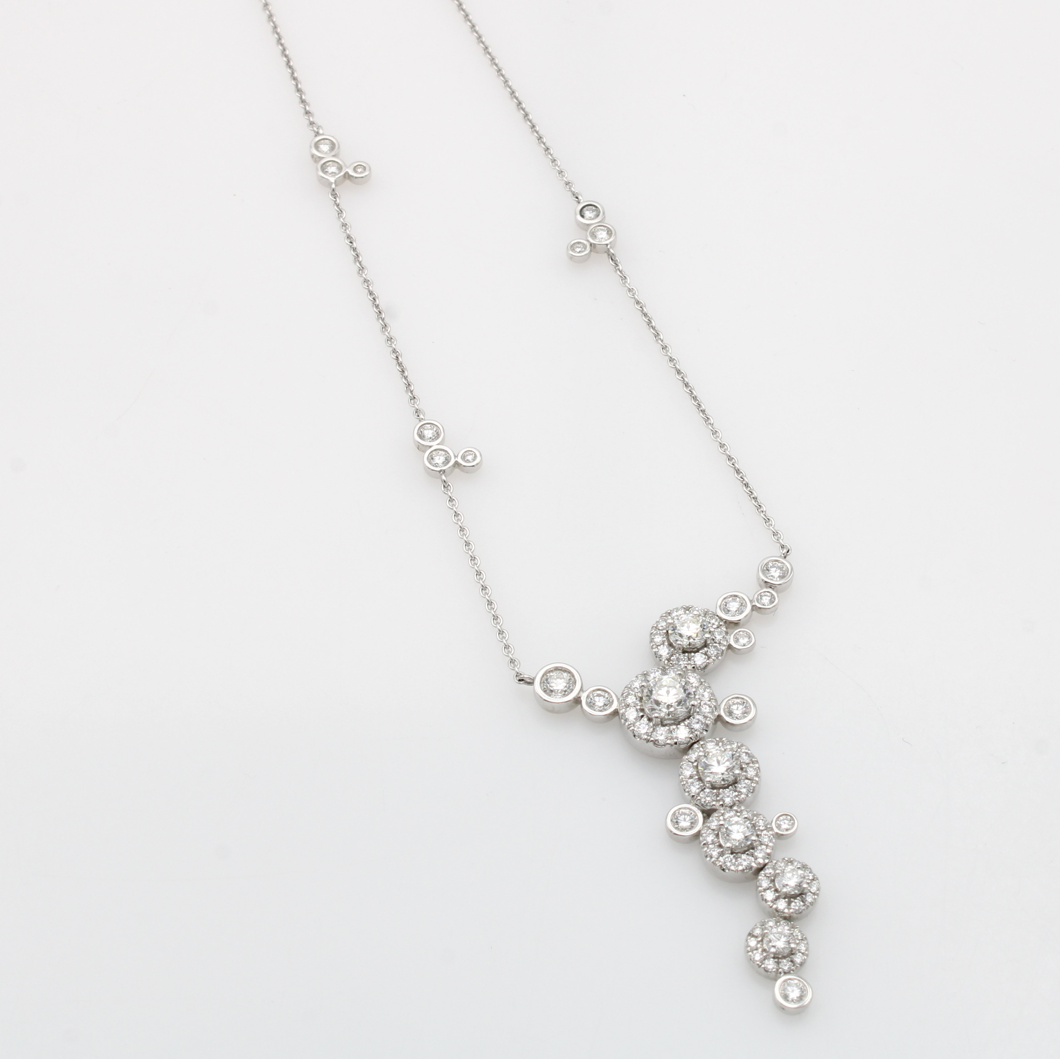Collier mit Brillanten, WG 750/000, 9 Brill.in Kette integriert u. 78 Brill. als verspielte Abhängung angesetzt zus. ca. 2.54 ct feines Weiß/vs-si, L. ca. 42 cm Schätzpreis: 18000, - EUR