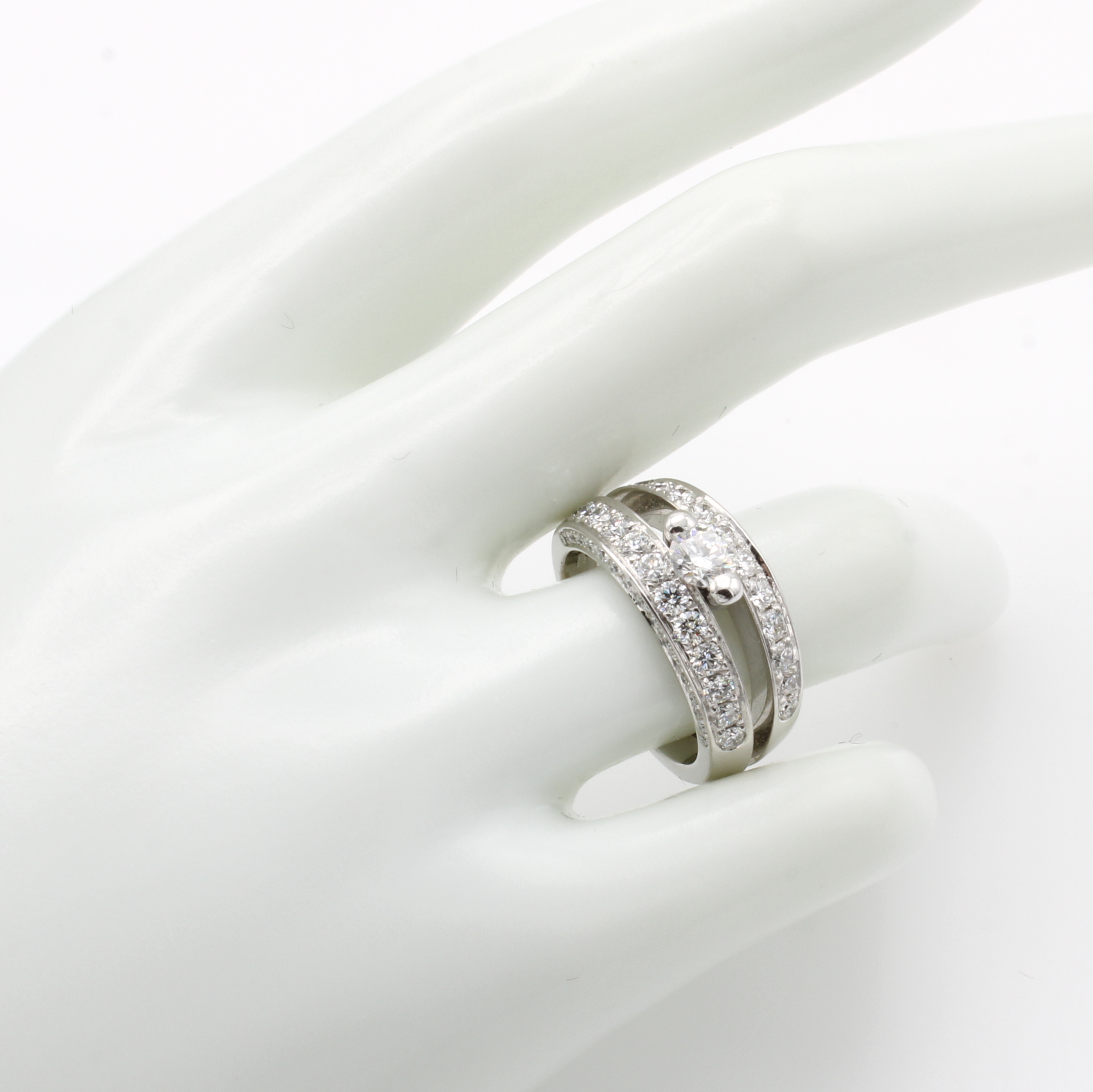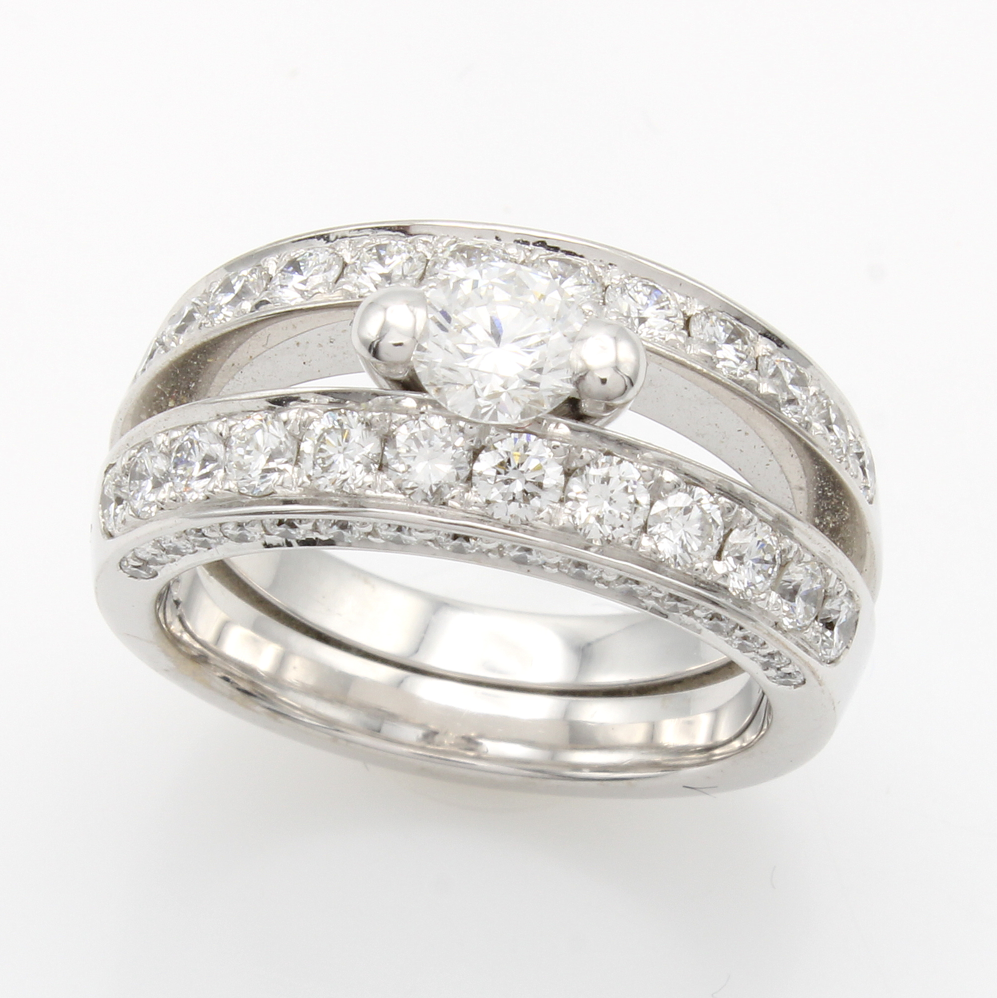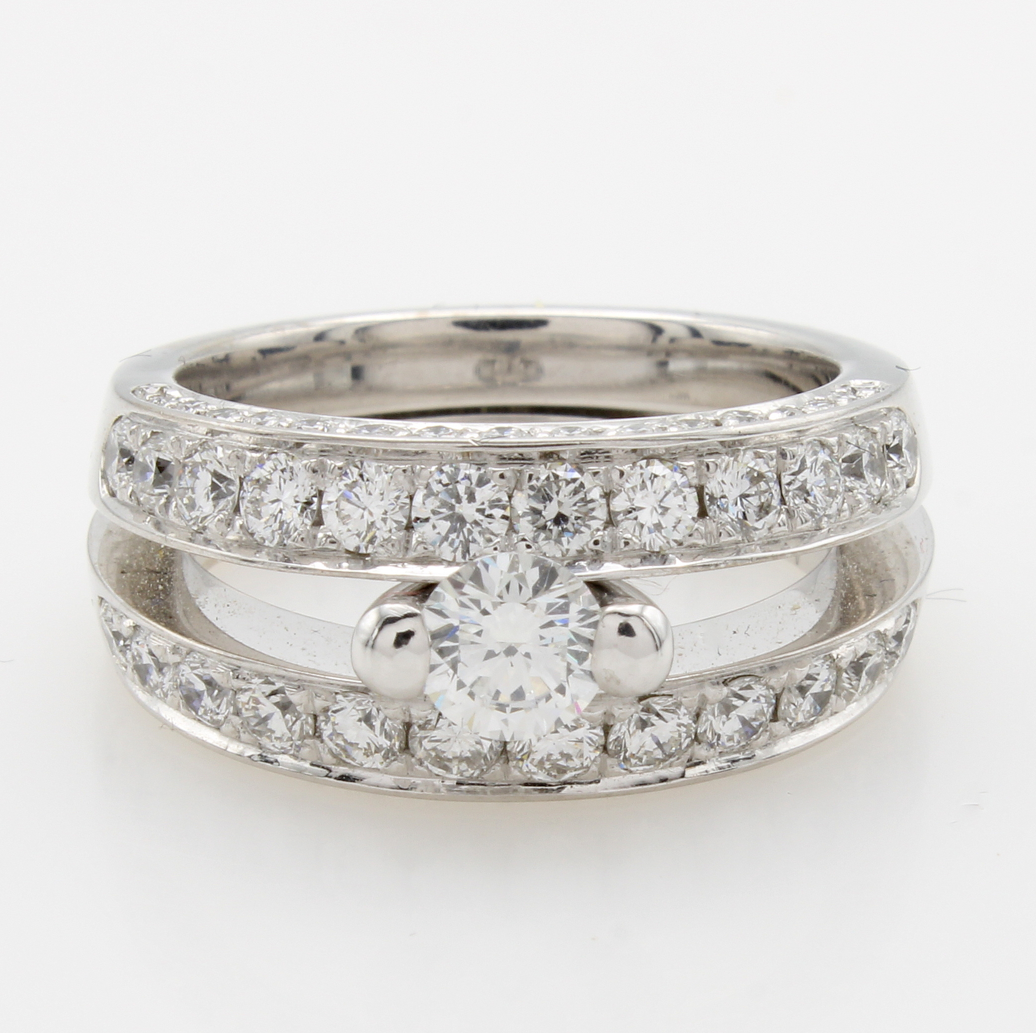 Massiver Ring mit Brillanten, WG 750/000, Mittelstein ca. 0.42 ct und 58 Brill. zus. ca. 1.42 ct feines Weiß/vs, geteilte Ringschiene, RW ca. 54 Schätzpreis: 27000, - EUR