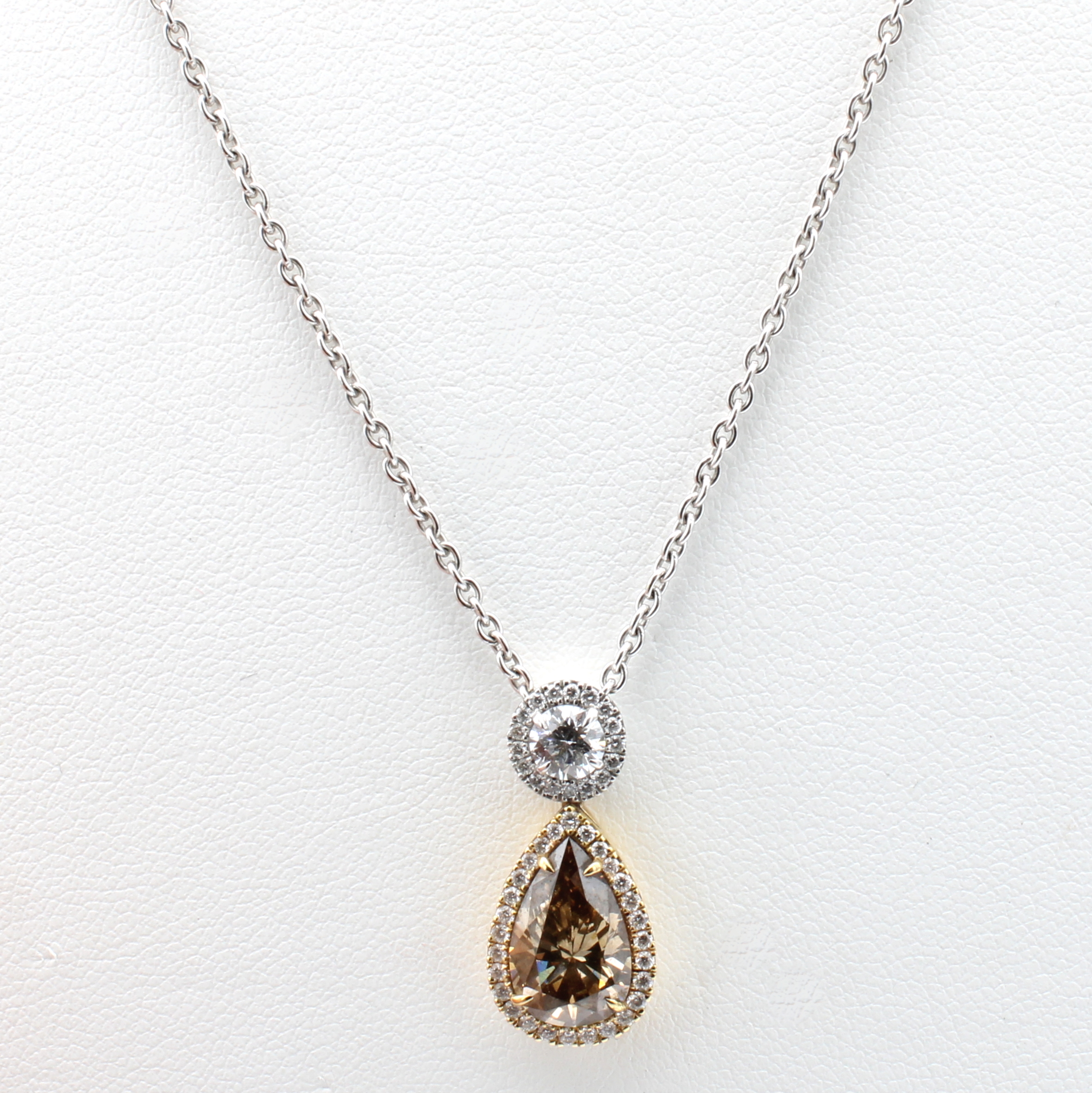 Anhänger mit Diamanten und Brillanten an Kette, RG/WG 750/000, Diamanttropfen v. sehr schönem Farbspiel ca. 2.09 ct orange-brown/si,1 Brill. ca. 0.30 ct feines Weiß/si und 45 Besatzbrill. zus. ca. 0.21 ct feines Weiß/vs, L. ca. 42.5 cm Schätzpreis: 29500, - EUR