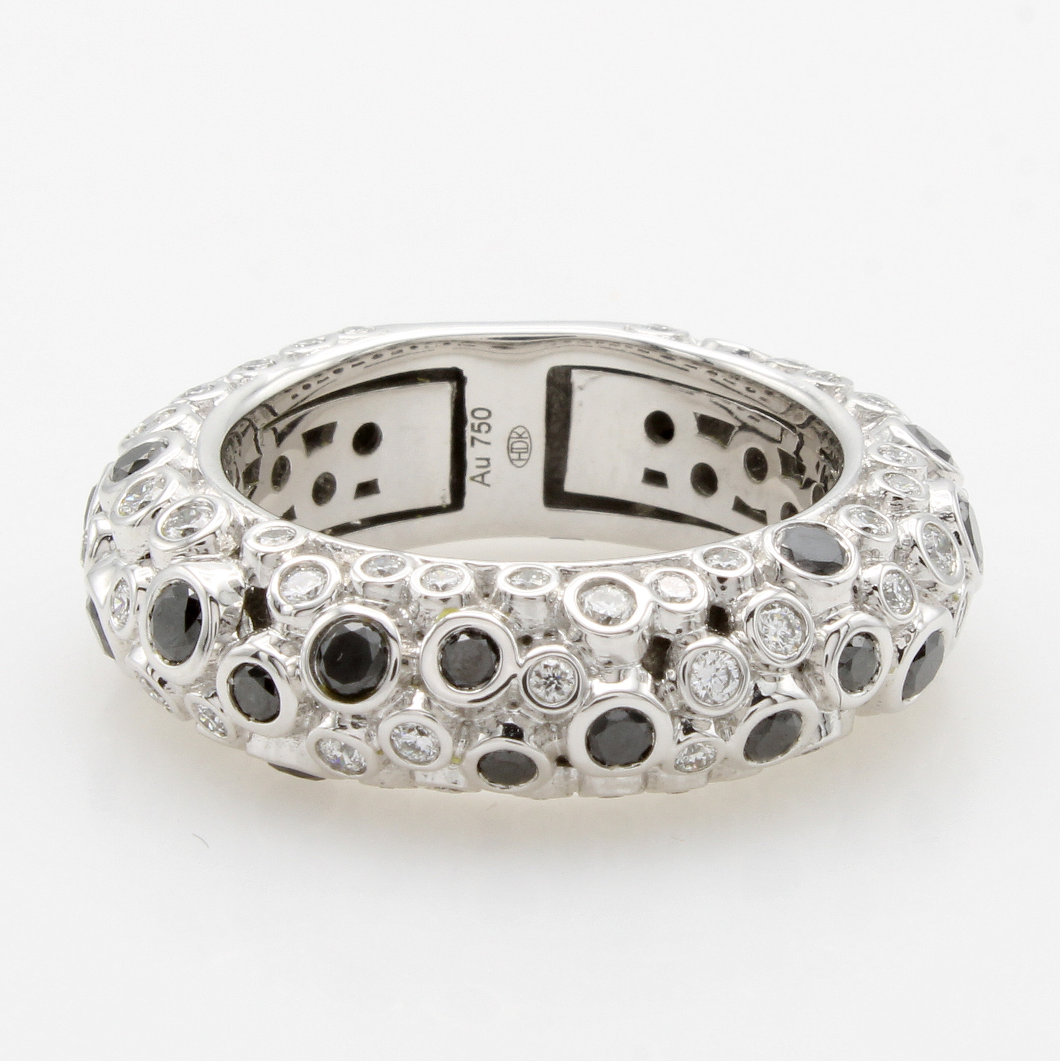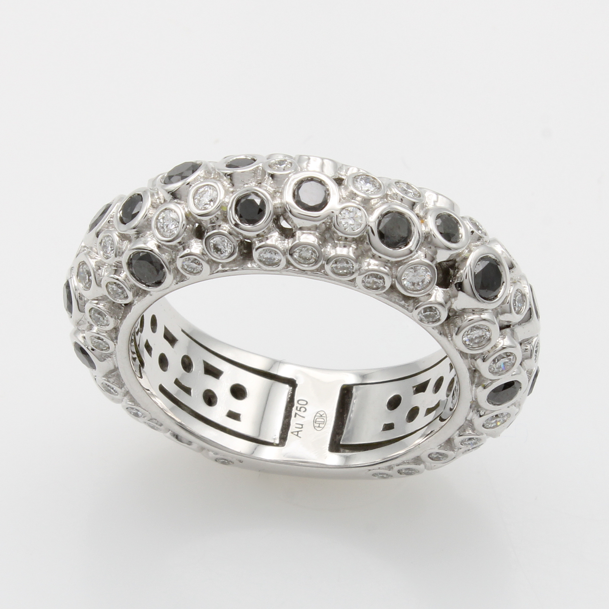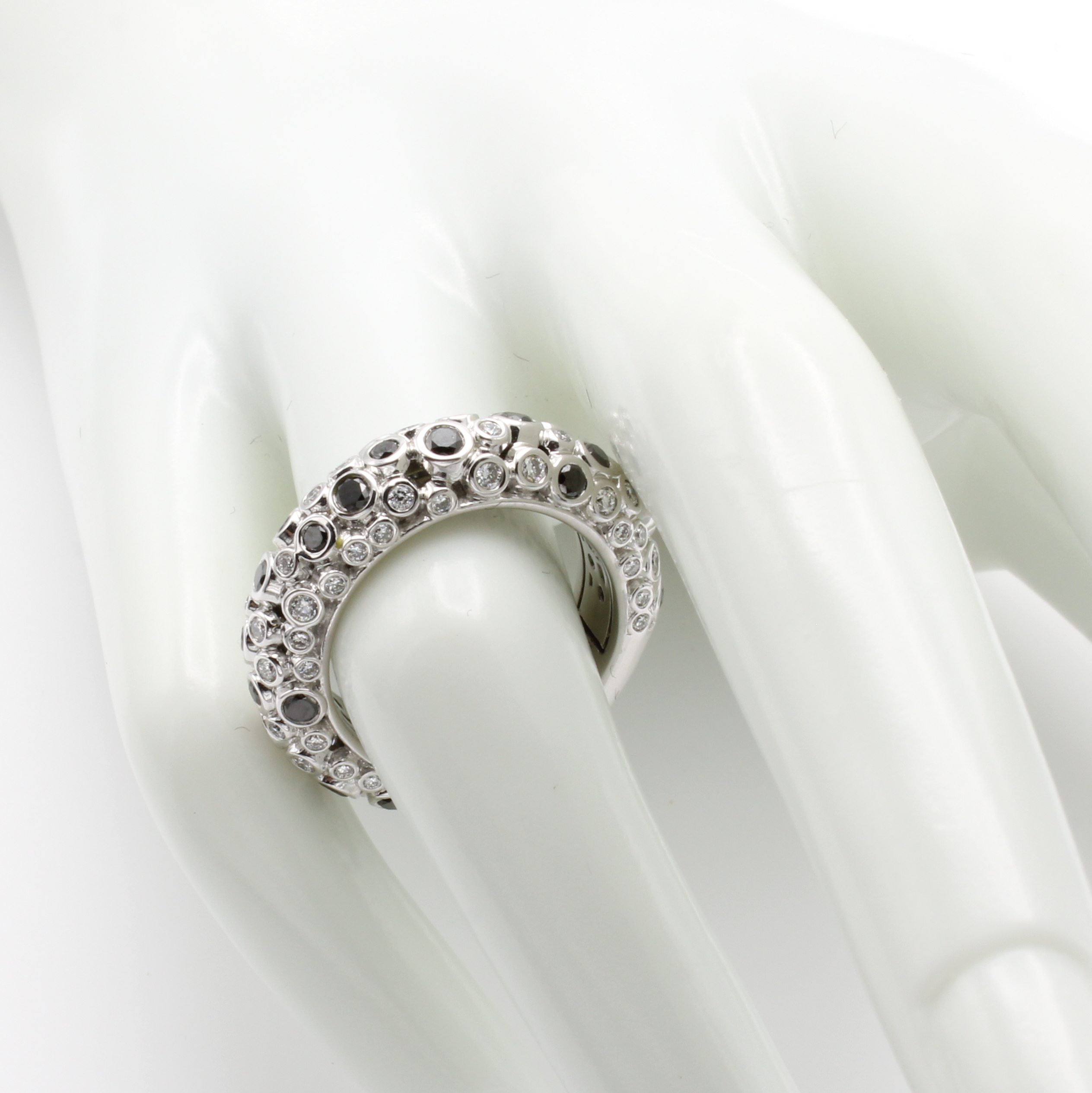 Ring mit Brillanten, WG 750/000, 71 Brill. einzeln in Zargenfassung zus. ca. 0.86 ct feines Weiß/si und 24 Brill. zus. ca. 1.06 ct schwarz (beh.), RW ca. 55 Schätzpreis: 15700, - EUR