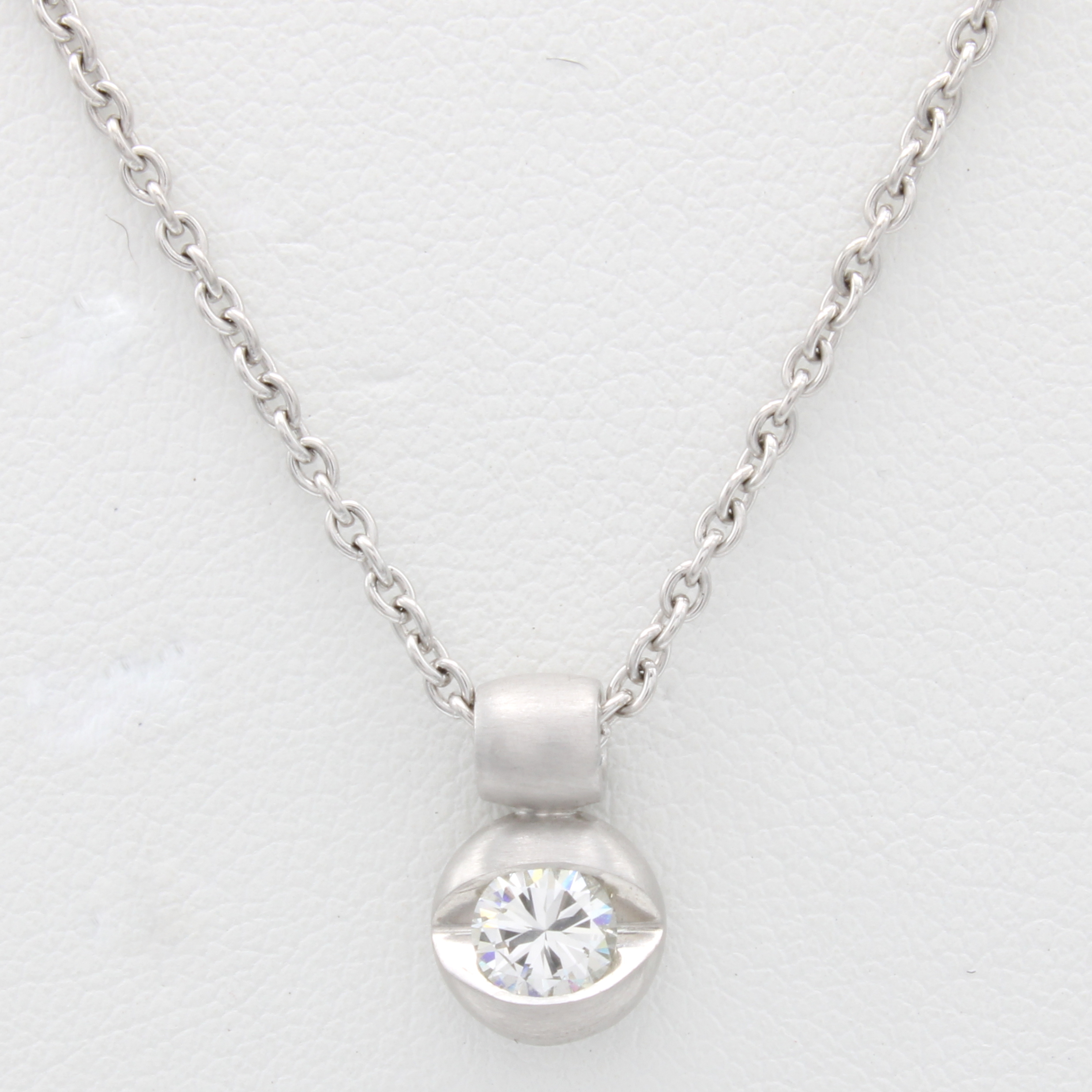 Anhänger mit Brillantsolitär an Kette, WG 750/000, runder, matt. Anhänger bes. m. Brill.in navetteförm. Fassung ca. 0.30 ct feines Weiß/si, L. ca. 42.5 cm Schätzpreis: 6550, - EUR