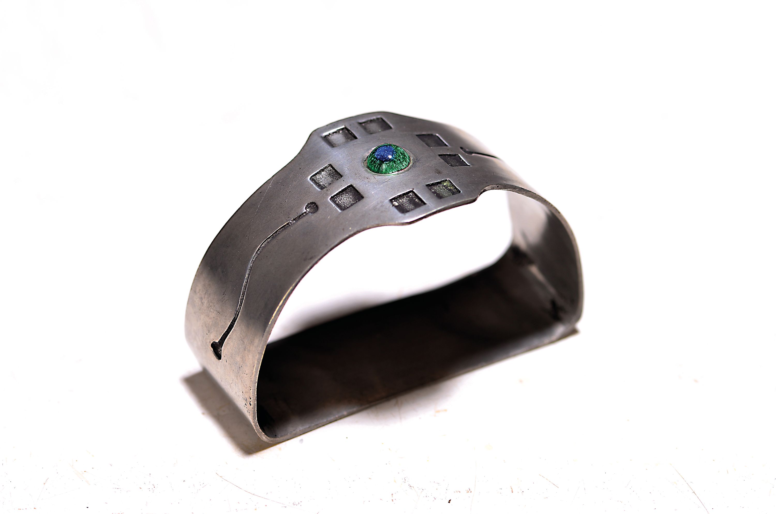 um 1905, ornamental-geometrischer Dekor, mittig eingelassener Glasstein, Unterseite