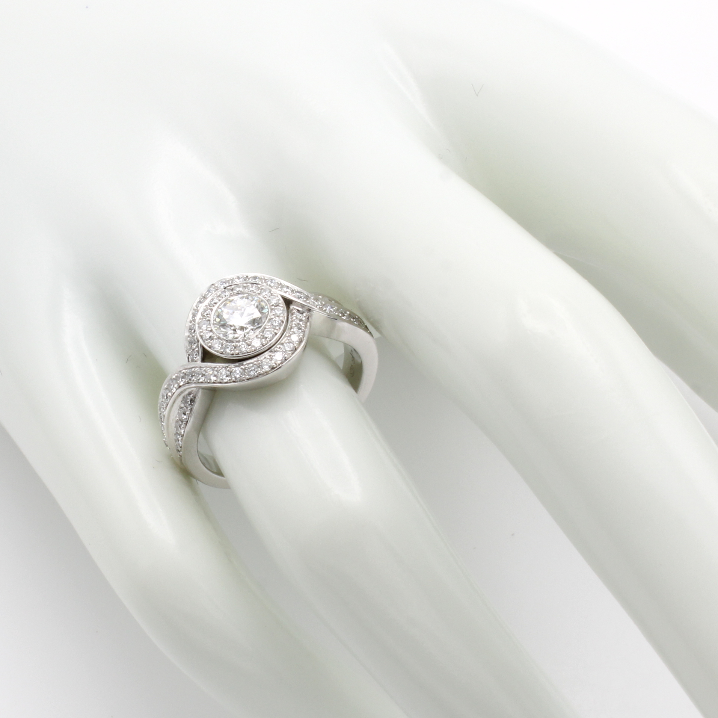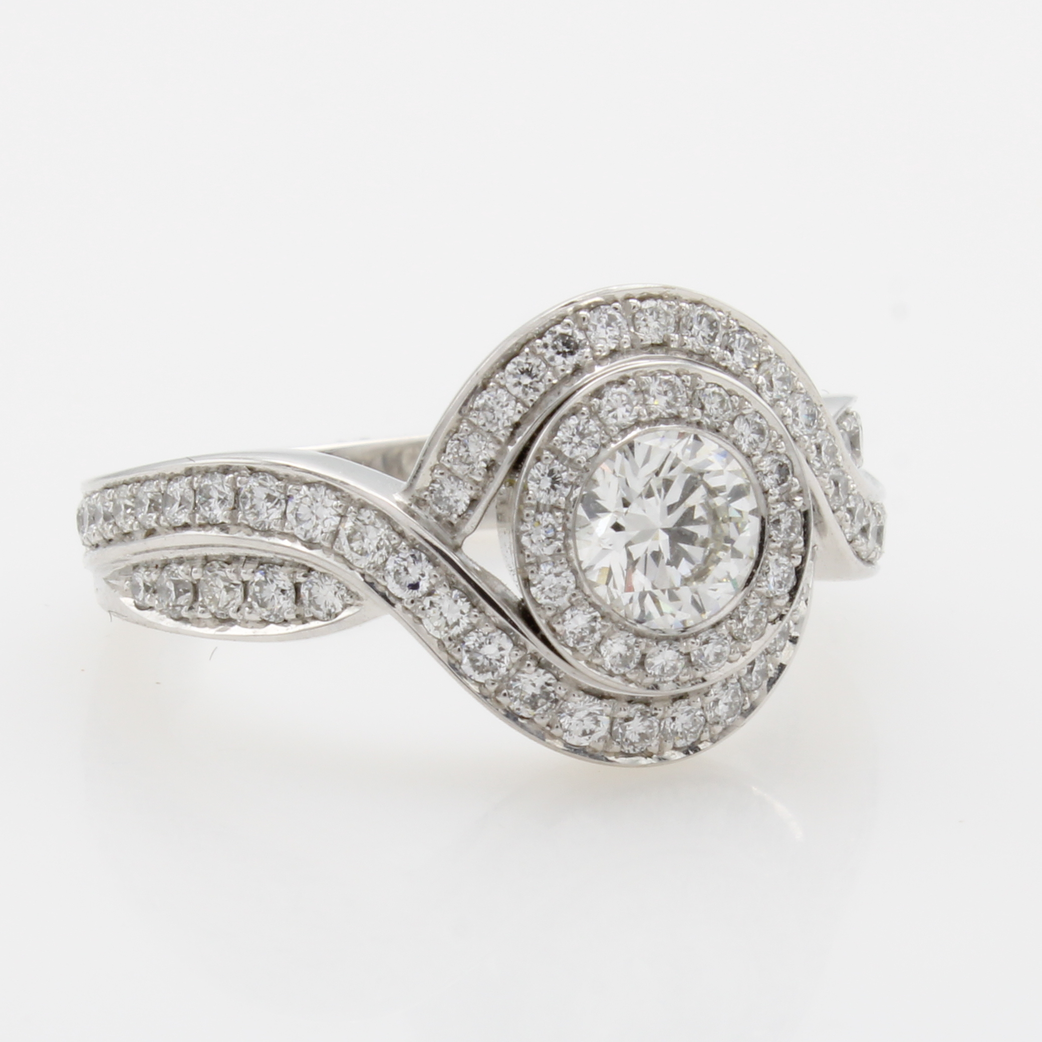 Ring mit Brillanten, WG 750/000, geschwungenes, überkreuztes Design, 1 Brill. ca. 0.50 ct feines Weiß/si, 72 Besatzbrill. zus. ca. 0.61 ct feines Weiß/vs, RW ca. 54 Schätzpreis: 20000, - EUR