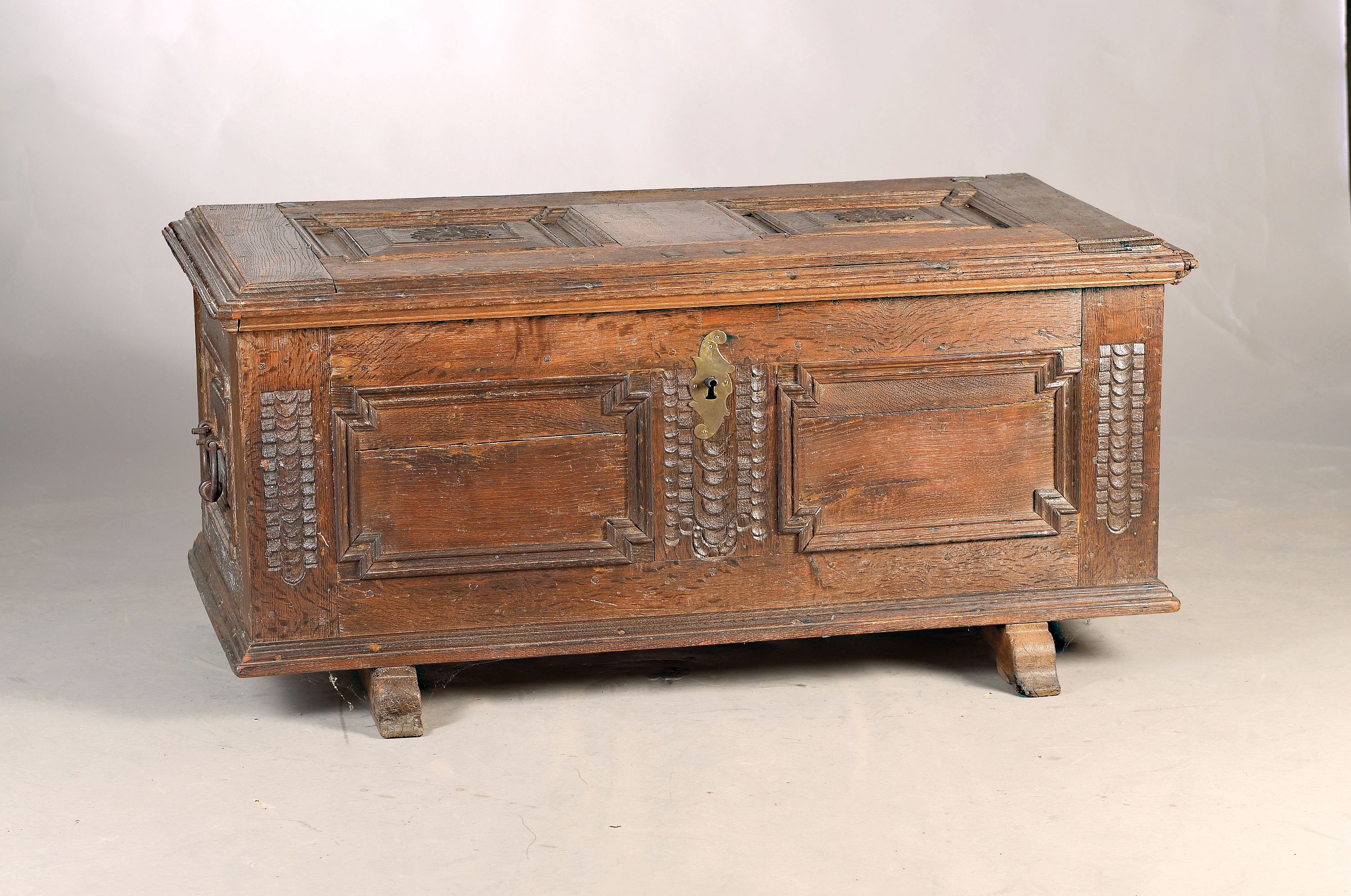 Barocke Eichentruhe, 18.Jh., Eiche massiv, kassettiert, seitlich jeweils ein Eisengriff,