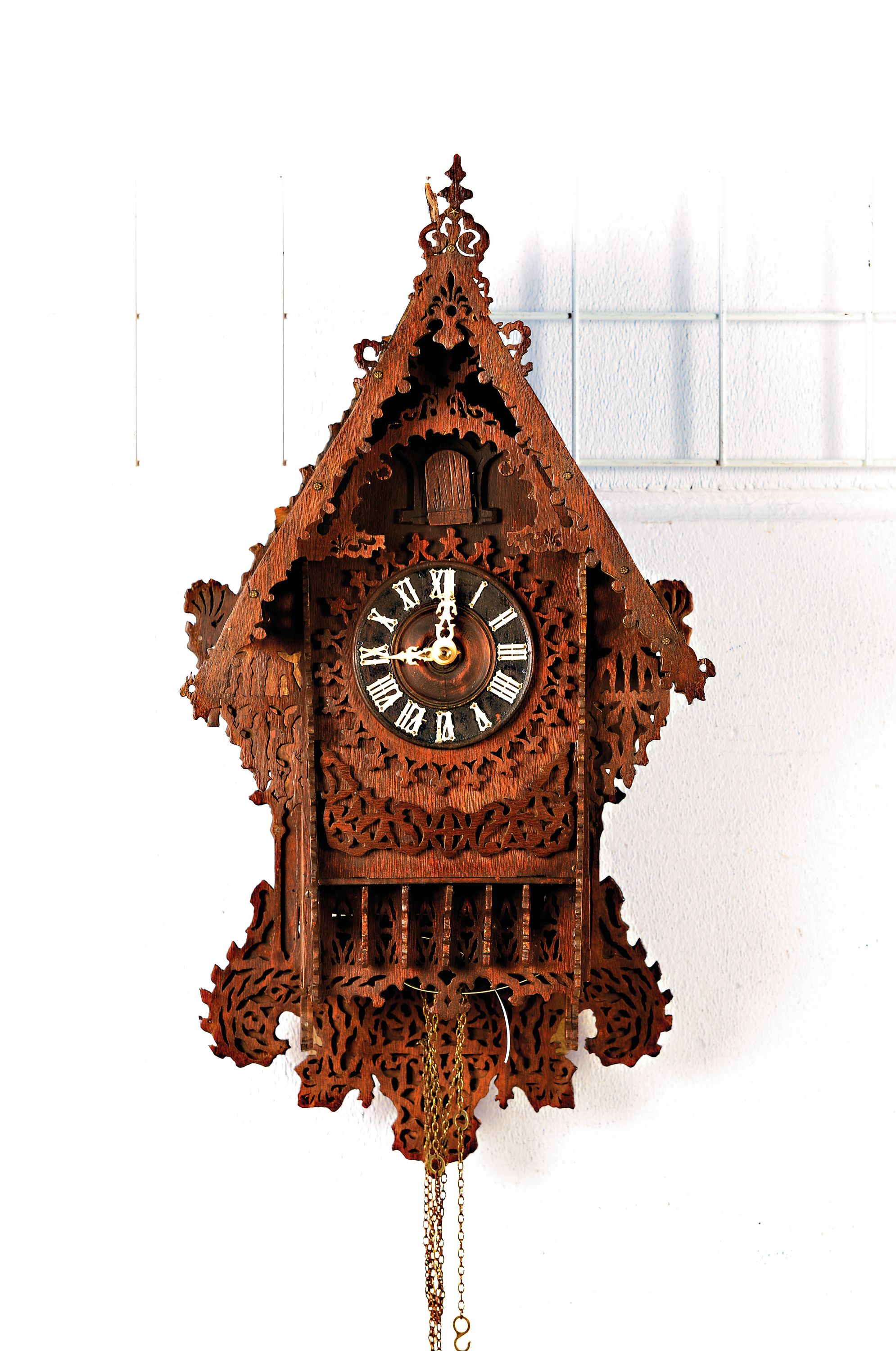 des Kuckucks (ohne Tonfeder), Pfeifen intakt, Antrieb über Ketten und Gewichte,