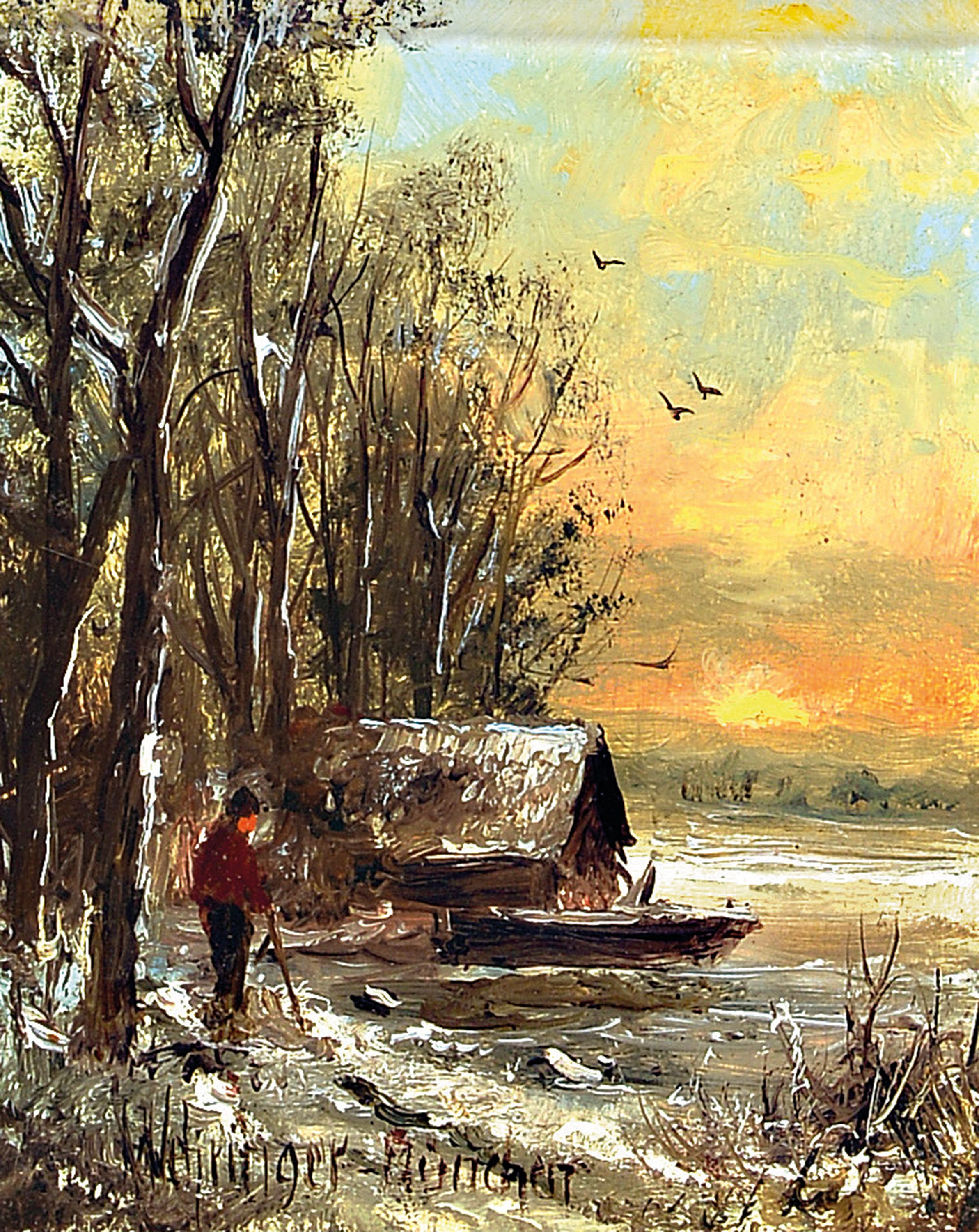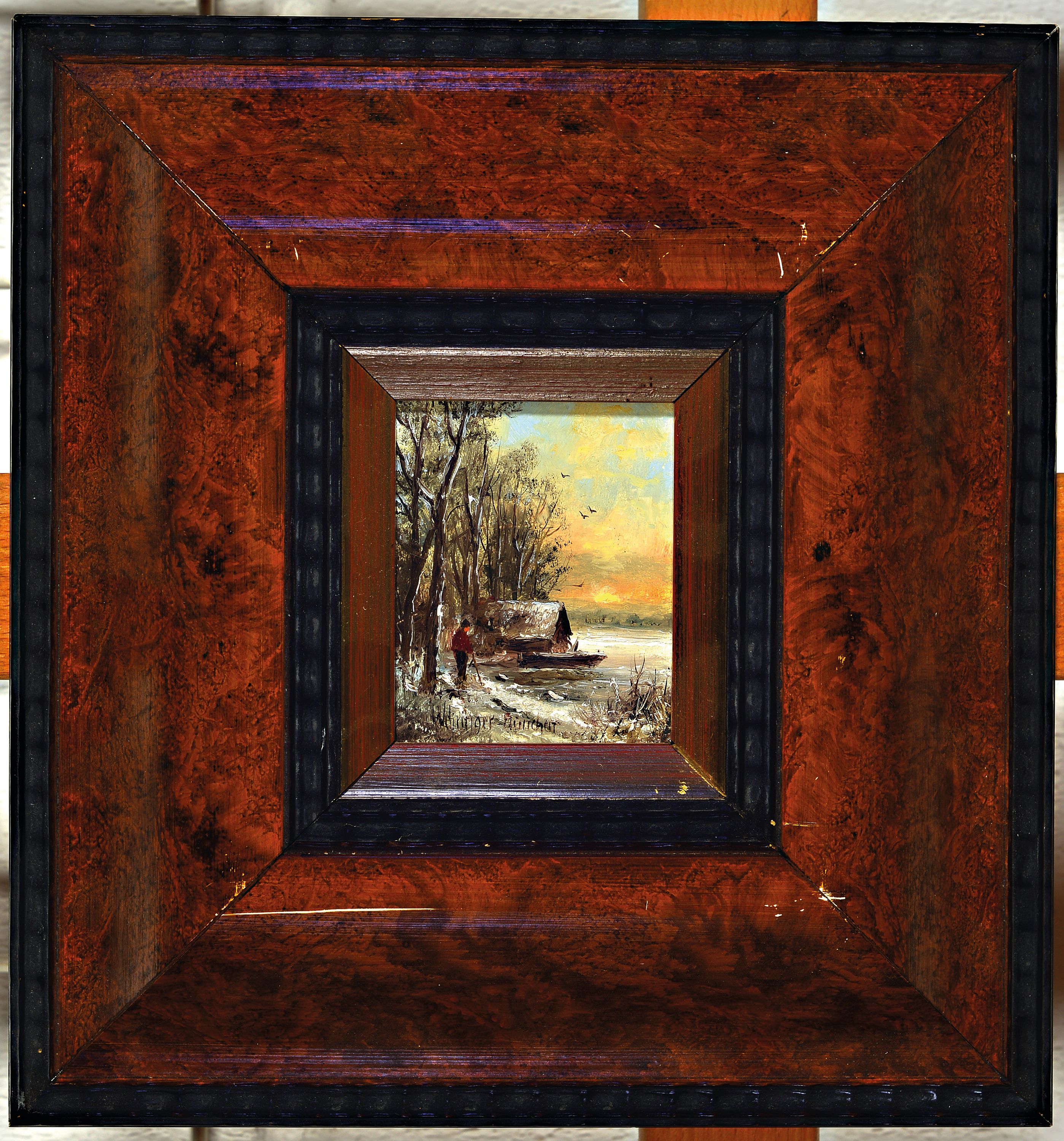 / am zugefrorenen See", 1x "Angler am See", Öl/Holzplatte 8x7 / 6,5x11 cm, Rahmen