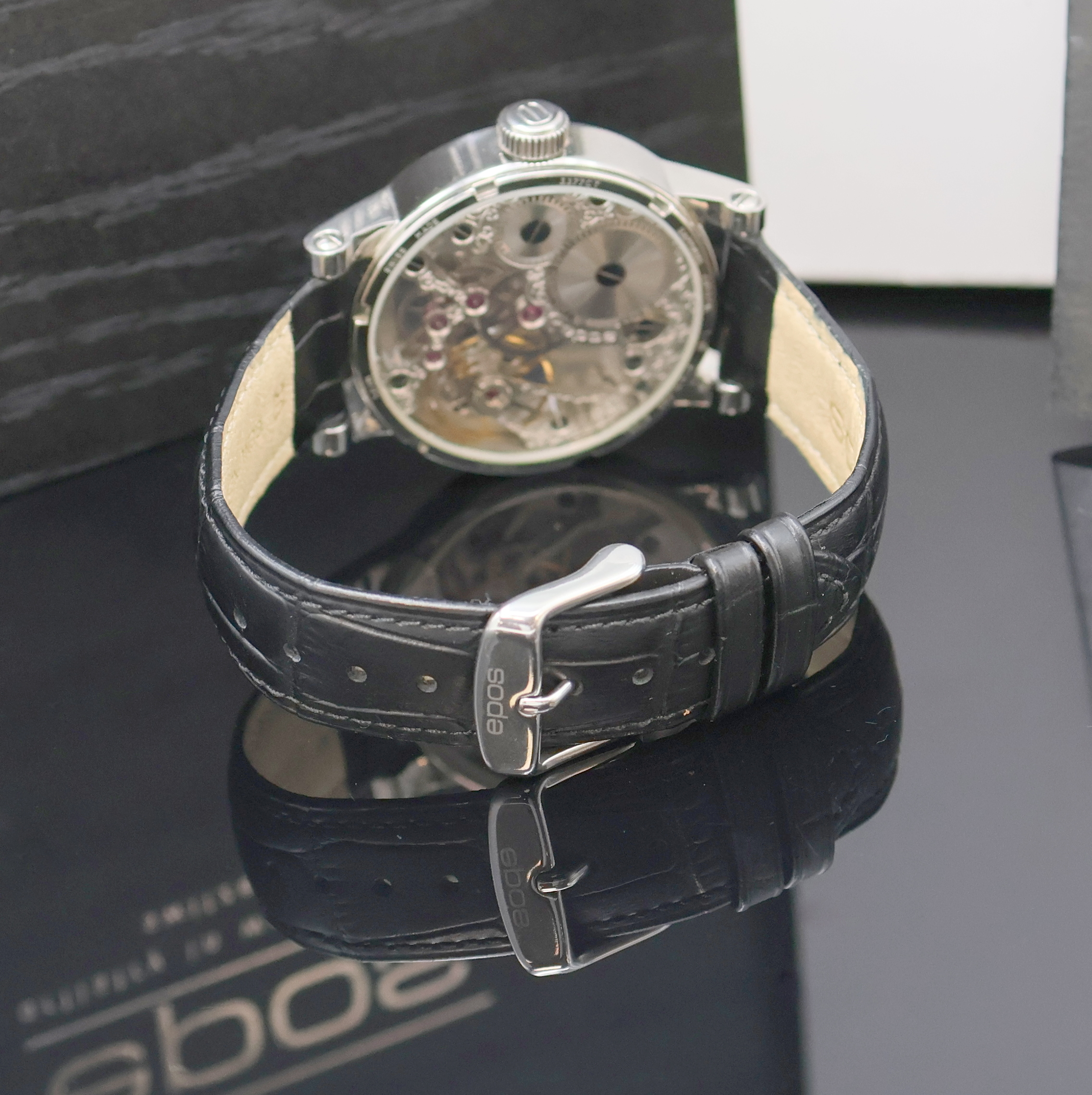 silb. Breguet-Zeiger, rhod. grav. Werk Kal. ETA 6498-1, D. ca 41 mm, Etui u. Garantie