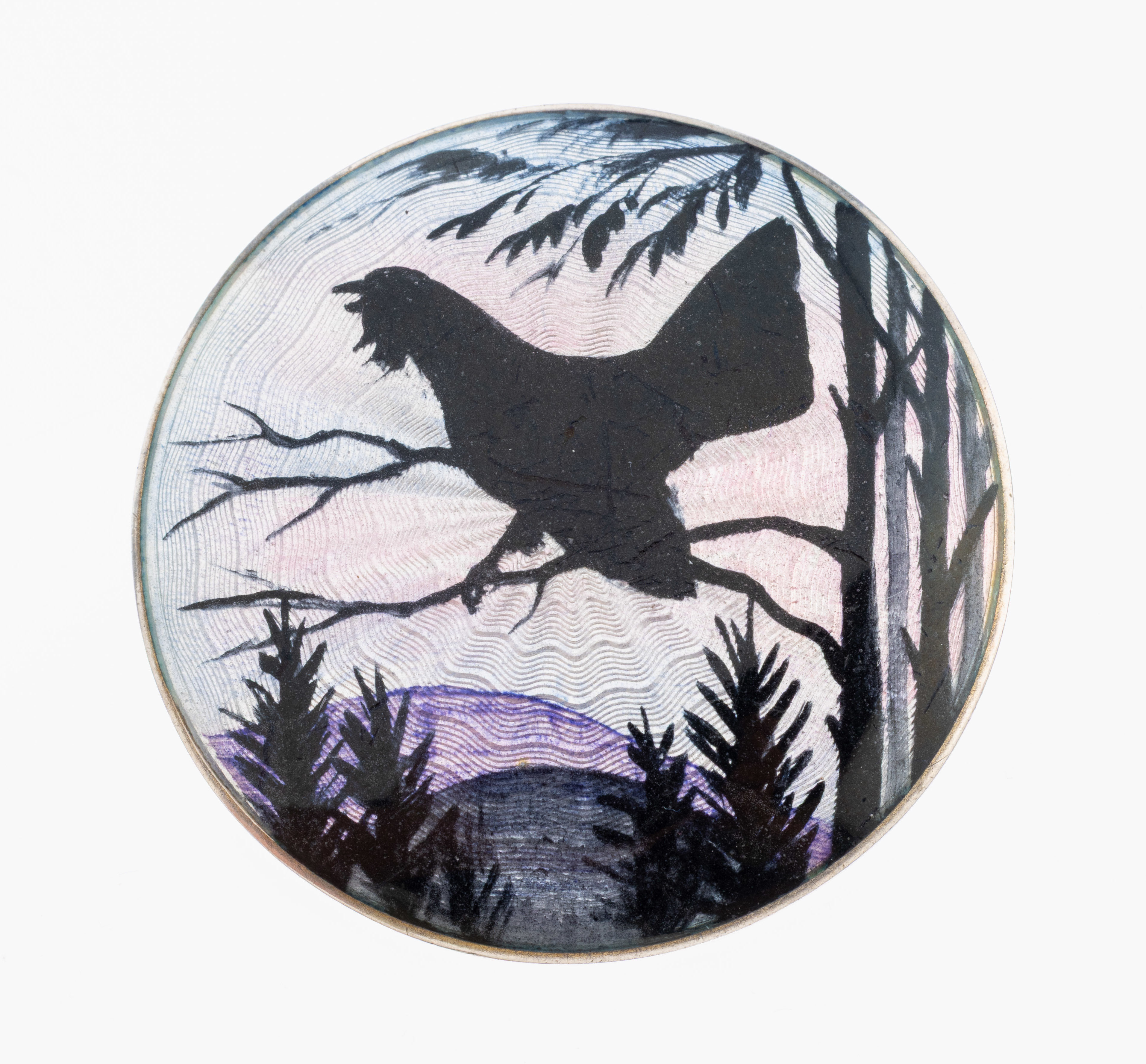 inweiß, lila, blau und schwarz, Landschaftsdarstellung mit Auerhahn auf Ast, D.
