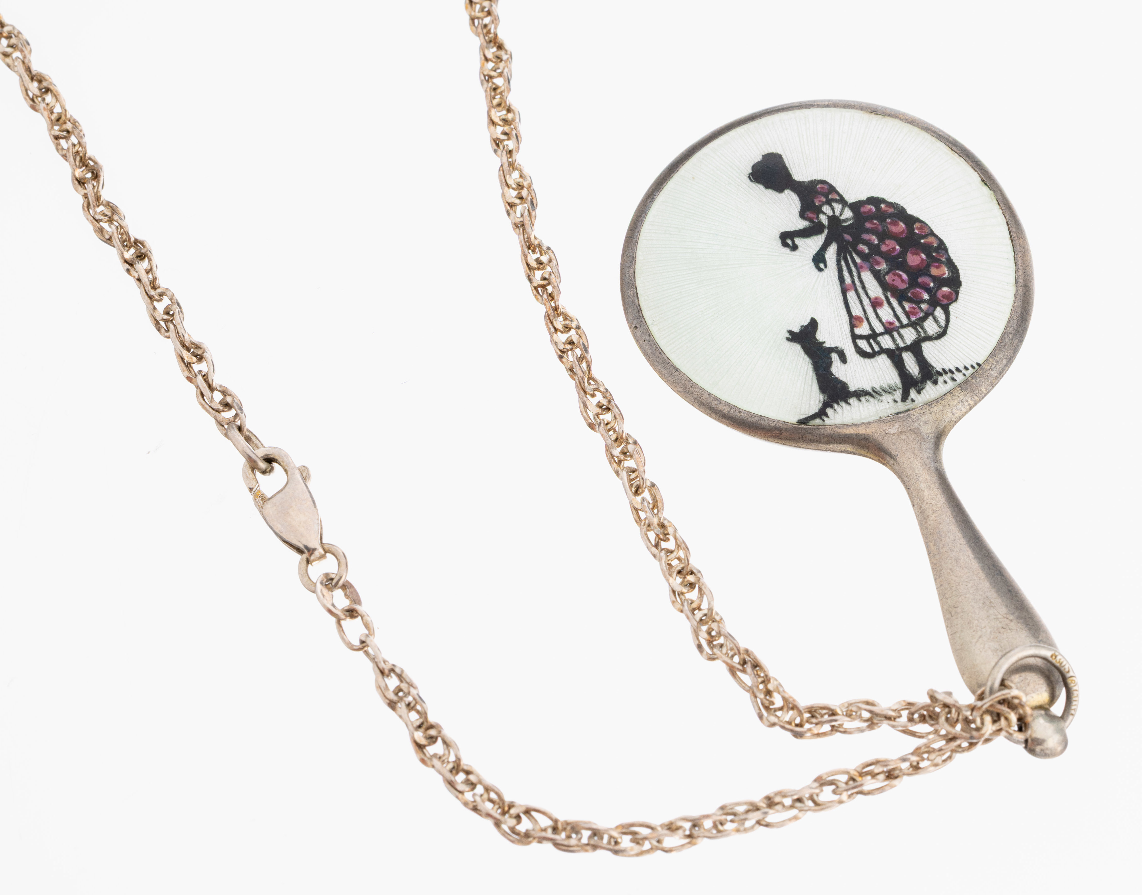 Anhänger mit Email, 830er Silber, in Form eines kl. Spiegels, galante Darstellung
