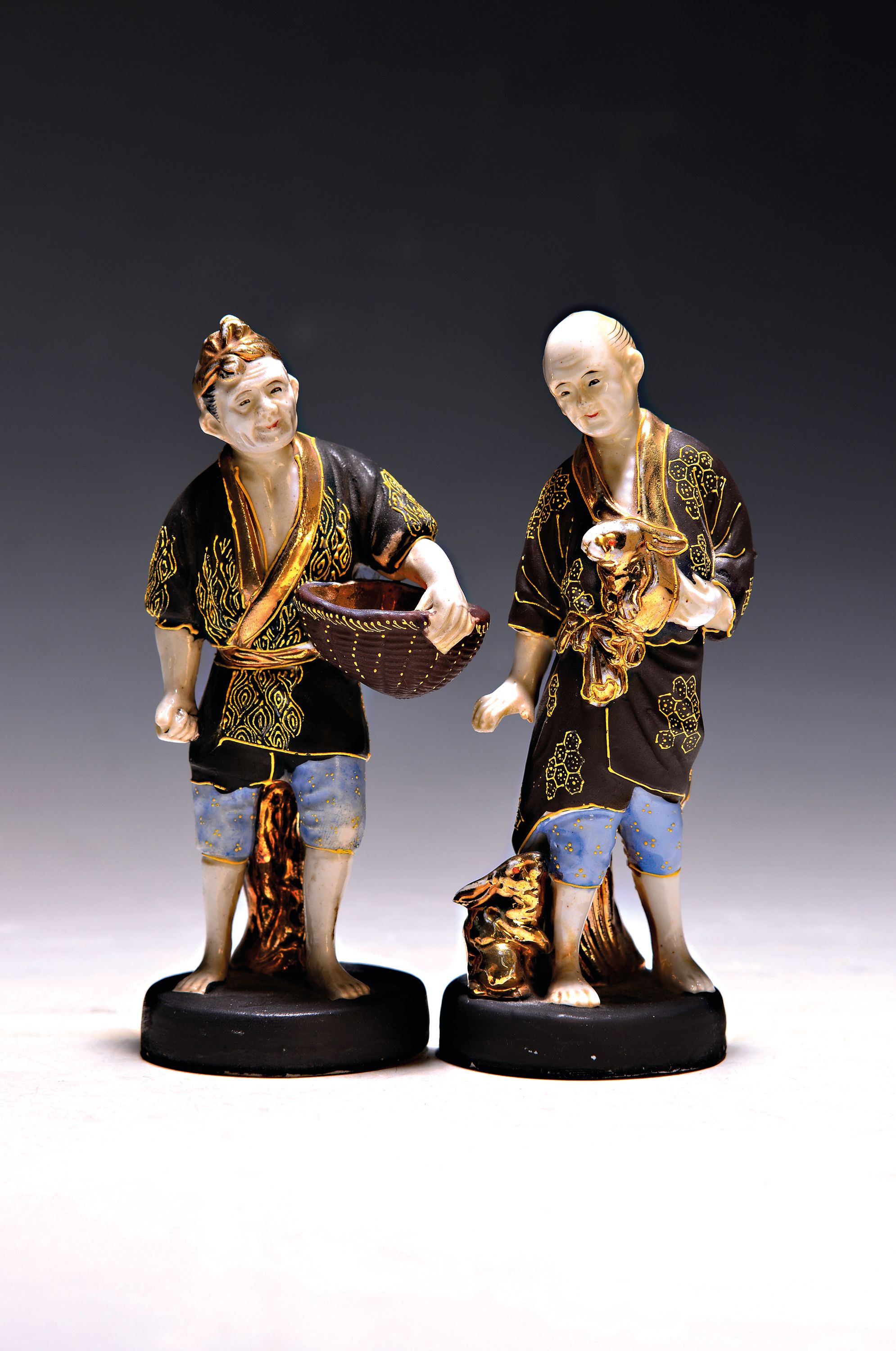 Paar Figuren, Satsuma, um 1910/20, Porzellan, Bauer mit Hasen und sähender Bauer,
