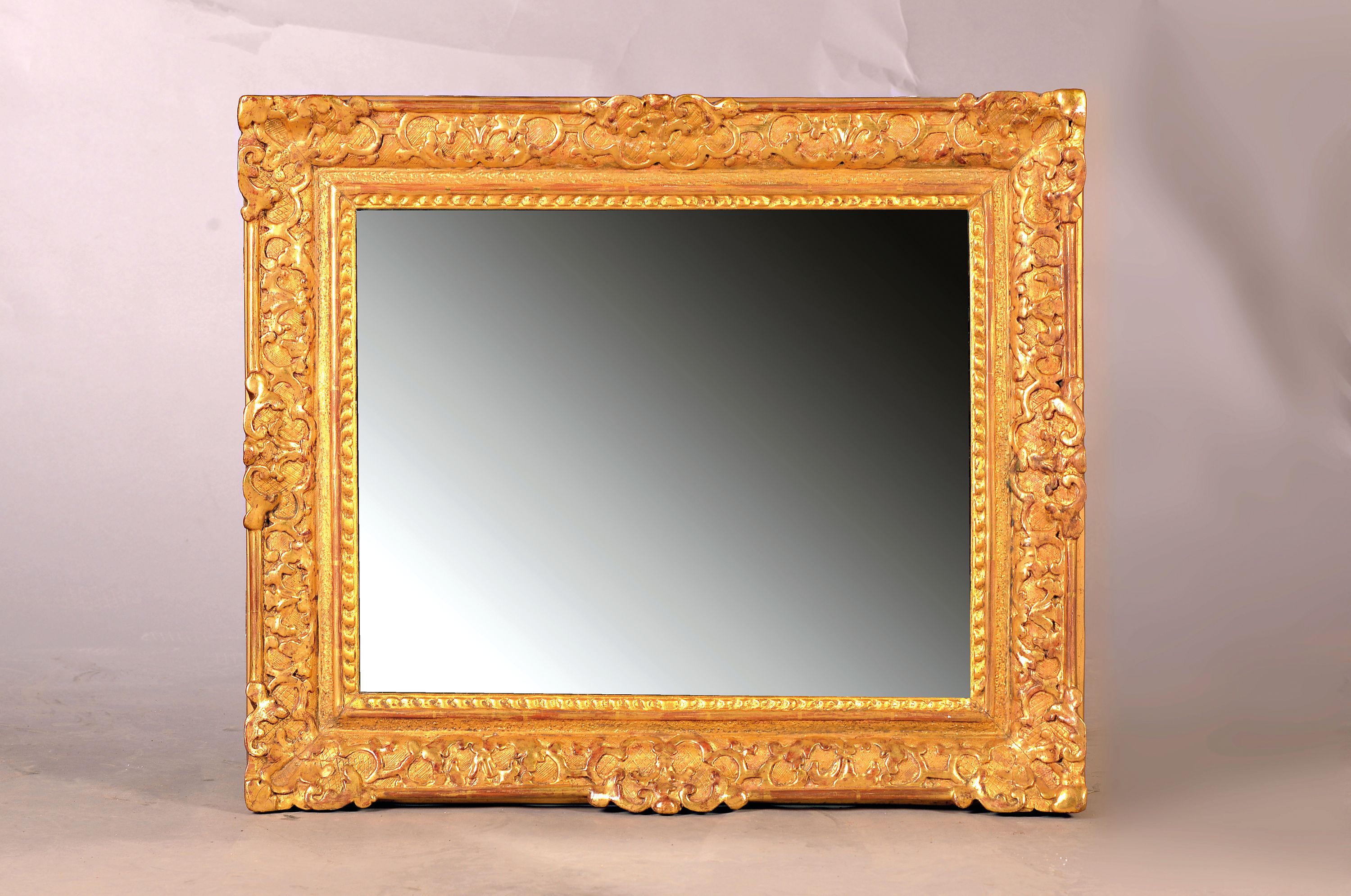 Prunkrahmen mit Spiegel, 19.Jh., Holzrahmen mit Stuckdekor, vergoldet, barockisierende Stilelemente, ALterssp., 64x74 cm