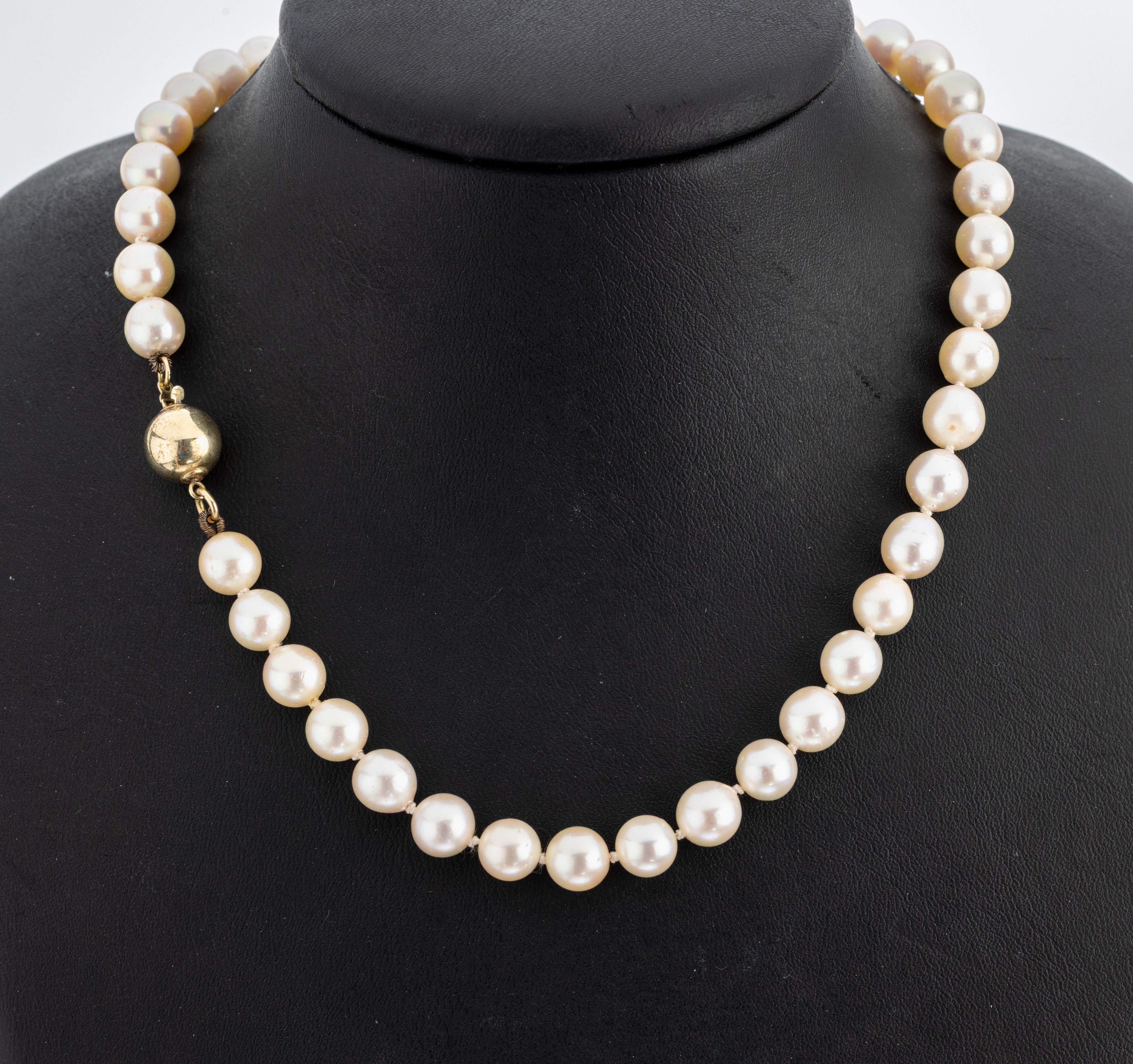 Zuchtperl-Collier, Akoyazuchtperlen, D. ca.7.4 mm, Kugelschließe 925er Silber verg., L. ca. 83 cm