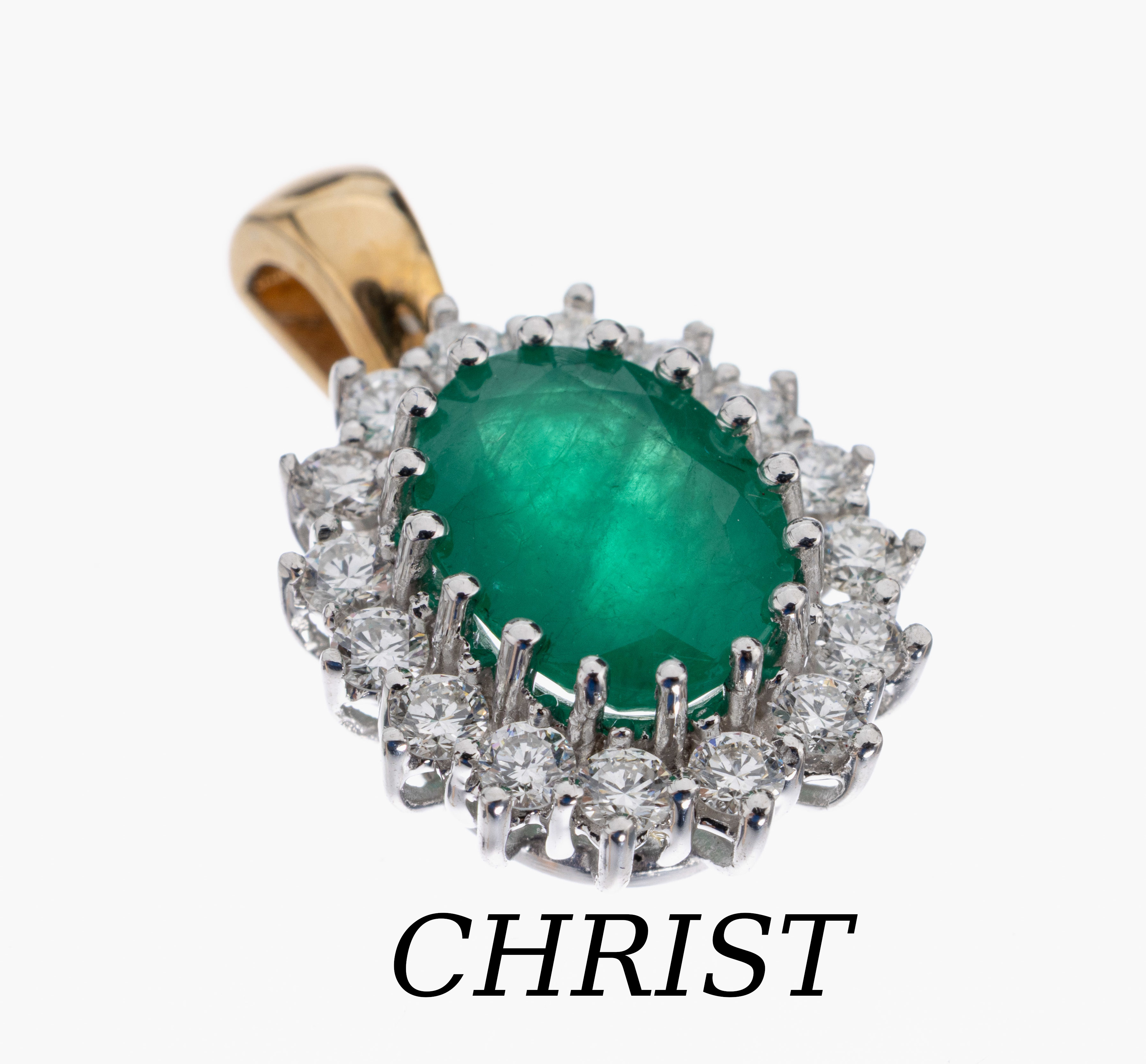 14 kt Gold CHRIST Smaragd-Brillant-Anhänger, WG/GG 585/000, mittig ovalfacett. Smaragd