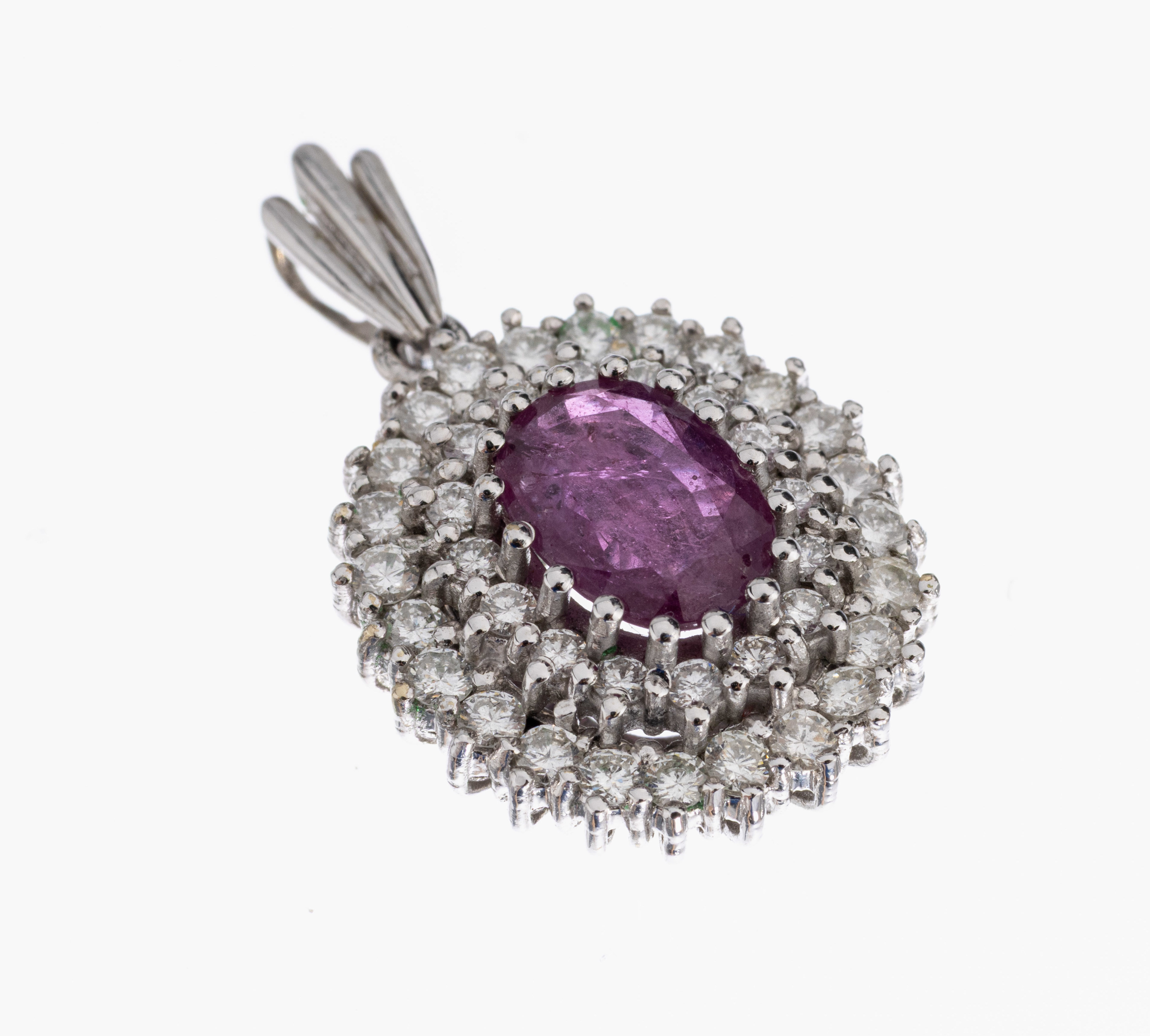 14 kt Gold Rubin-Brillant-Anhänger, WG 585/000, mittig ovalfacett. Rubin ca. 0.80 ct,umgeben von 40 Brillanten zus. ca. 1.50 ct Weiß/si, ca. 4.2 g
