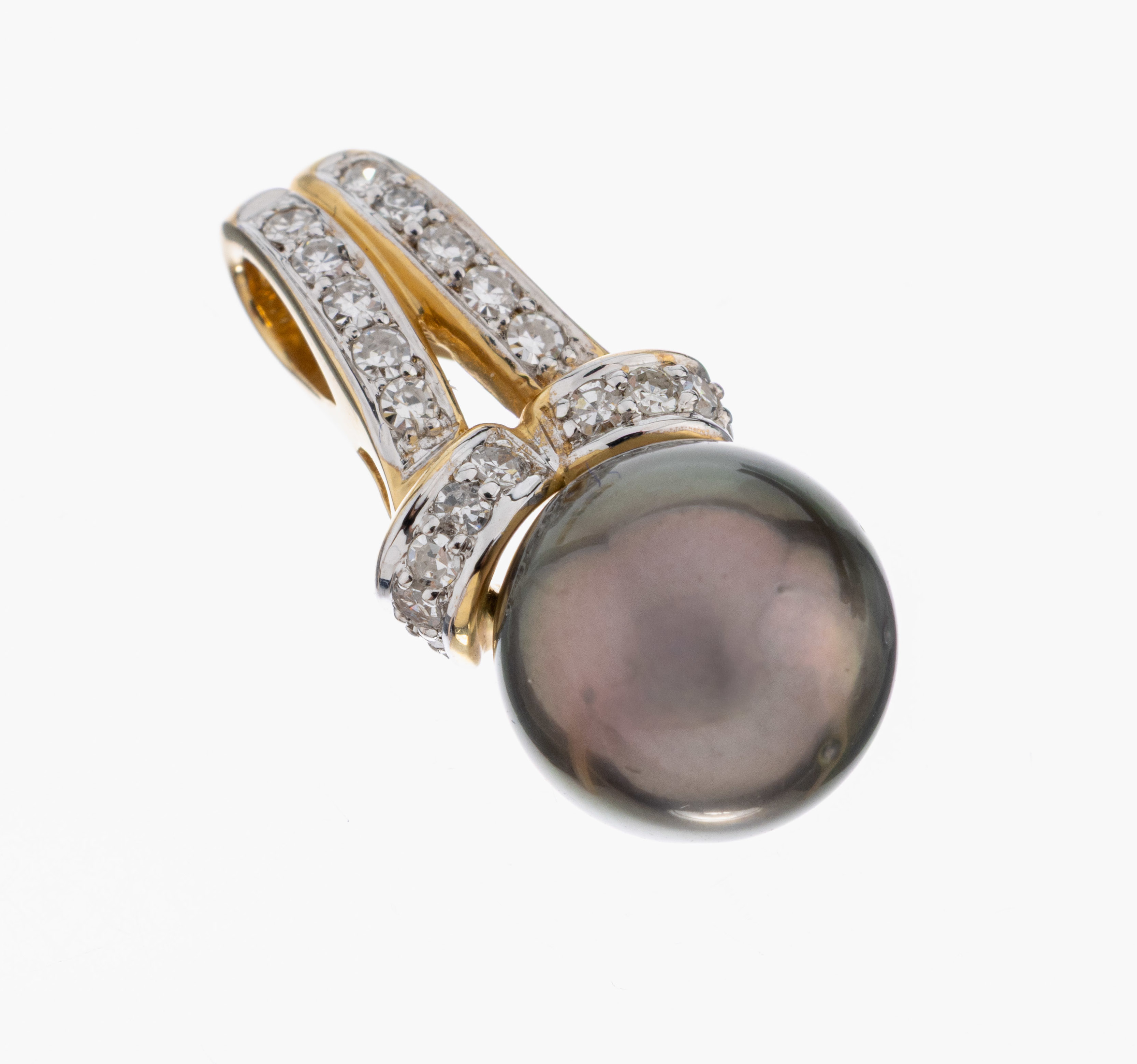 14 kt Gold Perl-Diamant-Anhänger, GG 585/000, graue Tahitizuchtperle, D. ca. 9.2