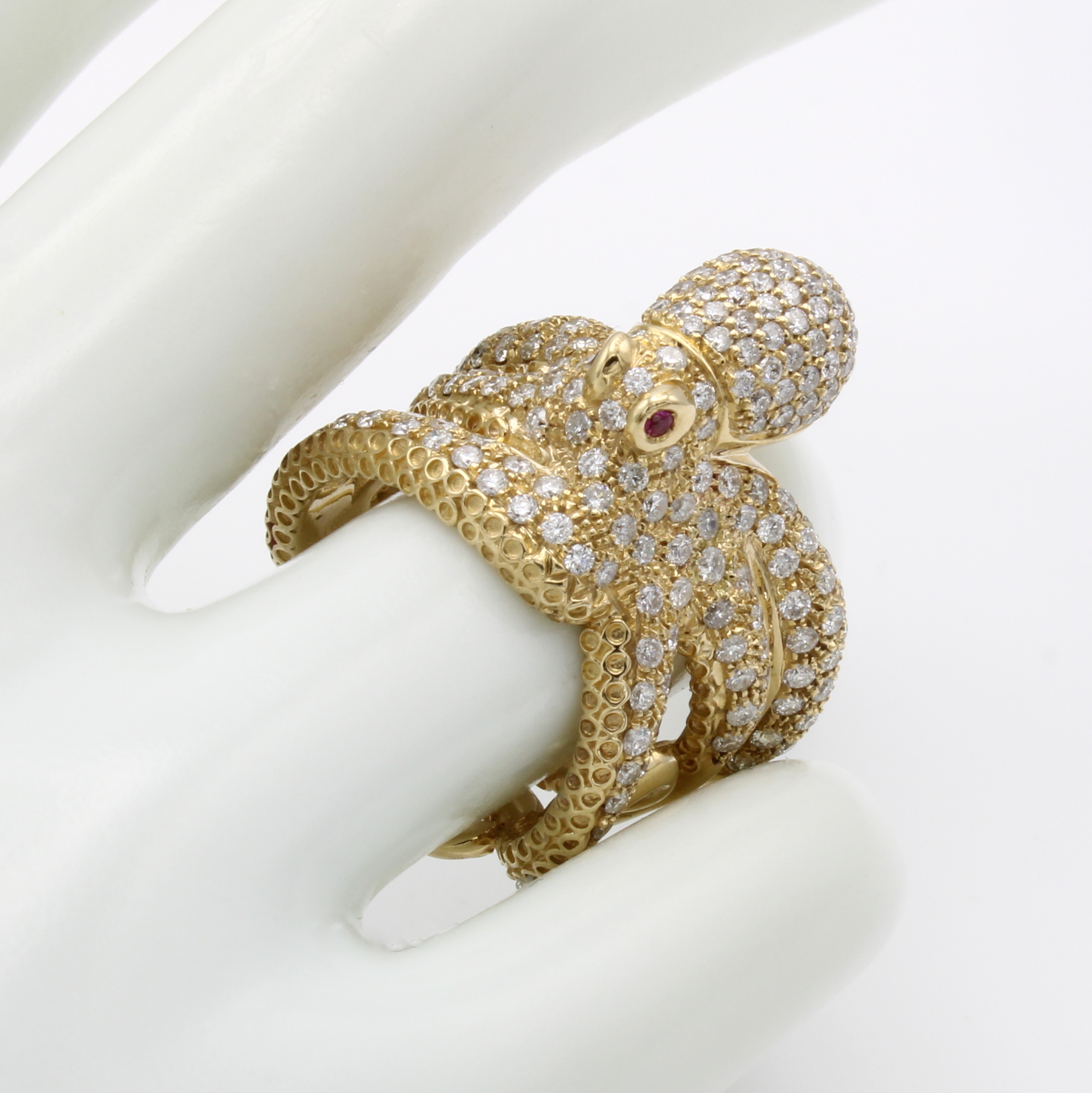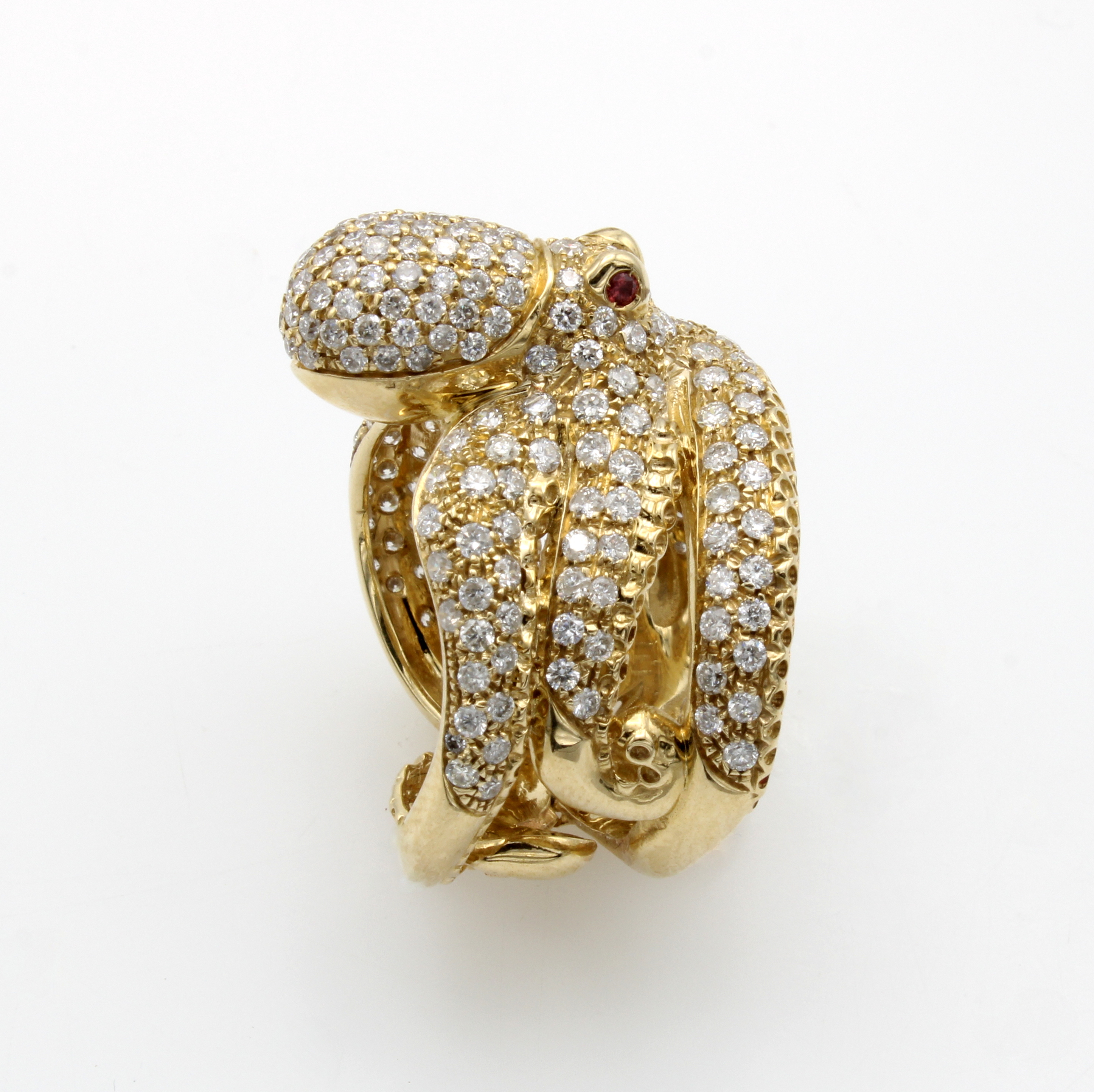 Ring "Krake" mit Brillanten und Rubinen, GG 585/000, ganzer Ring als Krakenkörper gearb., 2 fac. Rubine als Augen, Brill. zus. ca. 2.63 ct Weiß/p, RW ca. 54 Schätzpreis: 11340, - EUR