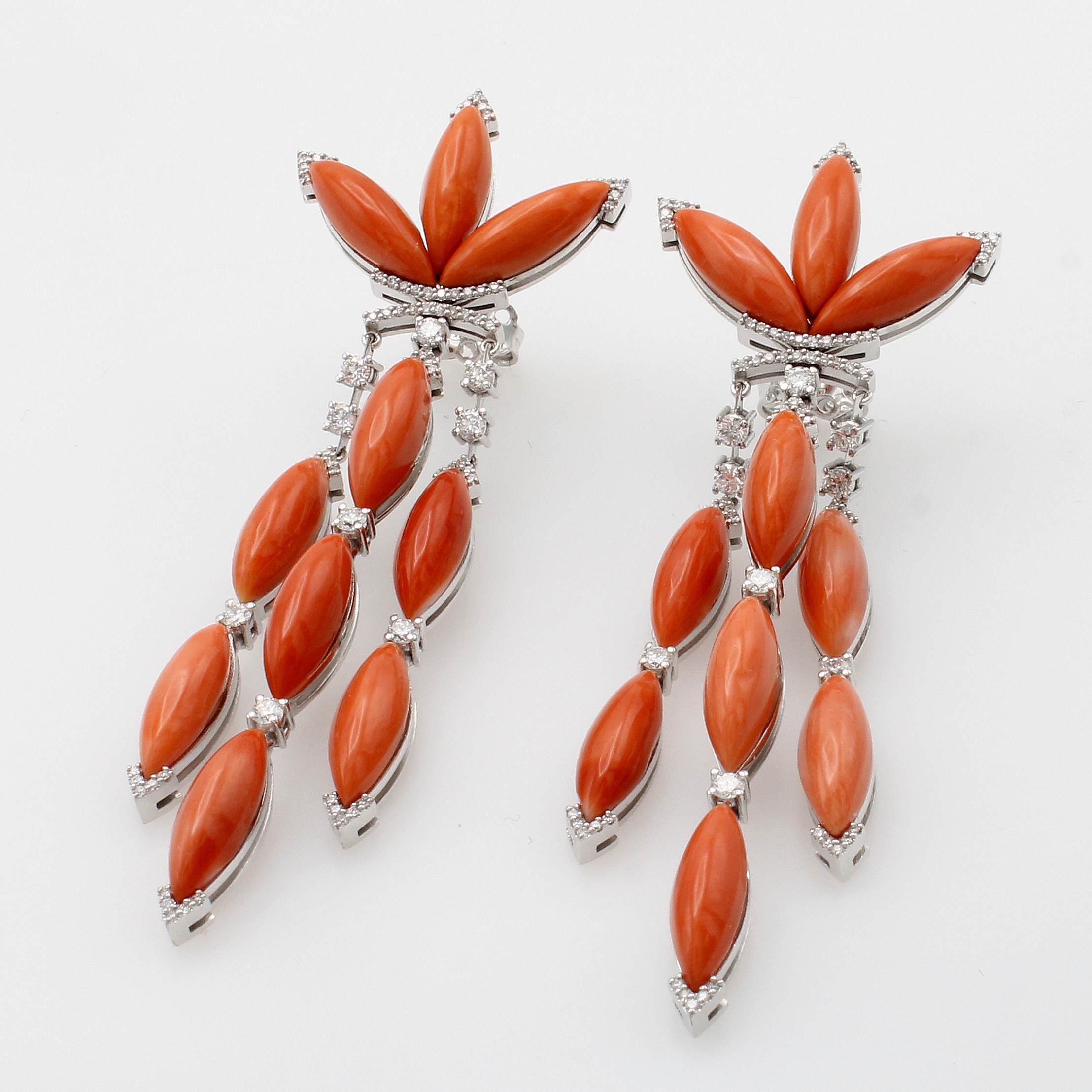 Paar Ohrgehänge mit Koralle und Brillanten, WG 750/000, 3 Reihen Abhängungen, navetteförm.Korallen,