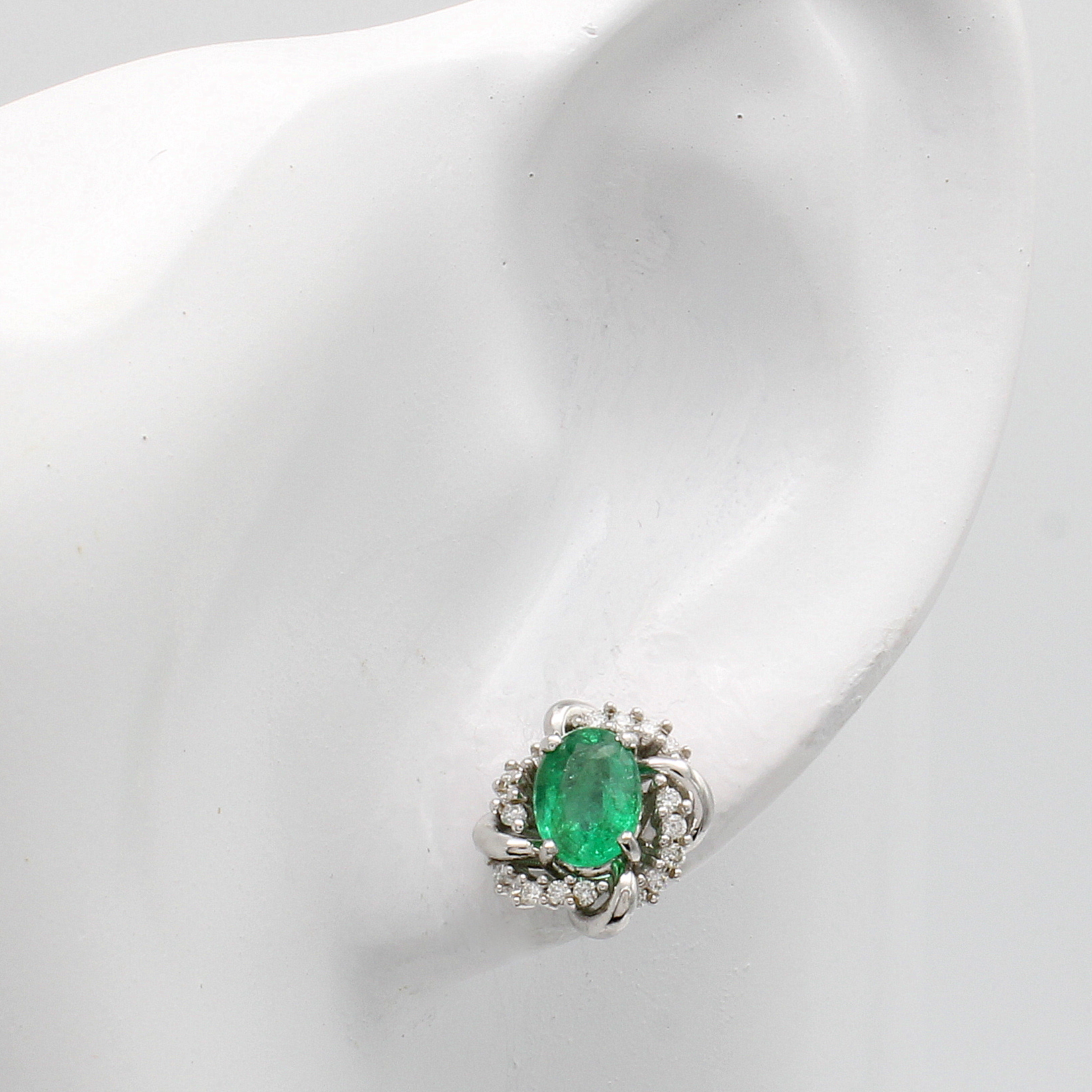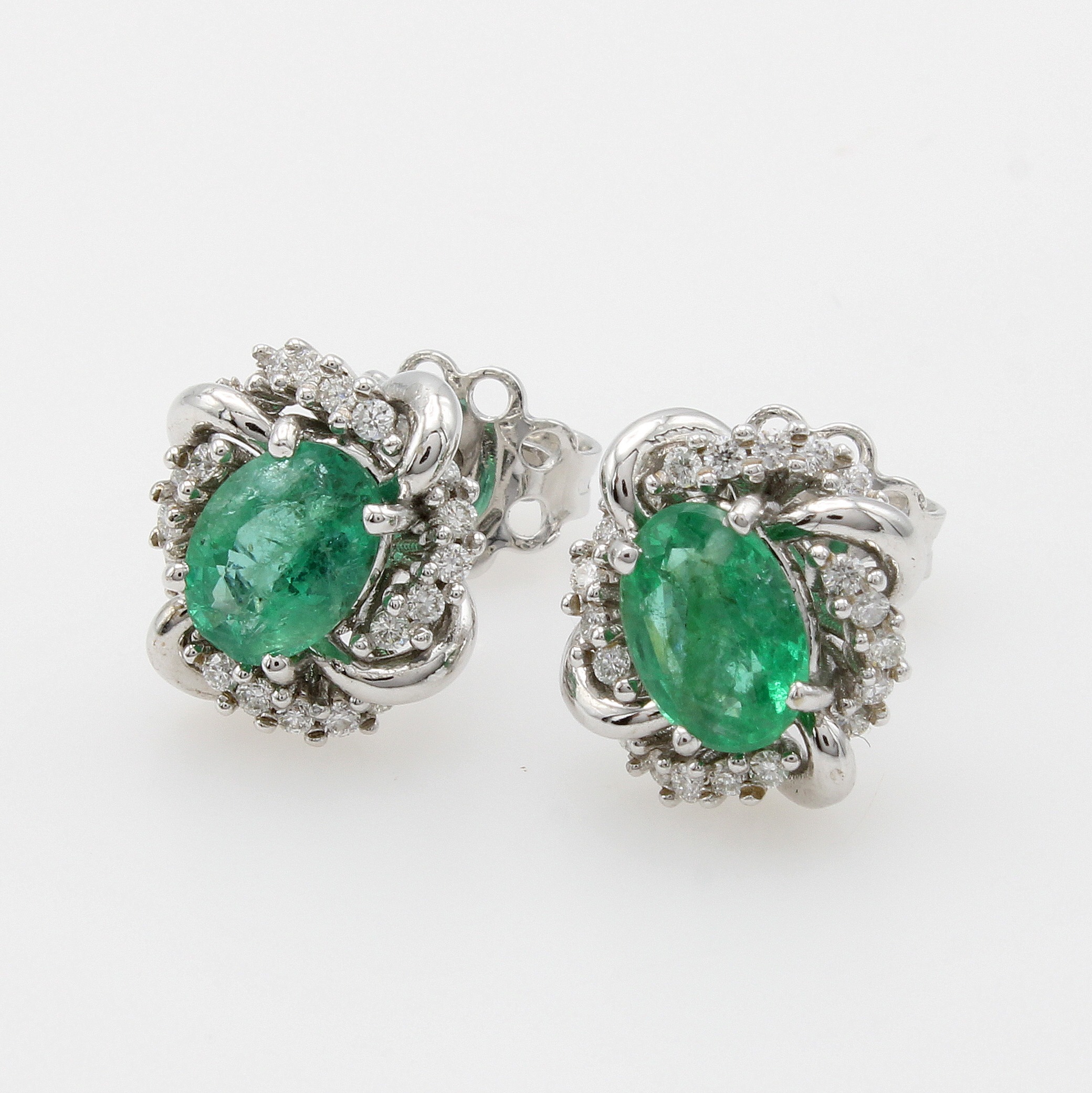 Paar Ohrstecker mit Smaragden und Brillanten, WG 750/000, 2 ovale, fac. Smaragde zus. ca.1.26 ct umgeben v. Brill. in verschlungenen Elementen zus. ca. 0.28 ct Weiß/si Schätzpreis: 3000, - EUR