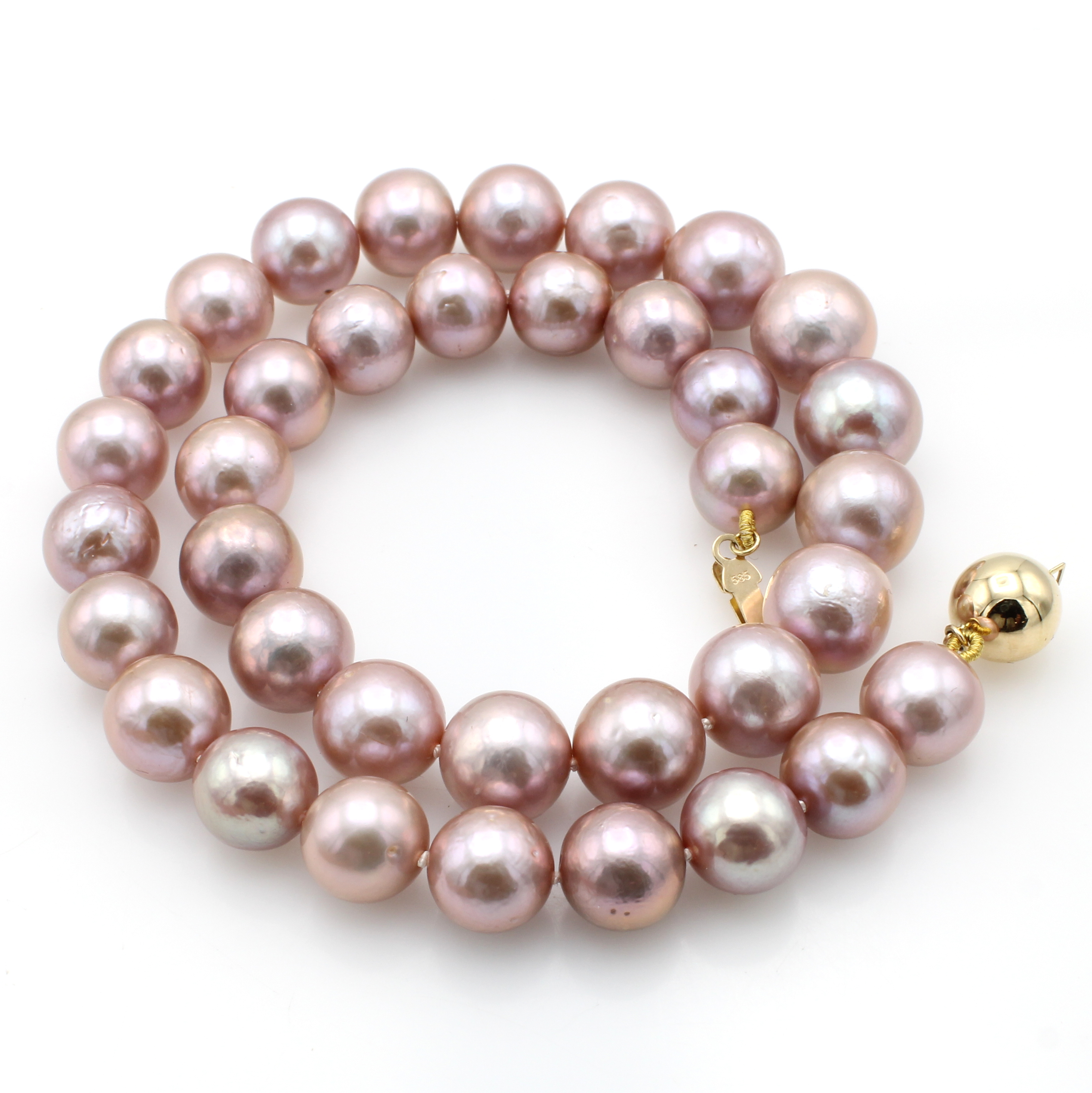 Süßwasserzuchtperlcollier, Kugelschl. GG 585/000, aprikotfarb. Perlen, D. ca. 10.8-12.8mm, L. ca. 44 cm, Schätzpreis EUR 1500.-