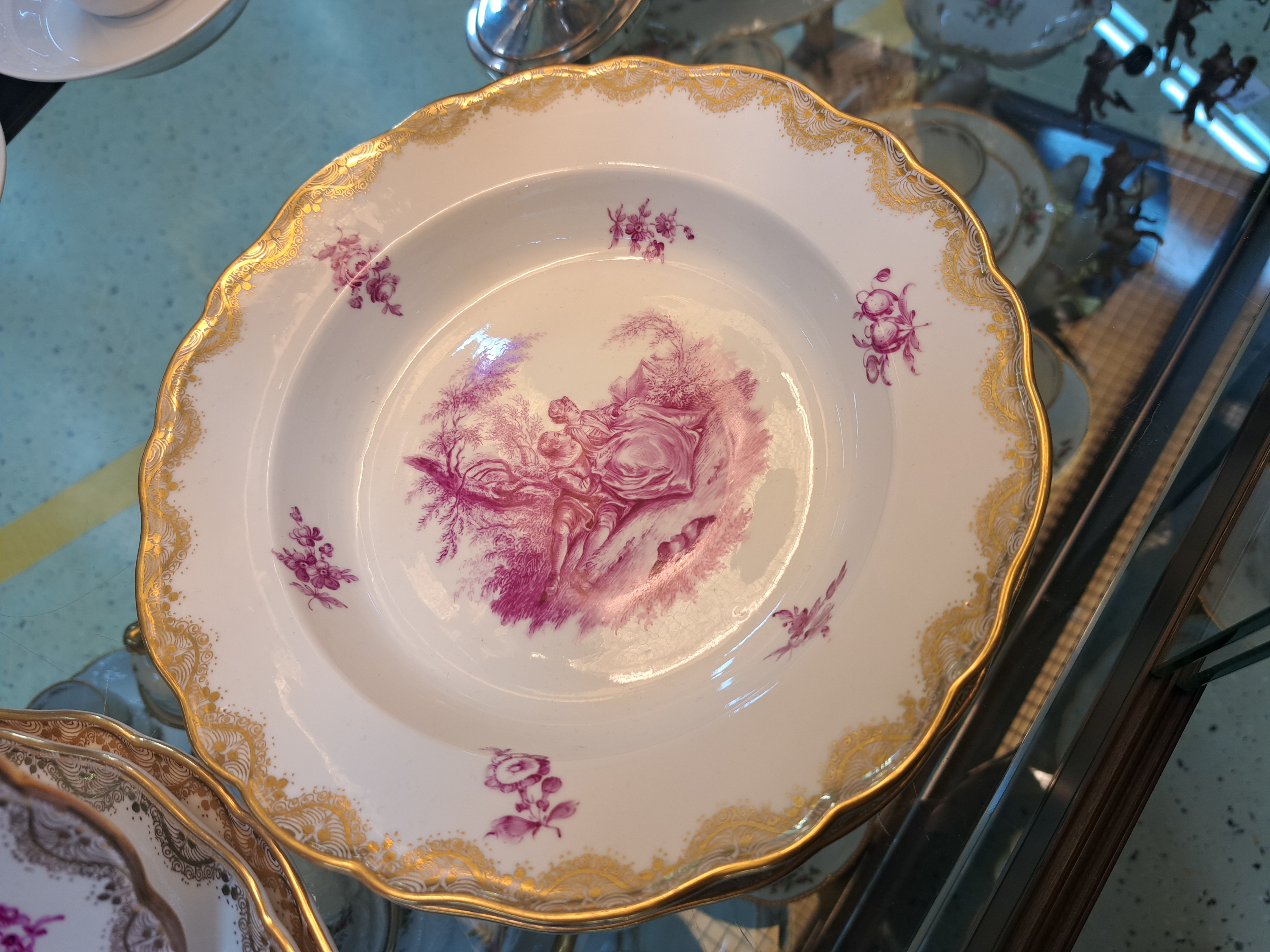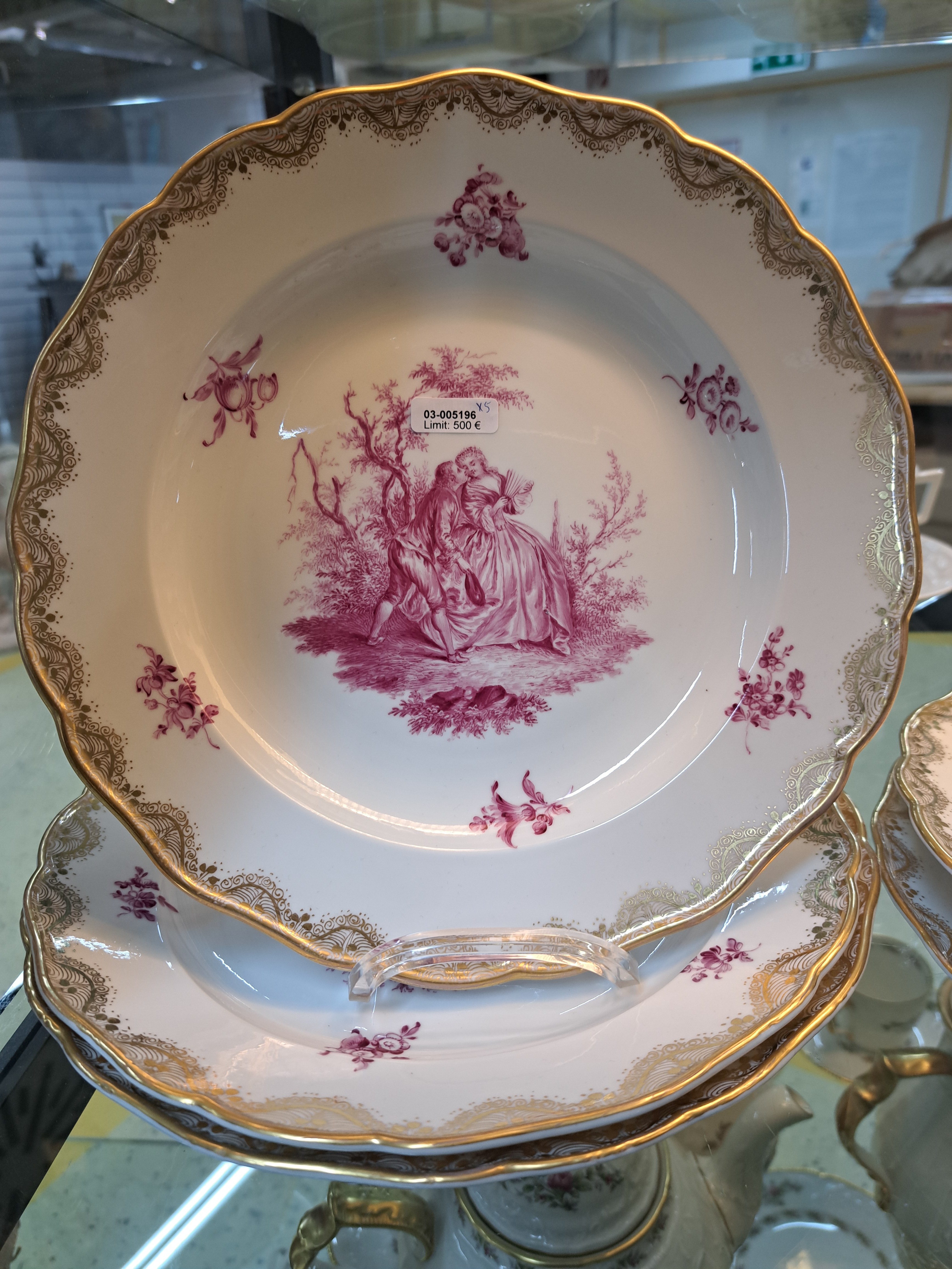 2 .Wahl), purpurrote Camaieau-Malereien galanter Szenen nach Watteau, fein gemalte