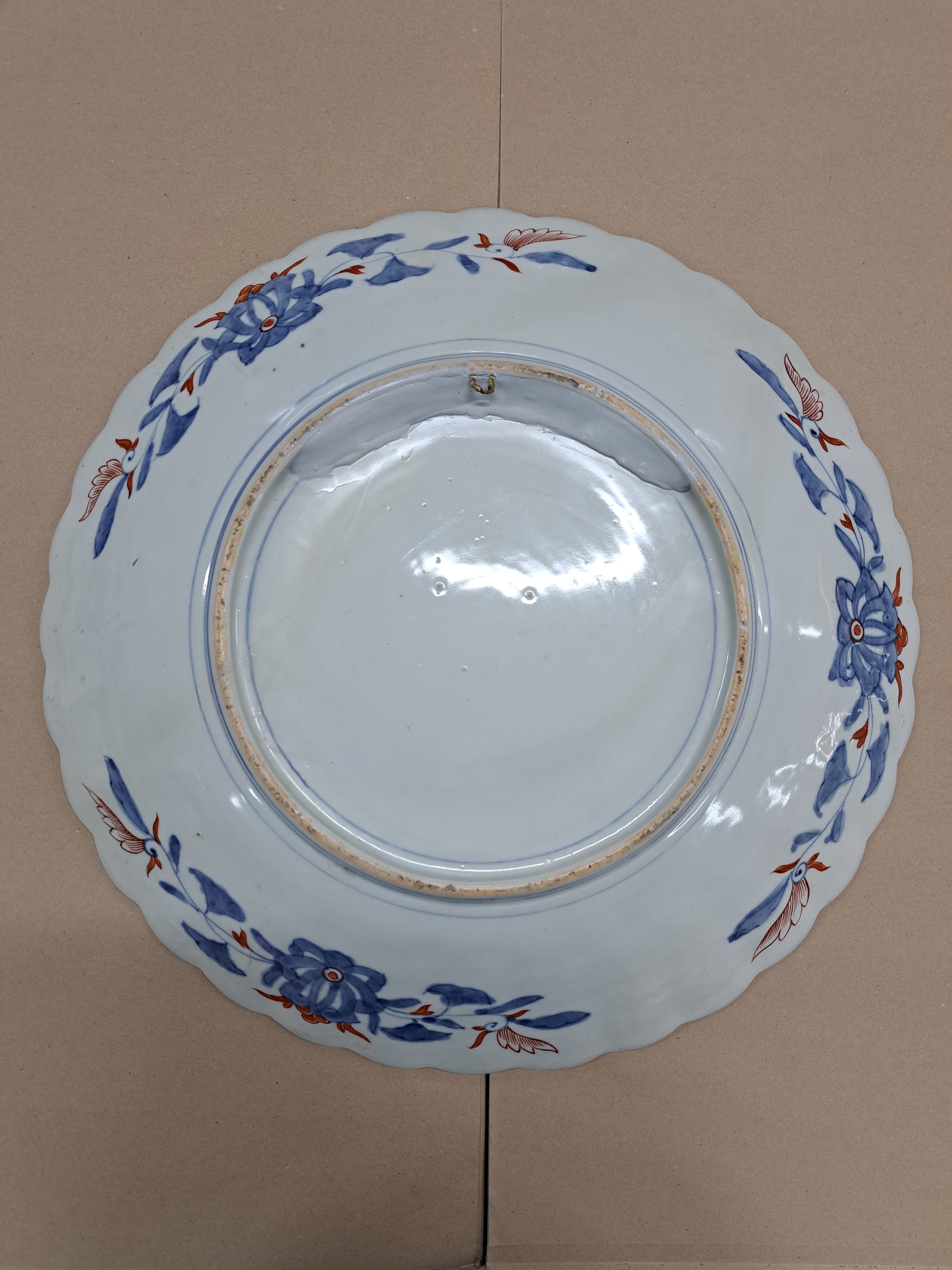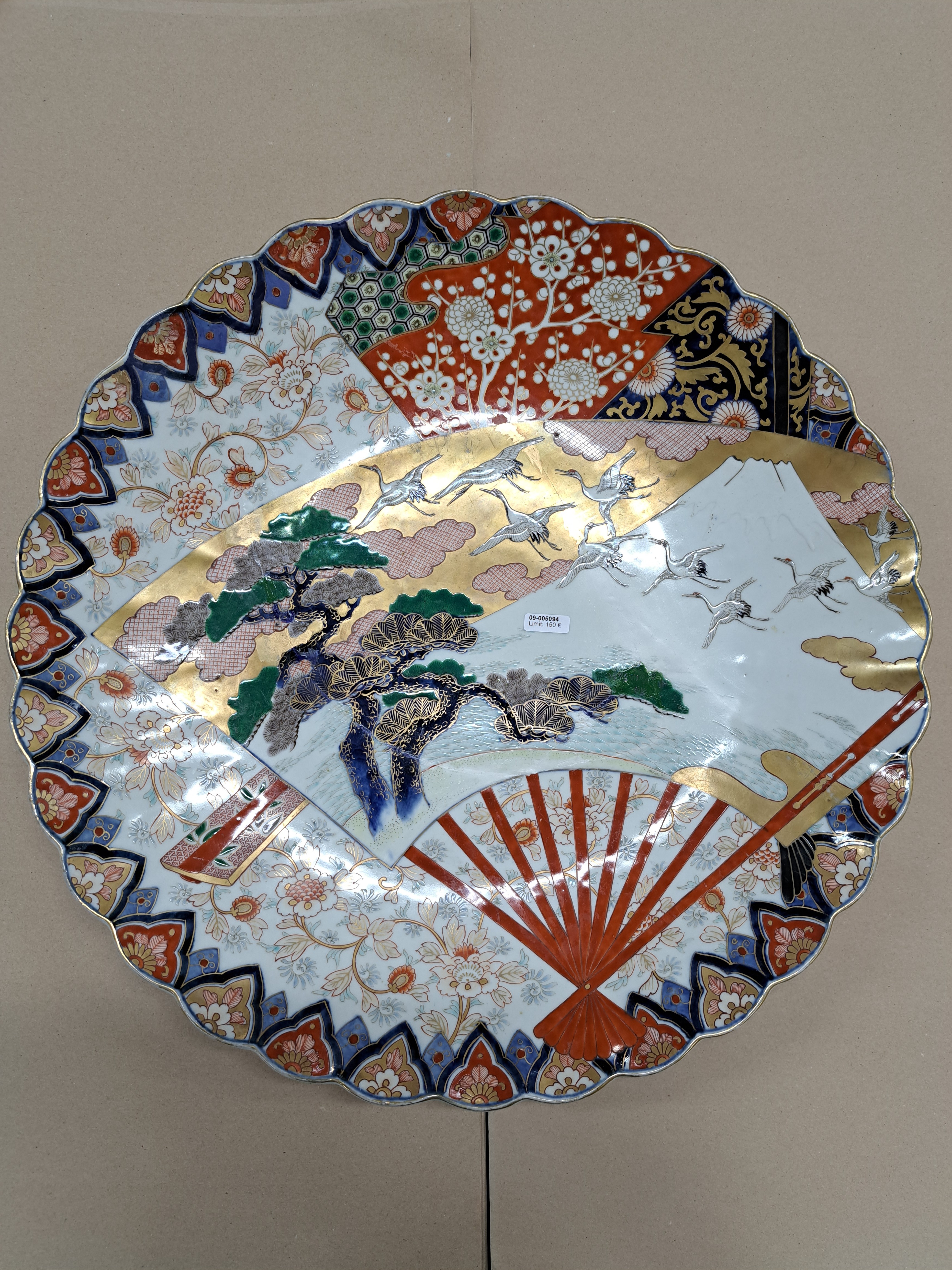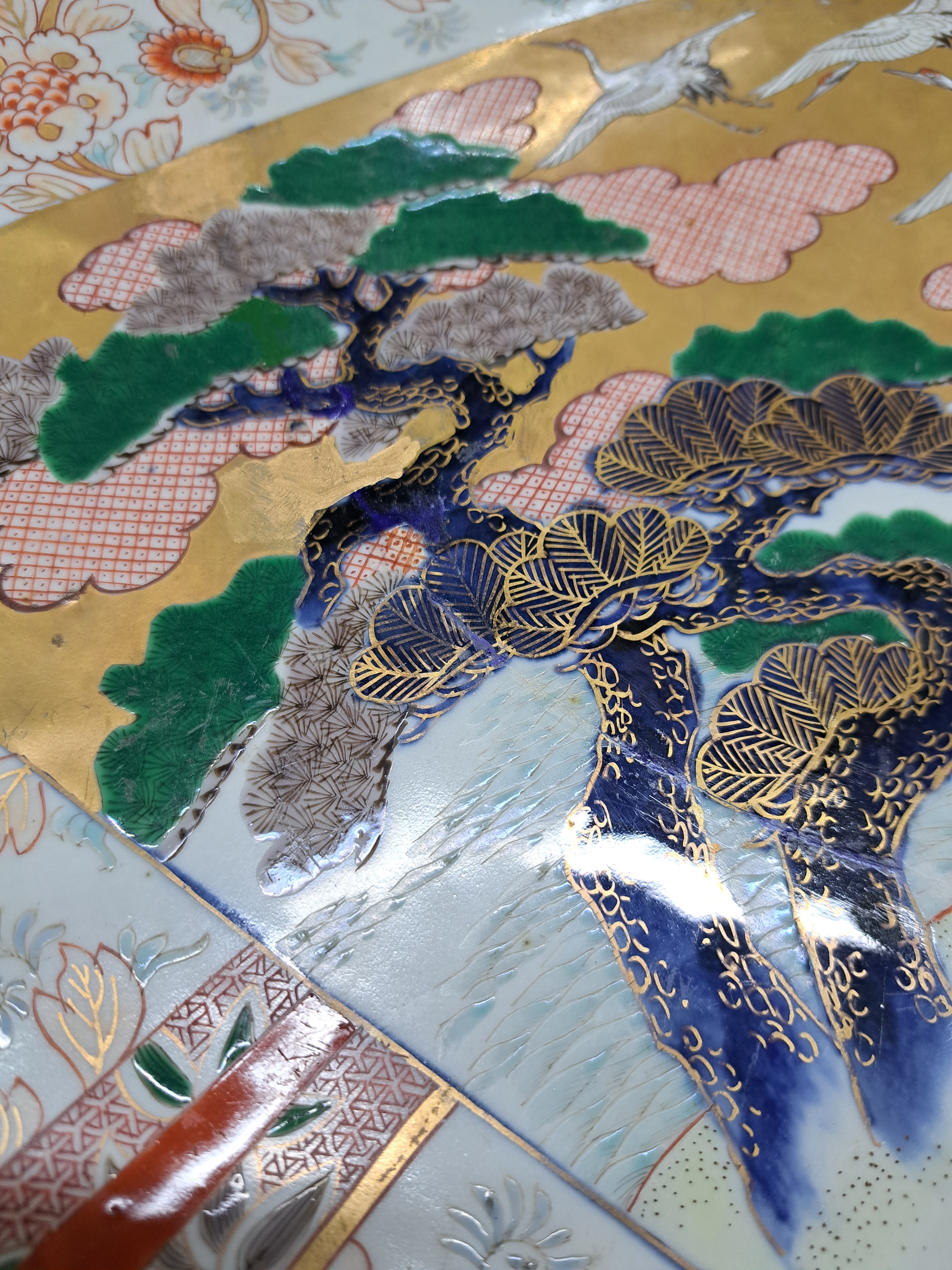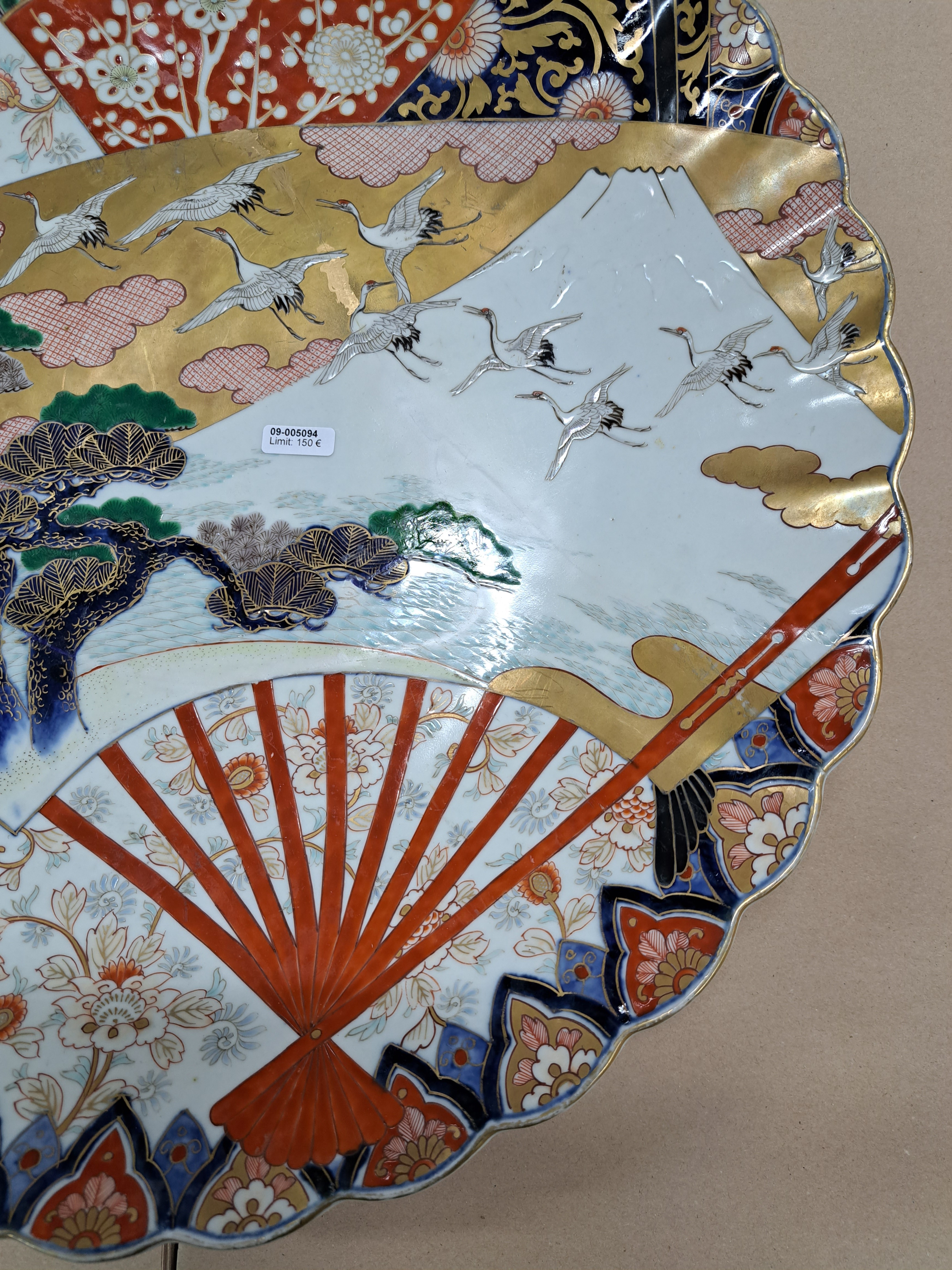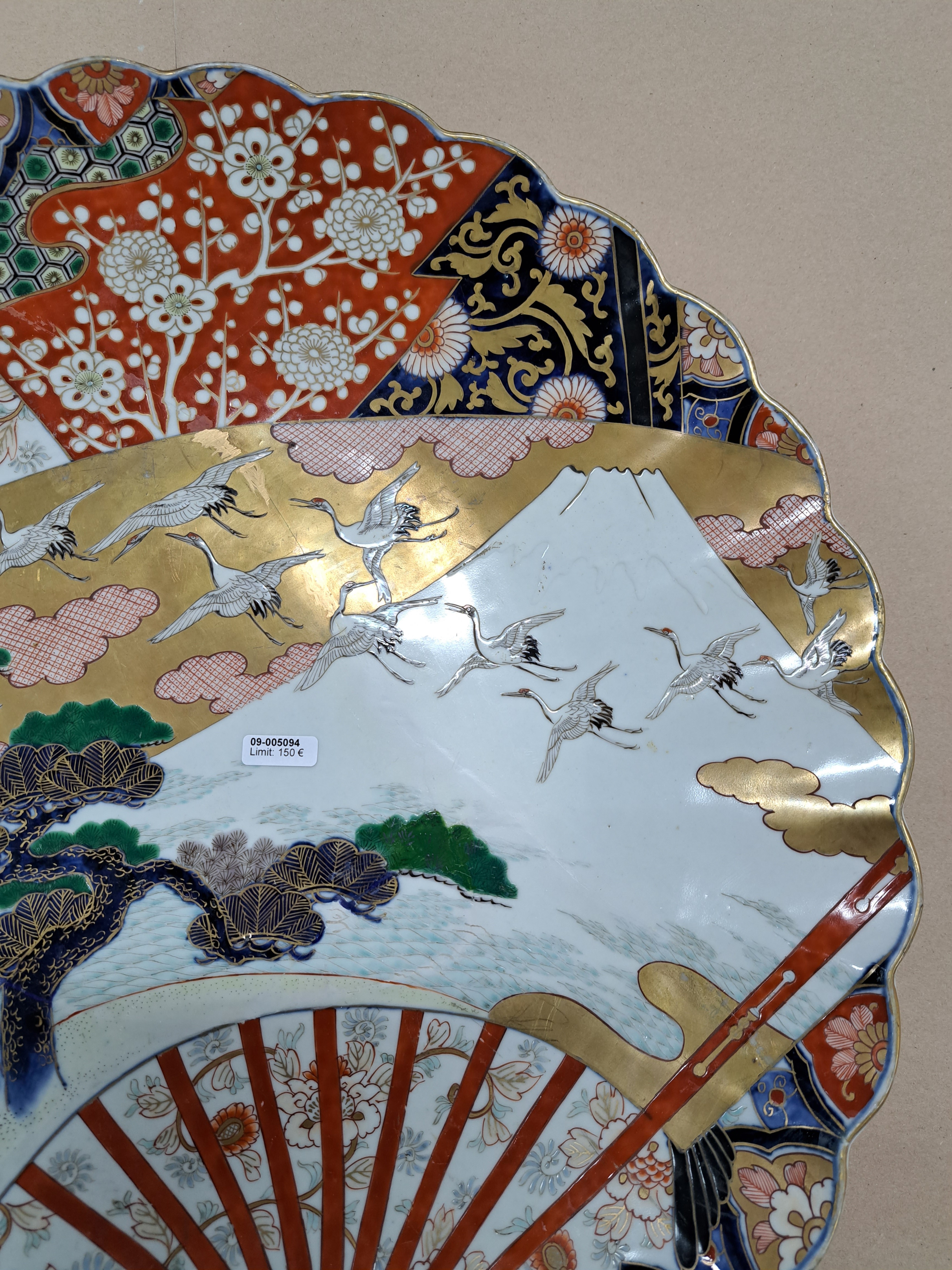 Großer Imari Teller, China, um 1860-70, Porzellan, reiche Feldermalerei von stilisierter Landschaft mit auffliegenden Kranichen, florale Ornamentik, Goldstaffage, rest., D. ca. 56cm