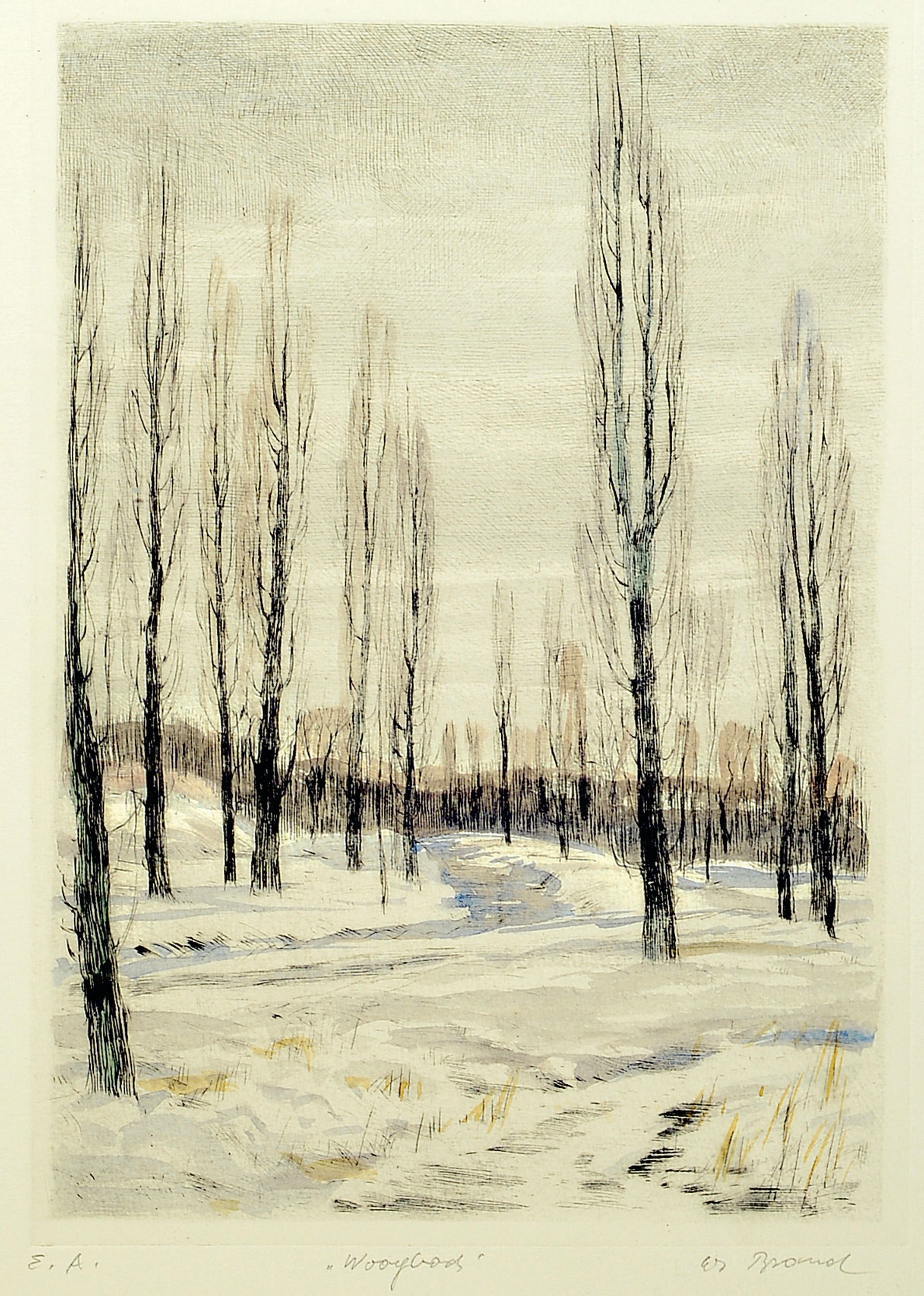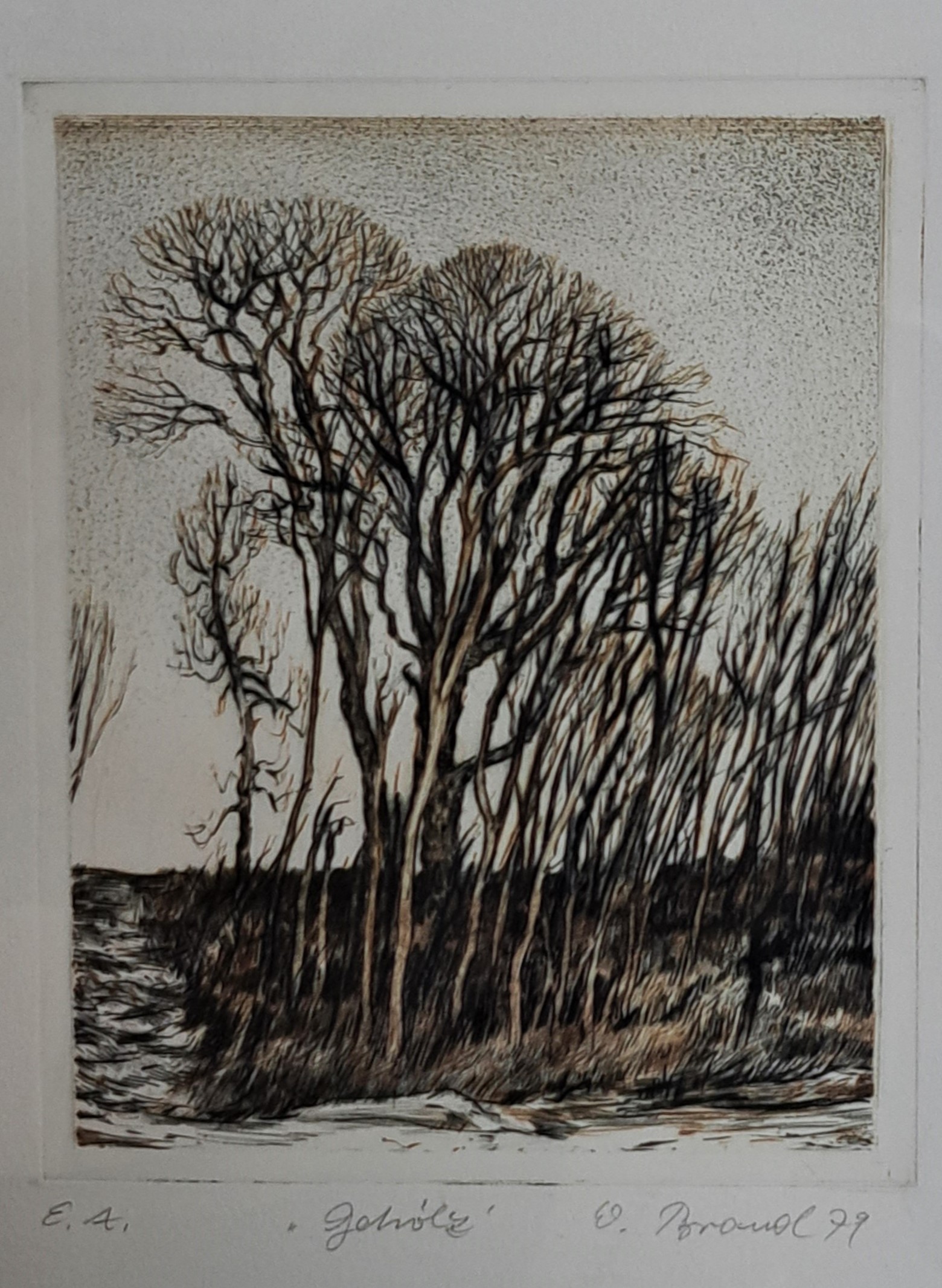 sign. und bez. e.a., ca. 27x19cm, PP, u.Gl., R. ca. 70x50cm; Gehölz, Farbradierung,