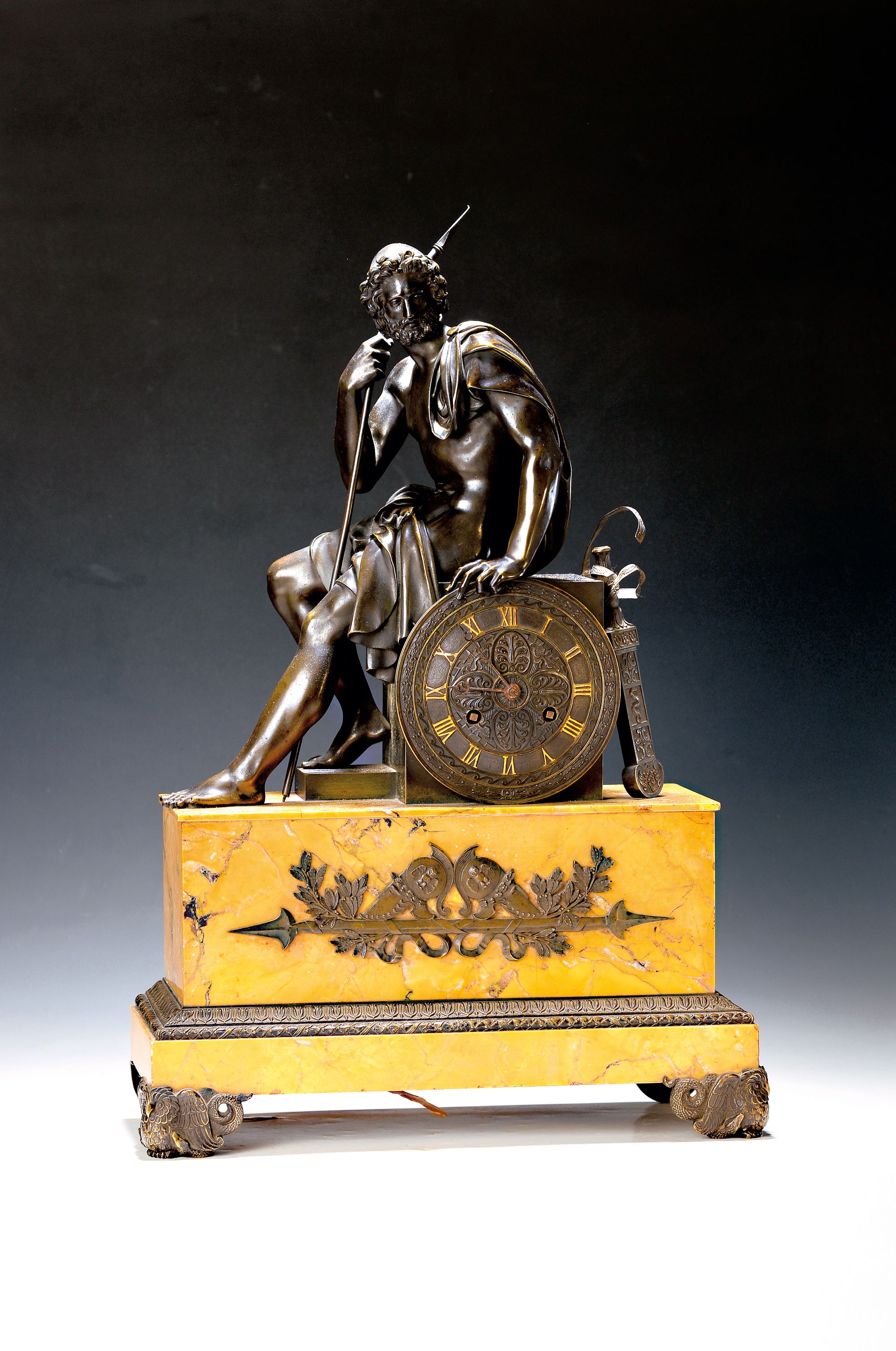 Große Pendule, Frankreich, um 1840/50, gelb -grün geäderter Marmorsockel, verzierte Füße, umlaufender Blattdekor, Applikation mit Speer-und Helmattributen, auf Uhr sitzender vollplastischer Krieger mit Speer, sich stützend auf rundes Schild (auf Zifferblatt), flankiert von Schwert in verzierter Scheide, größeres Pendulenwerk mit Fadenaufhängung des Pendels, Halbstundenschlag auf Glocke (diese fehlt), Schlüssel unpassend, Pendel sek., Gehwerksfeder gerissen bzw. ausgehängt, Schlagwerk läuft nicht an, Höhe ca. 58cm, WZ 4, GZ 2-3