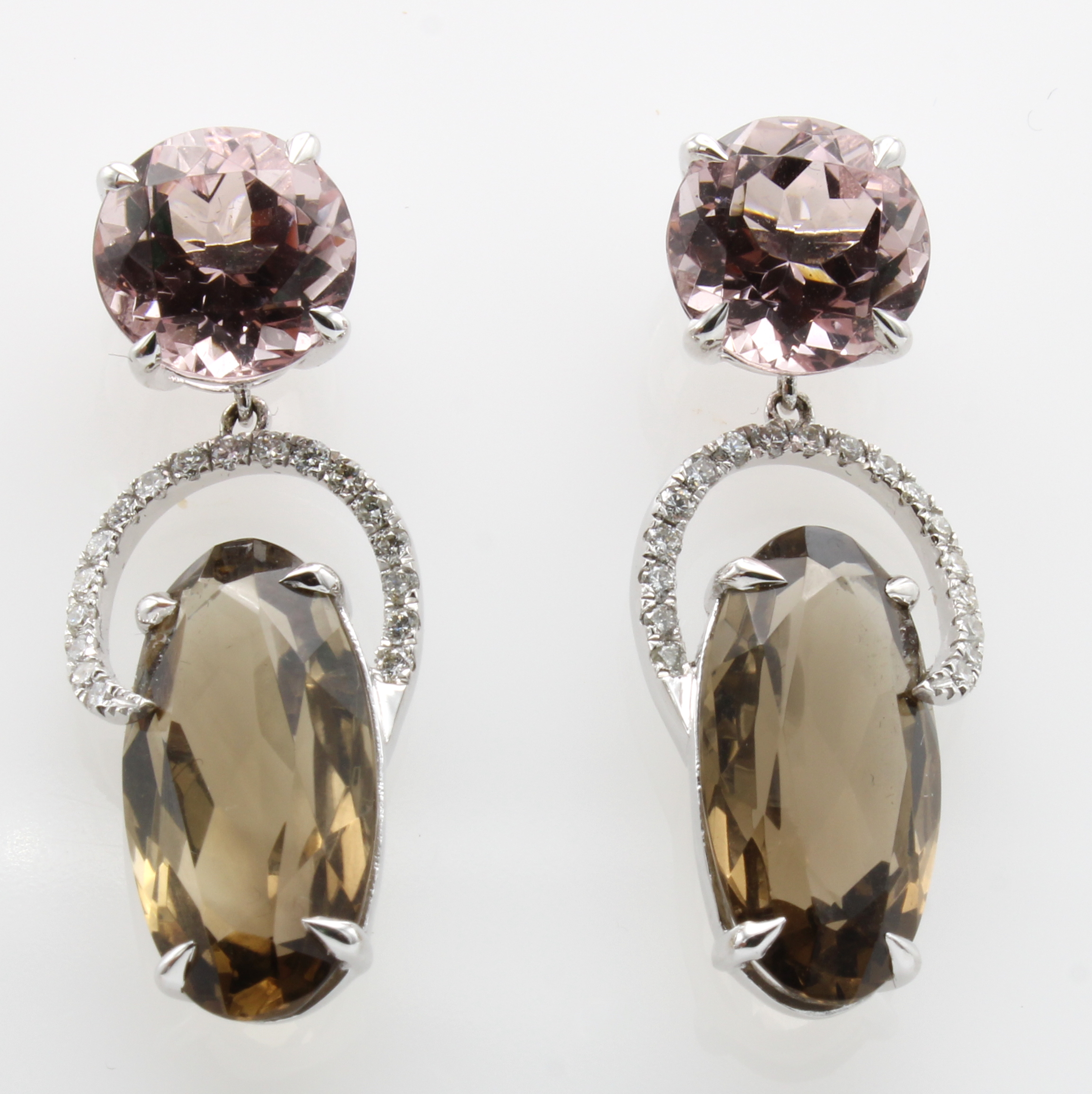 Paar Ohrstecker mit Farbsteinen und Brillanten, WG 750/000, 2 runde Morganite zus. ca. 6.22 ct, 2 ovale Rauchquarze zus. ca. 12.26 ct, 36 Brill. zus. ca. 0.38 ct feines Weiß/vs-si Schätzpreis: 3700, - EUR