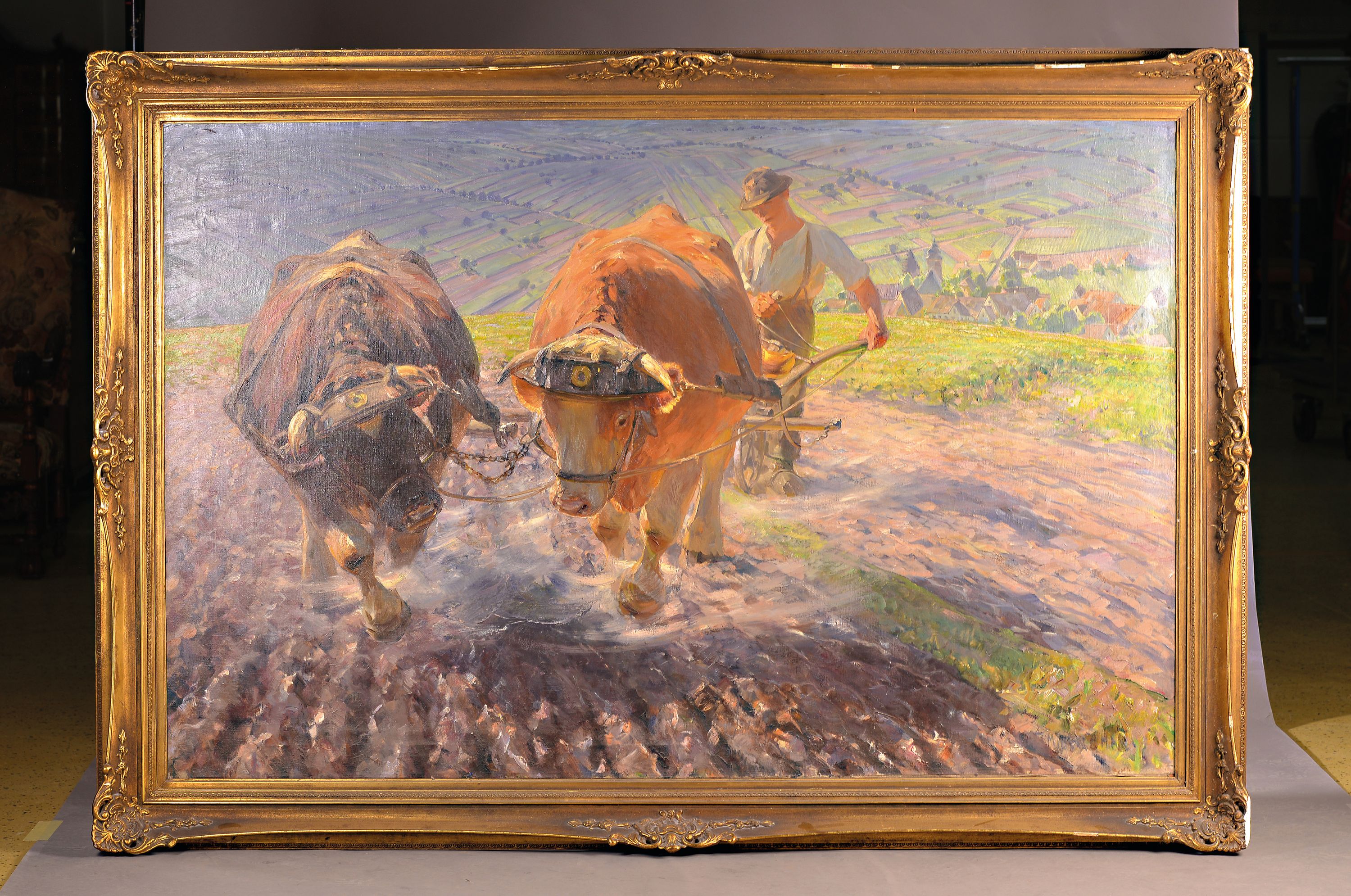 Max Bergmann, 1884 Fürstenberg-1955 Haimhausen, Bauer mit Ochsengespann beim Pflügen, Öl/Lwd, rechts unten signiert, ca. 130x200cm, Barockstilrahmen, dieser leicht besch., großes repräsentatives Werk des bekannten späte impressionistischen Tiermalersund Meisterschüler Heinrich von Zügels