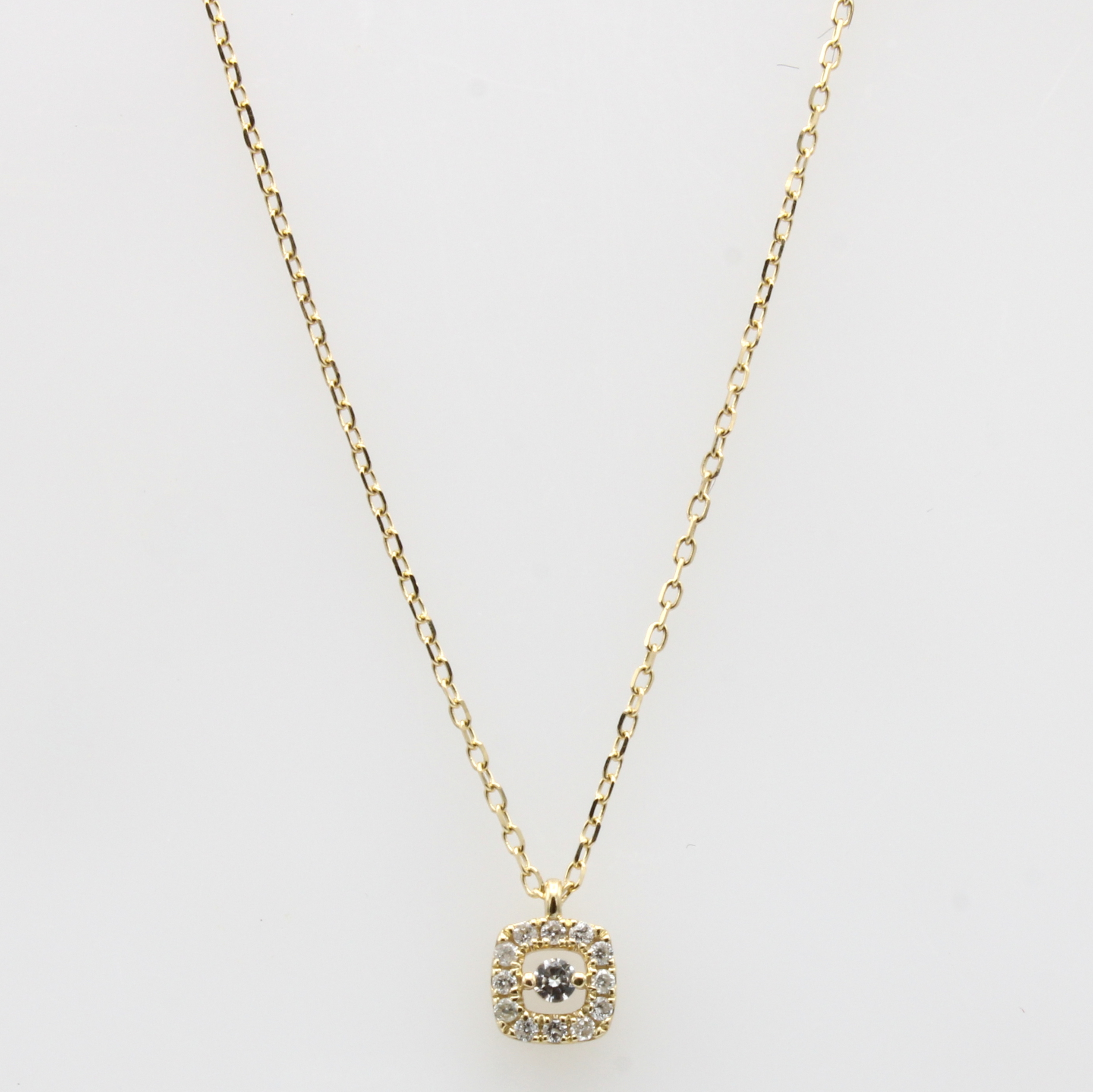 Anhänger mit Brillanten an Kette, GG 585/000, Solitär u. Besatzbrill. zus. ca. 0.09 ct feines Weiß/vs-si, Carréeform, in L. ca. 42 u. 45 cm zu tragen Schätzpreis: 780, - EUR