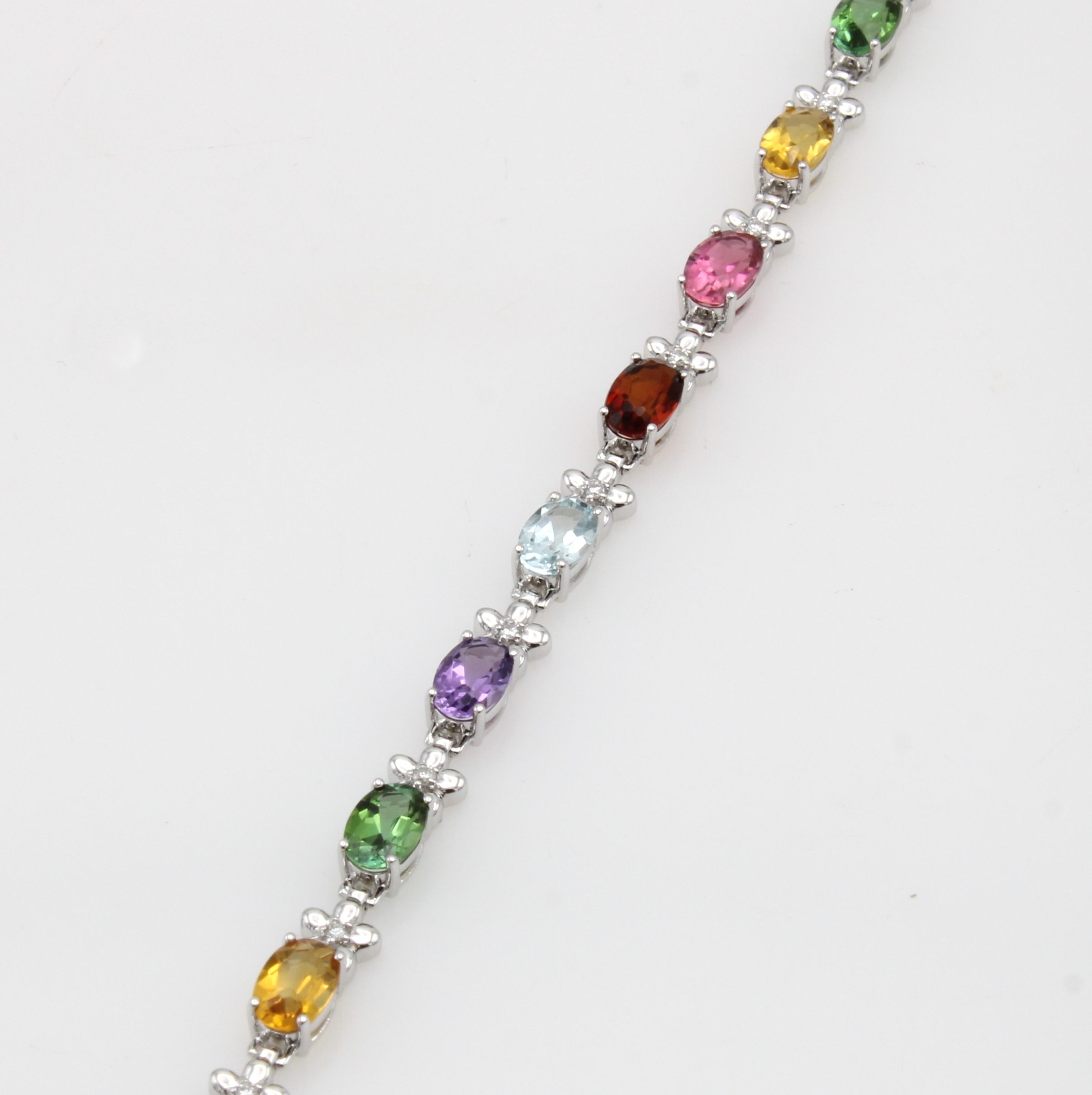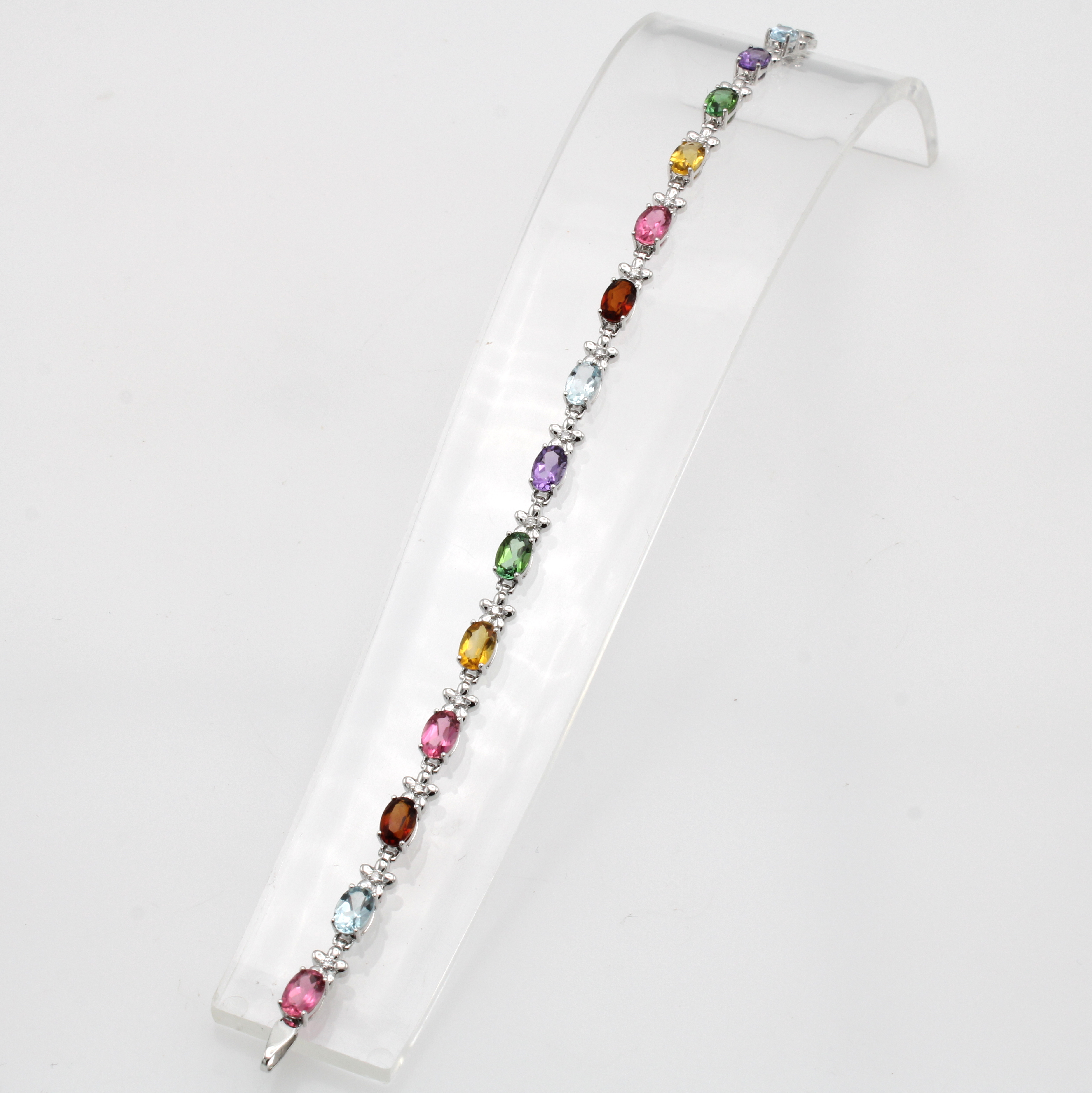 Armband mit Farbsteinen und Brillanten, WG 585/000, Turmaline, Aquam., Citrine und Amethyste zus. ca. 6.35 ct, Brill. zus. ca. 0.12 ct feines Weiß/vs, L. ca. 18 cm Schätzpreis: 2950, - EUR