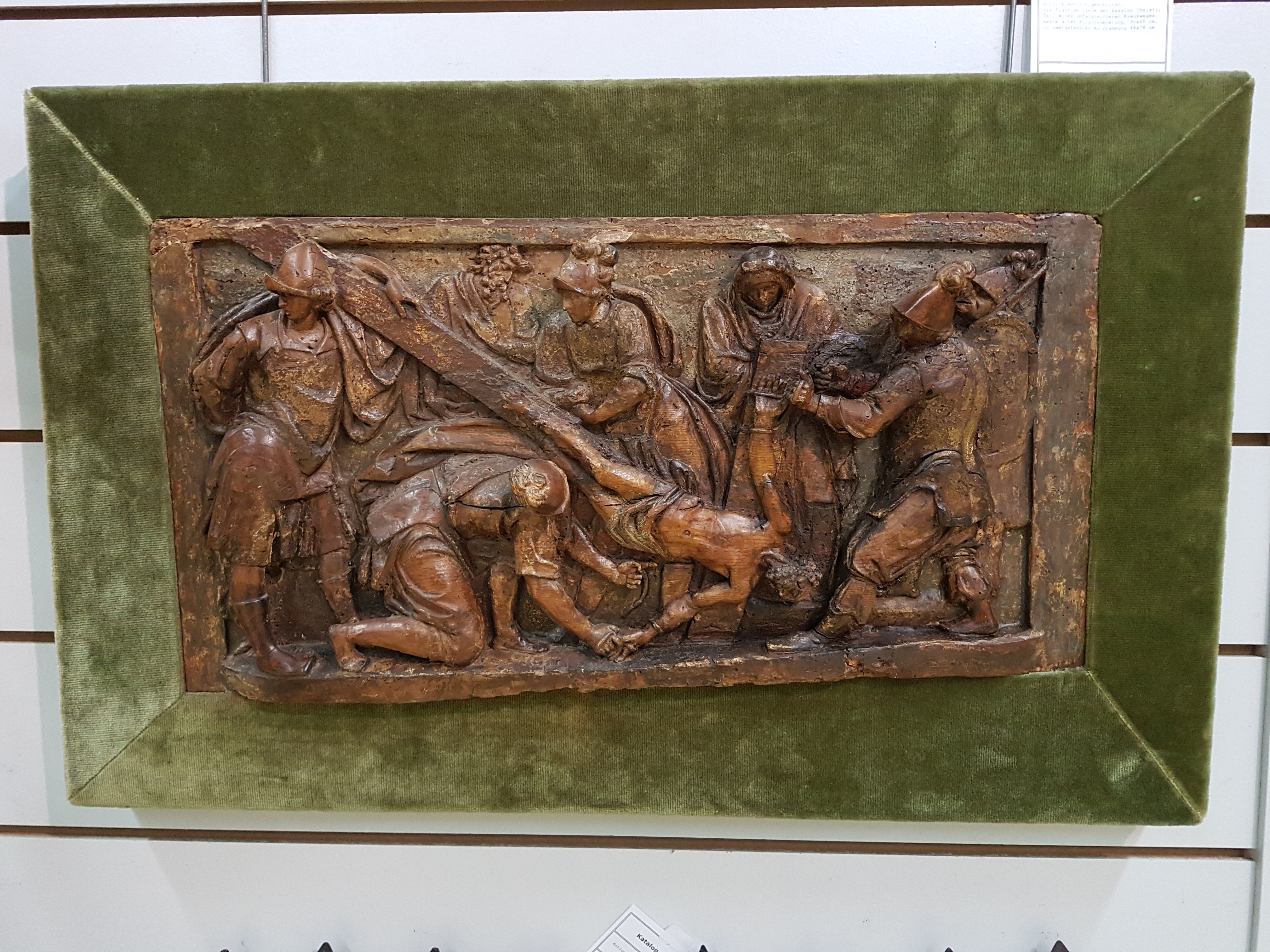 Bildschnitzerei, Jesus wird ans Kreuz genagelt, wohl Italien, 17./18.Jh., Holz, plastisch