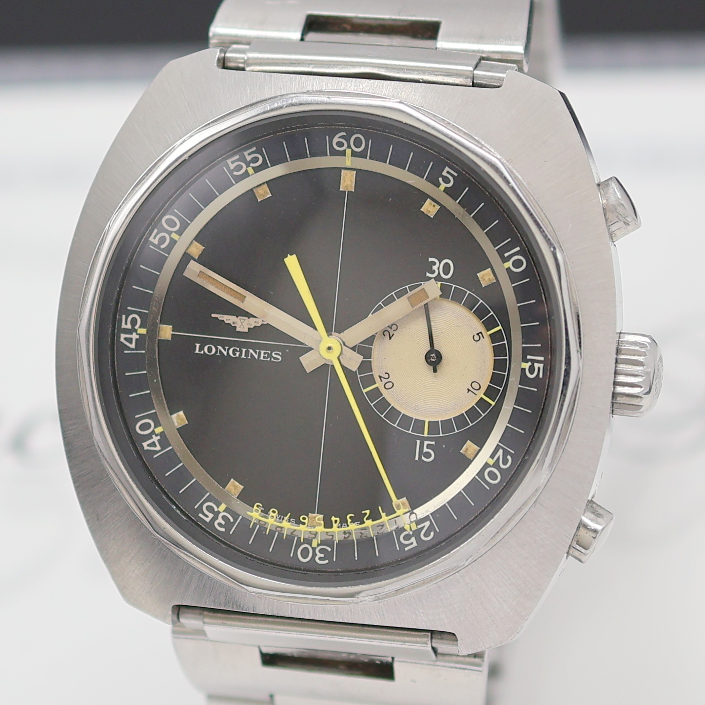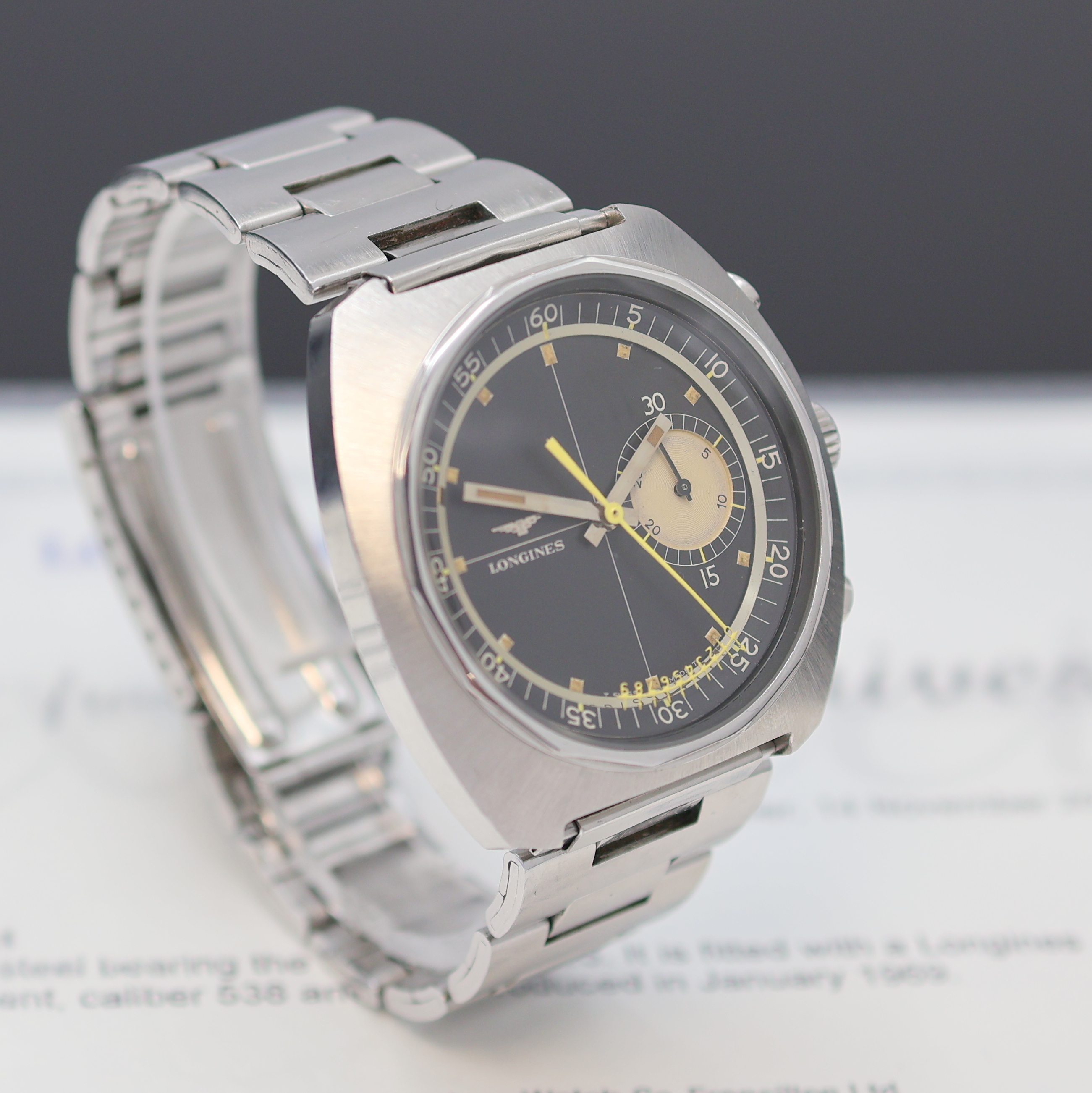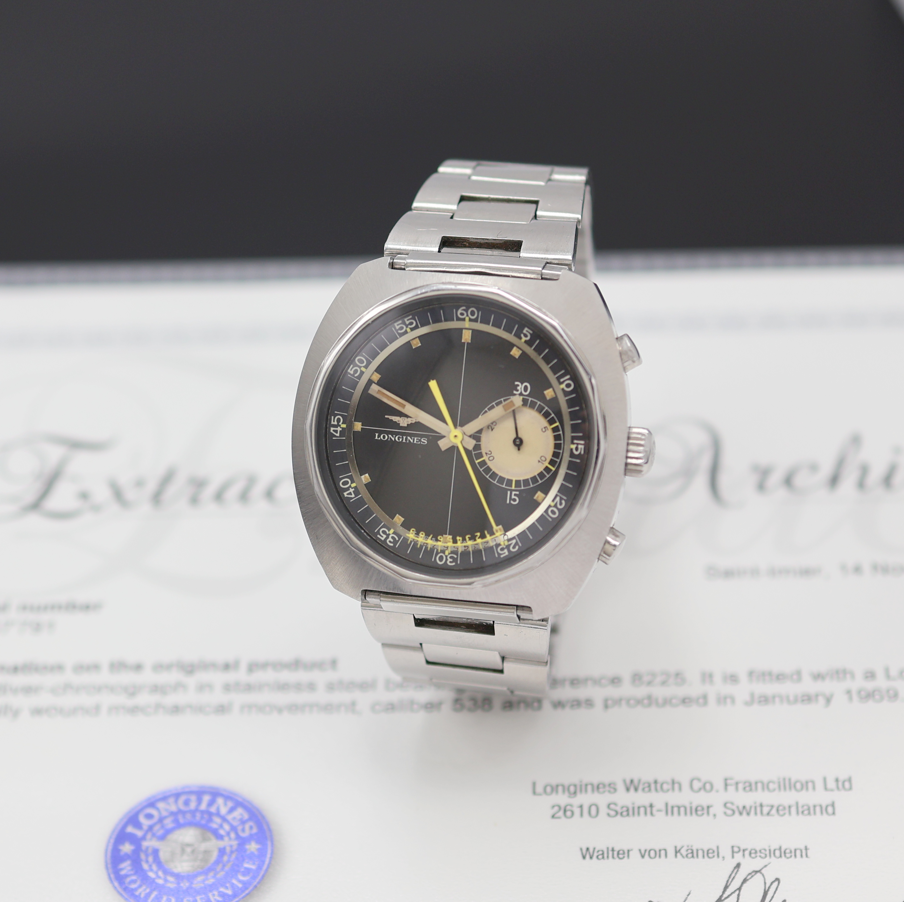 LONGINES Taucher-Chronograph Kaliber 538 mit Flyback in Stahl Referenz 8225, Schweiz lt. beil. Stammbuchauszug 1969 gefertigt, großes verschr. Geh., orig. Gliederband m. Faltschl., orig. Drücker u. Krone, schwarz. Fadenkreuz- Zifferbl., Leuchtindizes u. Zeiger, 30-Min- Zähler b. 3, gelber Nonius-Zeiger f. zentr. Stoppsek., rhod. Werk Kal. 538(30CH), kantenpol. Kadratur, Gluc.-Unruh m. Breg.- Spir., 18 Steine, D. ca. 43 mm, L. ca. 20 cm, EZ 2, aus Sammlungsauflösung