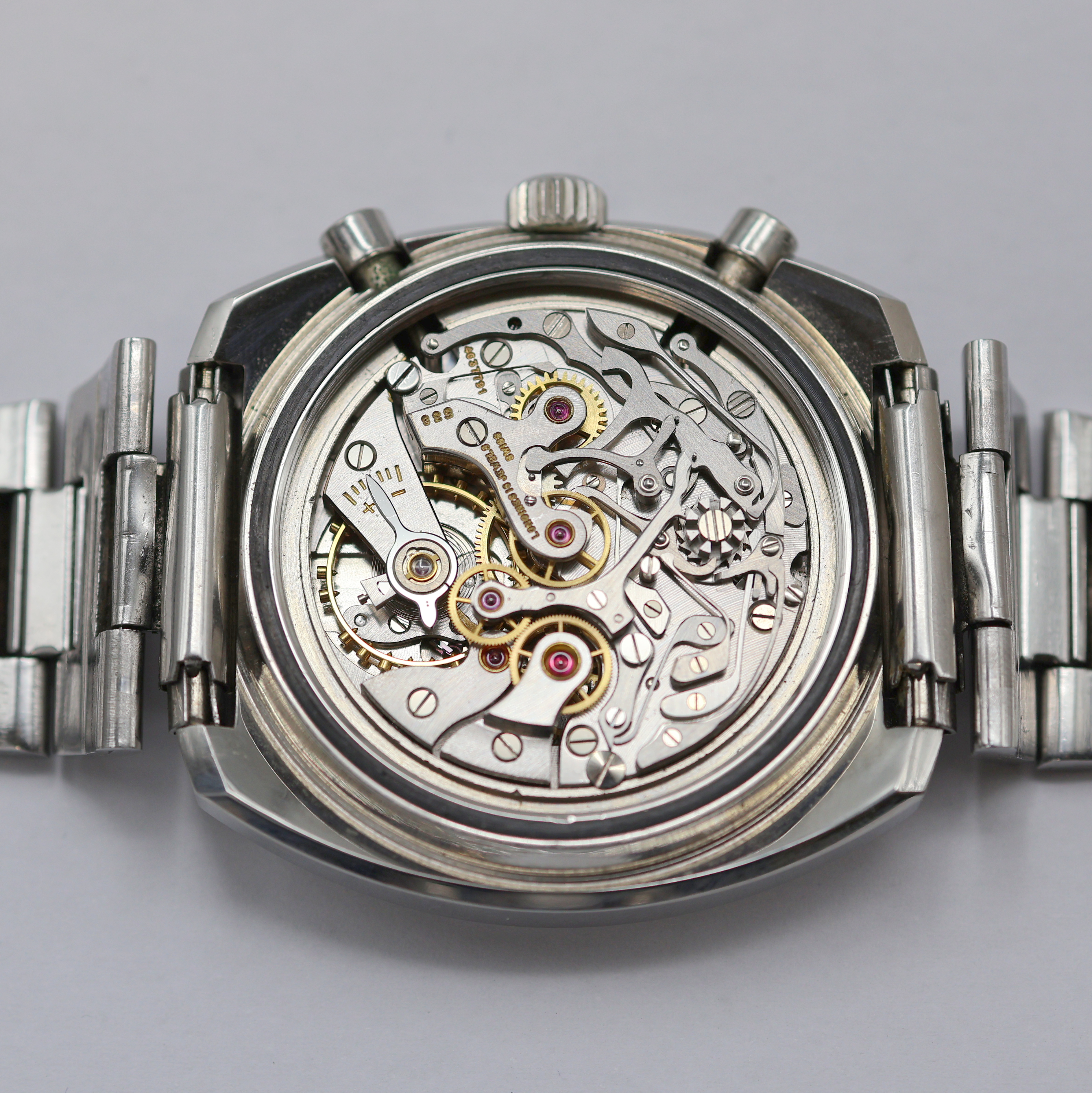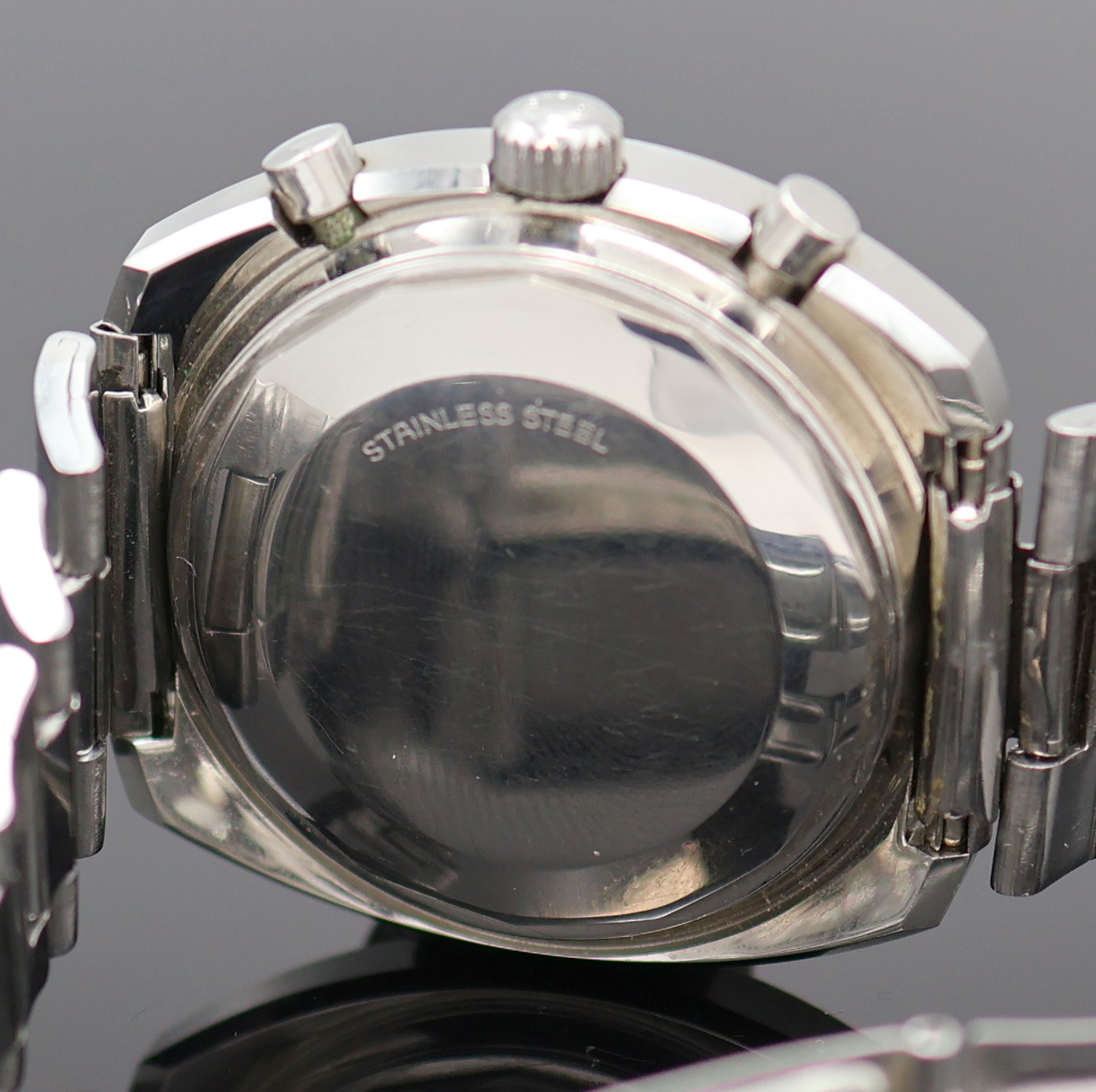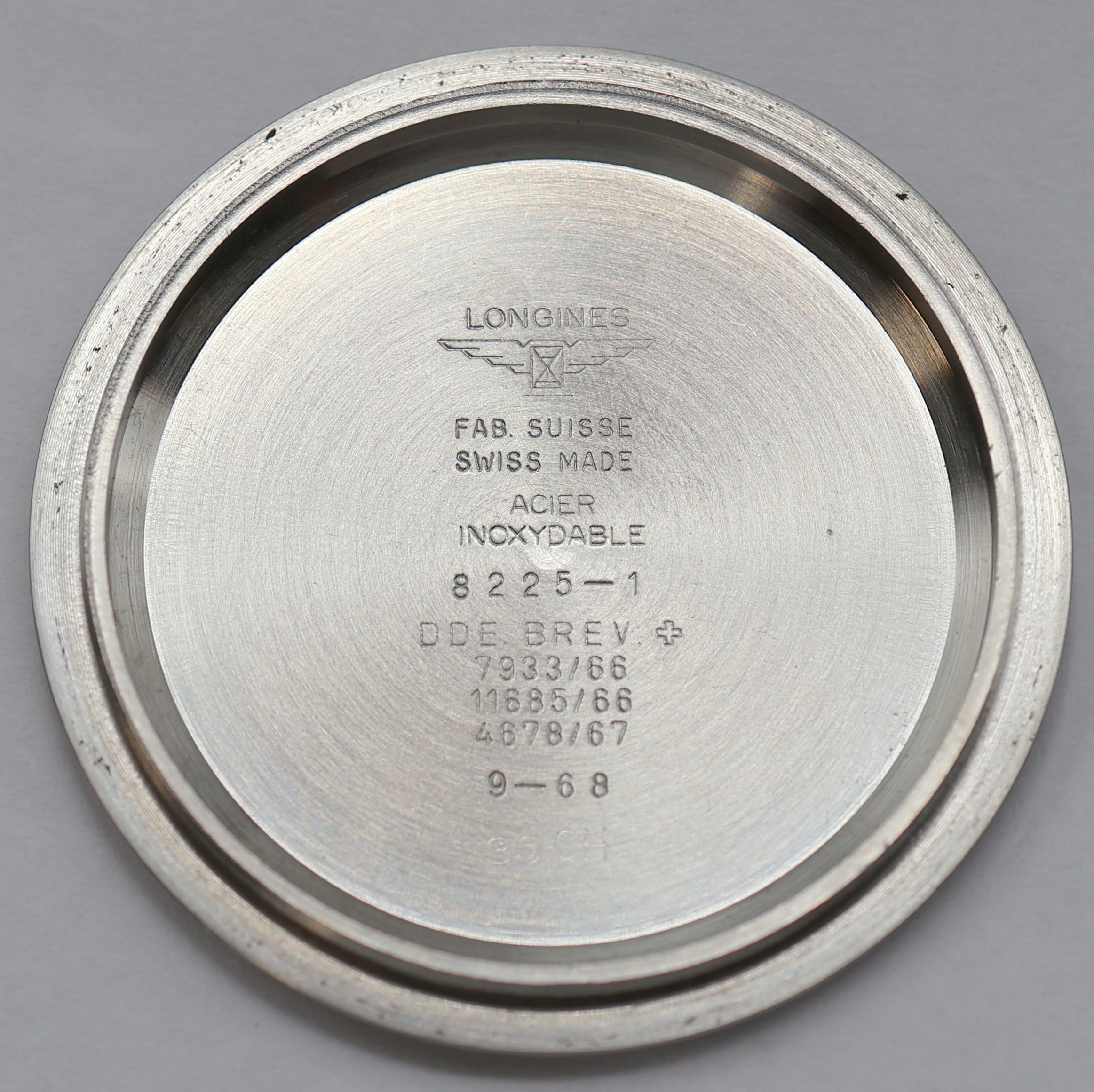 LONGINES Taucher-Chronograph Kaliber 538 mit Flyback in Stahl Referenz 8225, Schweiz lt. beil. Stammbuchauszug 1969 gefertigt, großes verschr. Geh., orig. Gliederband m. Faltschl., orig. Drücker u. Krone, schwarz. Fadenkreuz- Zifferbl., Leuchtindizes u. Zeiger, 30-Min- Zähler b. 3, gelber Nonius-Zeiger f. zentr. Stoppsek., rhod. Werk Kal. 538(30CH), kantenpol. Kadratur, Gluc.-Unruh m. Breg.- Spir., 18 Steine, D. ca. 43 mm, L. ca. 20 cm, EZ 2, aus Sammlungsauflösung